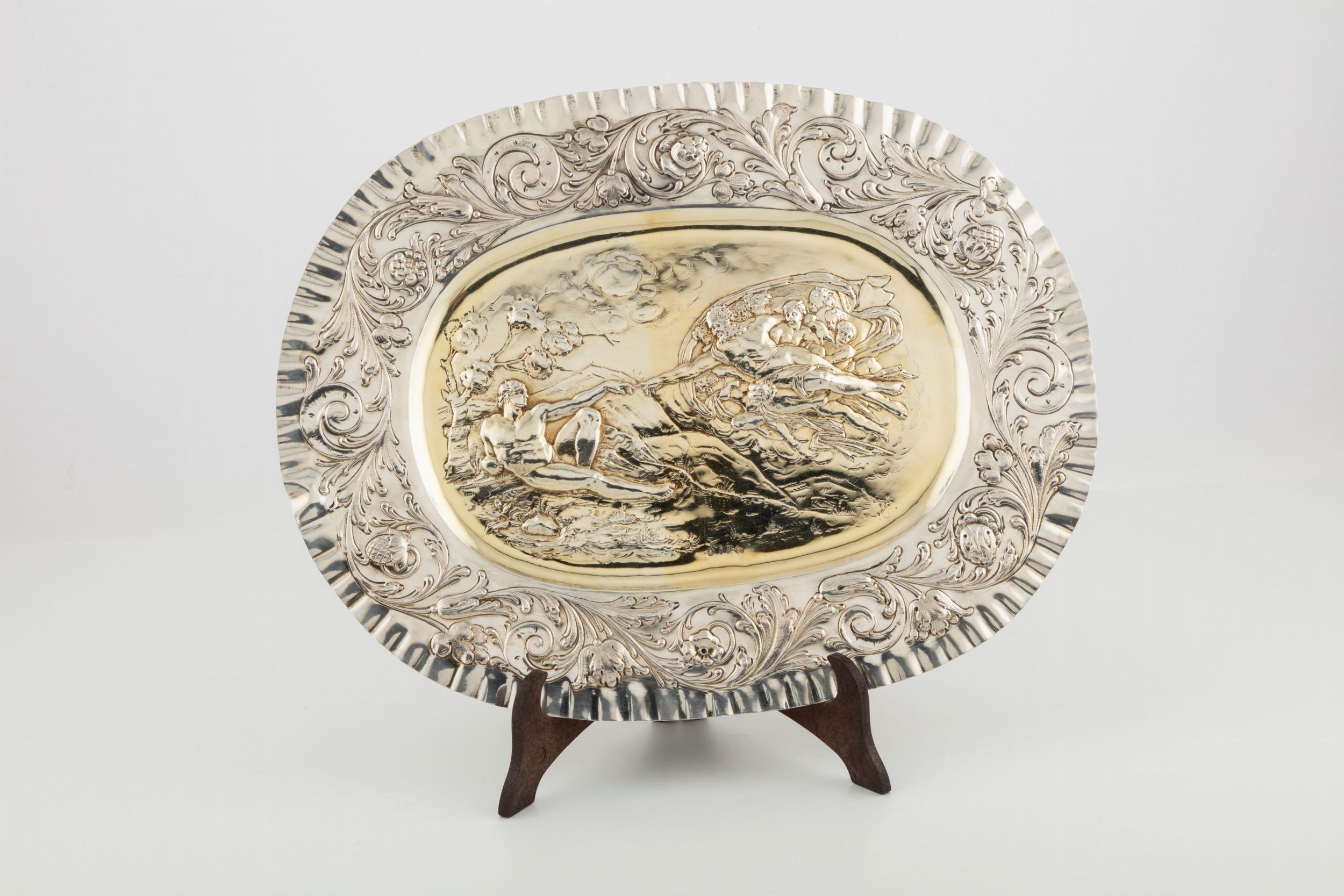 Germania, secolo XIX finemente sbalzato con 'La creazione di Adamo' di Michelangelo, il bordo decorato con motivi floreali e fogliacei.