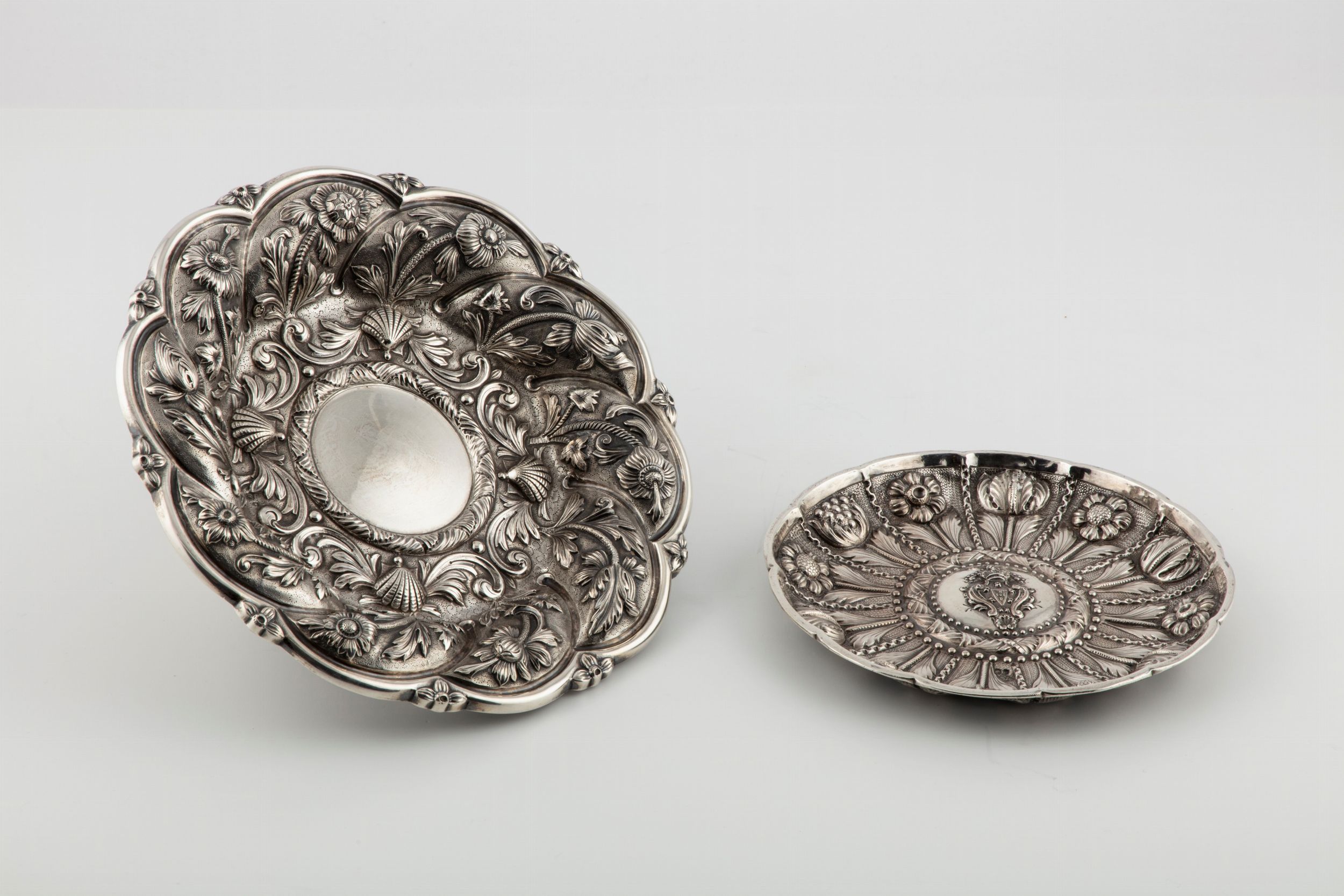 in argento 833, Peso g 596,00 Portogallo, secolo XX il piatto sbalzato e cesellato con riserve a motive floreali, centrato da stemma araldico del Portogallo (d cm 19,00) ; l'alzatina finemente cesellata e sbalzata a motivi floreali, conchiglie e volute (l cm 24,00).