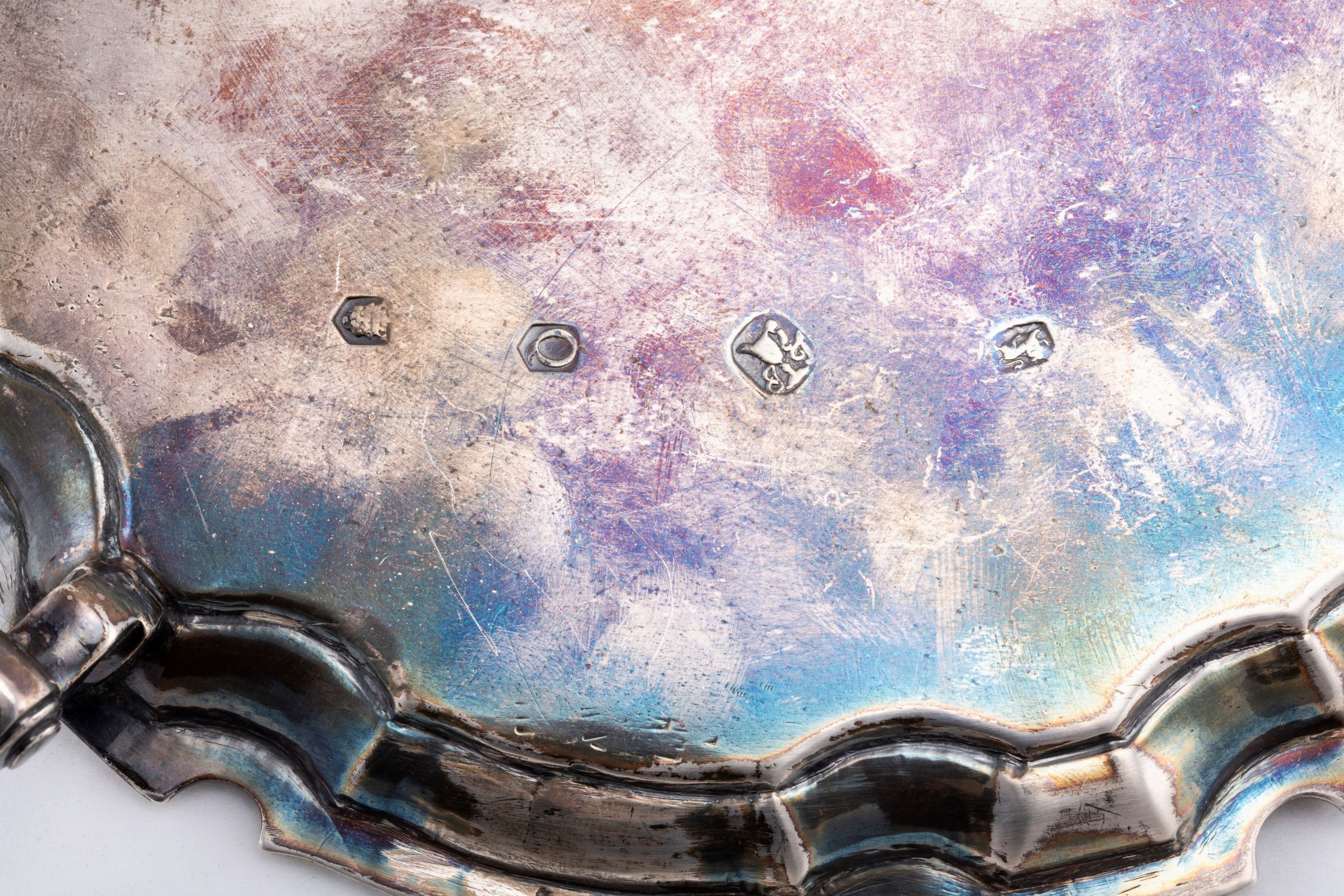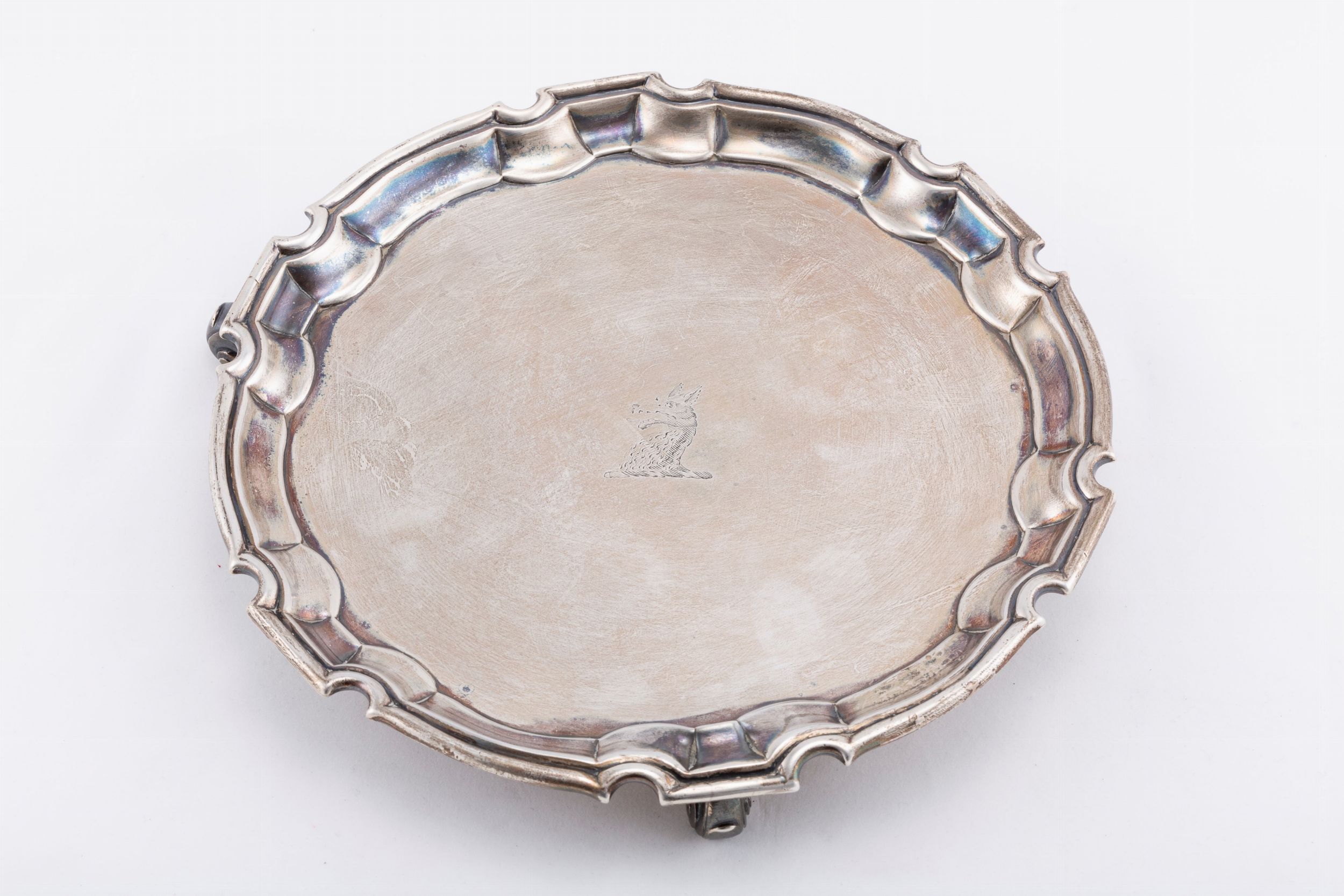 Londra, 1731 Argentiere JT (John Tuite?),  di forma circolare, bordo misitlineo, inciso al centro con figura zoomorfa, si erge su tre piedini a volute.