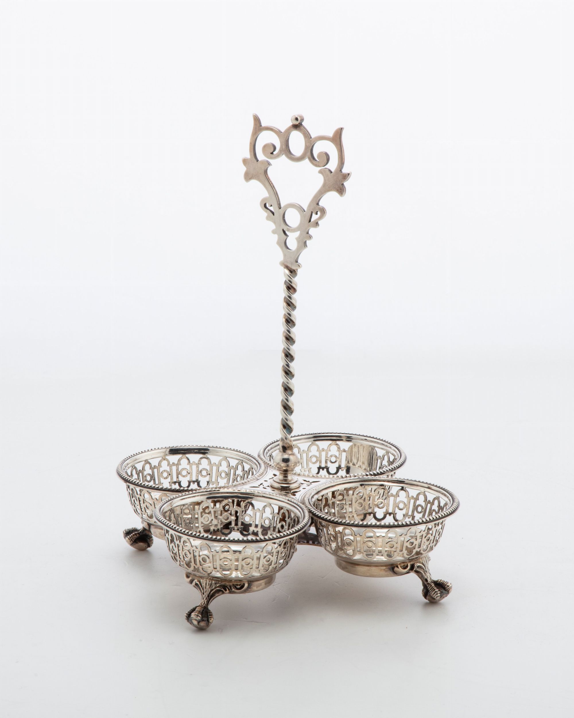 Città di Sheffield, 1859 Argentiere MH&Co (Martin Hall & Co?),  poggiante su quattro piedini ad artiglio, comprensivo di quattro ciotoline dal corpo traforato.