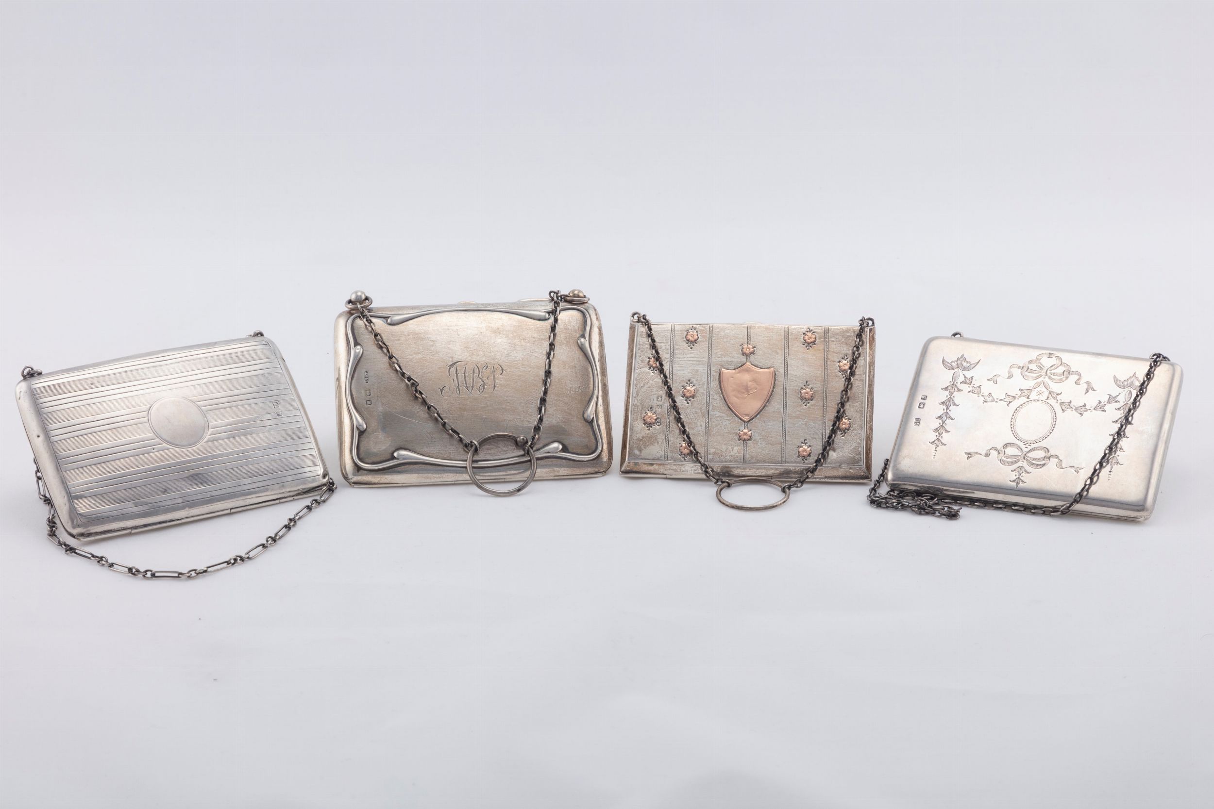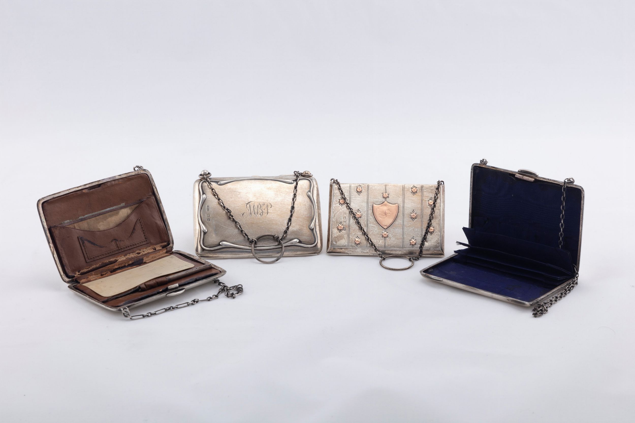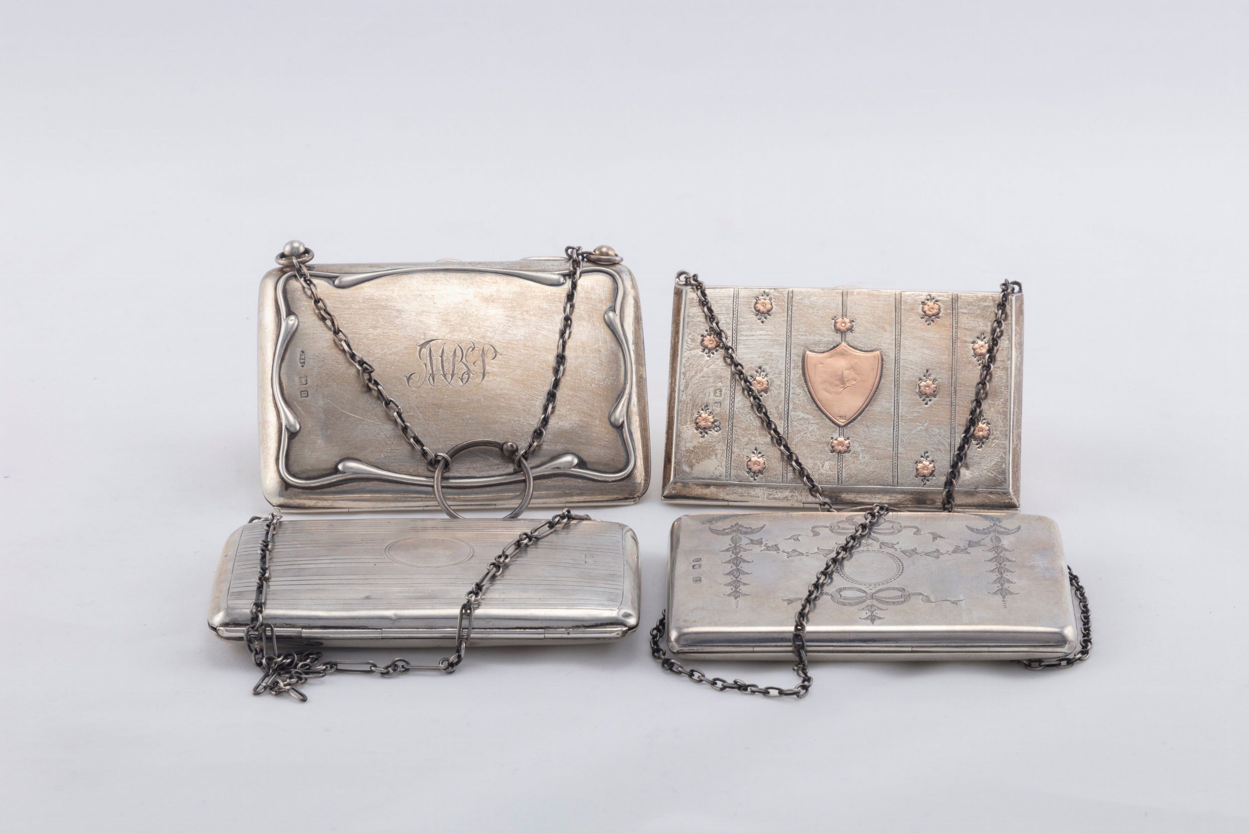 Birmingham, secolo XX di forma rettangolare, uno inciso a decori floreali e nastri (l cm 10,00), uno zigrinato a fasce (l cm 10,50), uno sbalzato a cornice e centrato da monogramma (l cm 10), uno decorato con fiori e stemma (l cm 9,50), difetti.