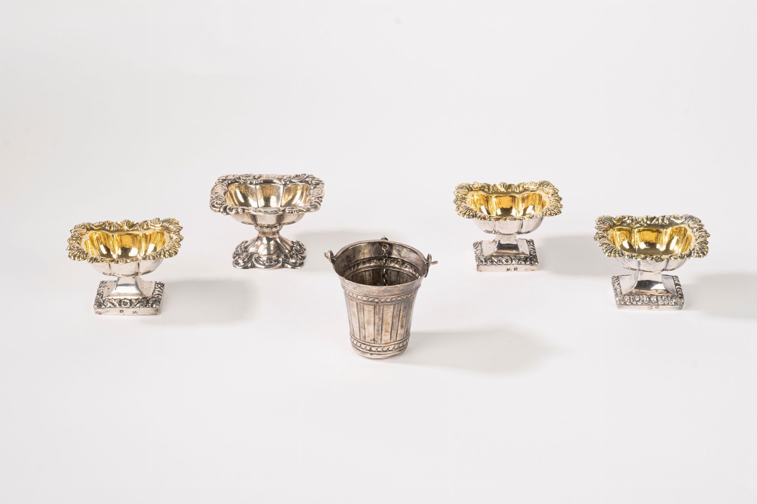 Regno delle due Sicilie, Napoli, 1832-1872 le saliere sbalzate a motivi floreali, tre con interno in vermeil, il cestino inciso.