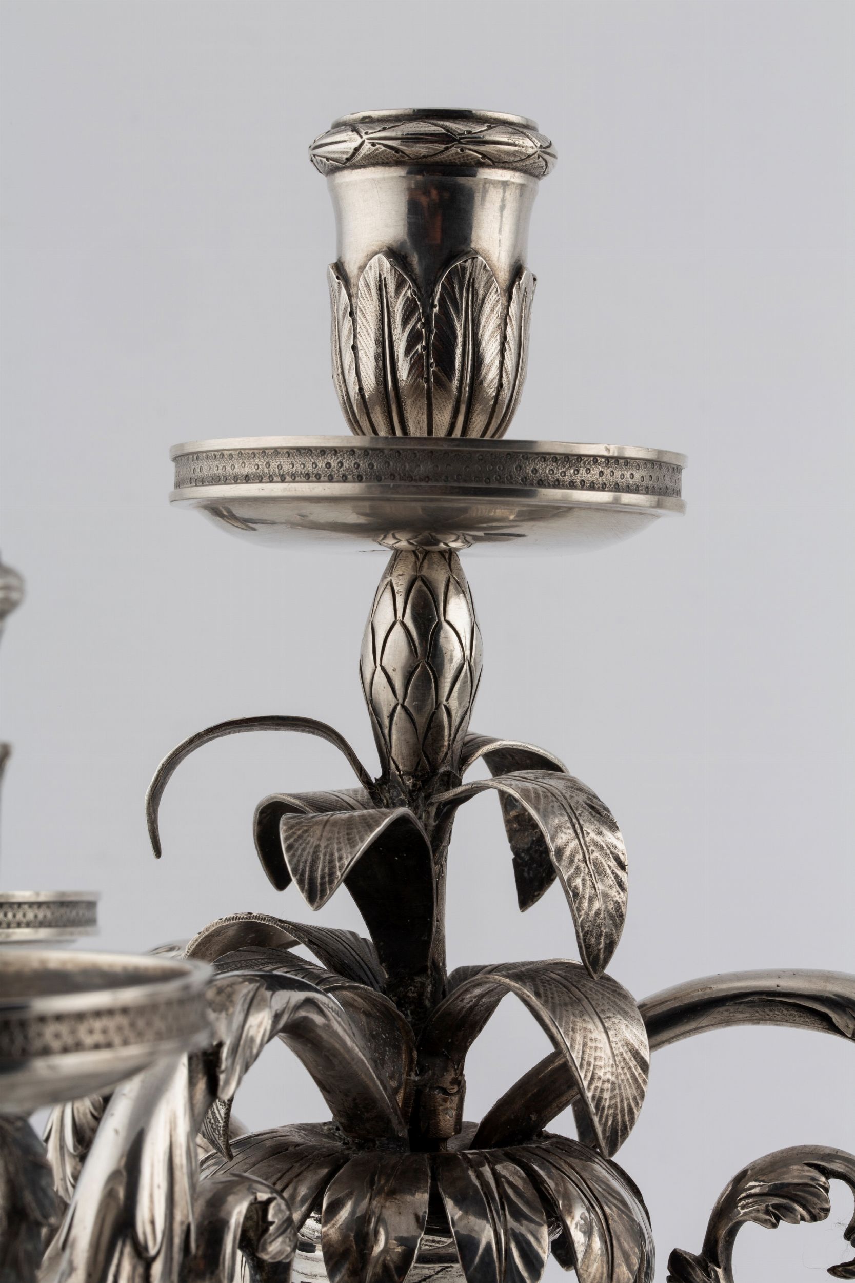 Genova, secolo XVIII/XIX punzoni della Torretta consunti, ripunzonati con delfino e croce mauriziana, a quattro fiamme, base circolare con bordo sbalzato a motivi fogliacei, fusto troncoconico rastremato terminante in vaso neoclassico da cui dipartono quattro bracci sagomati e cesellati a decori fogliacei, difetti.