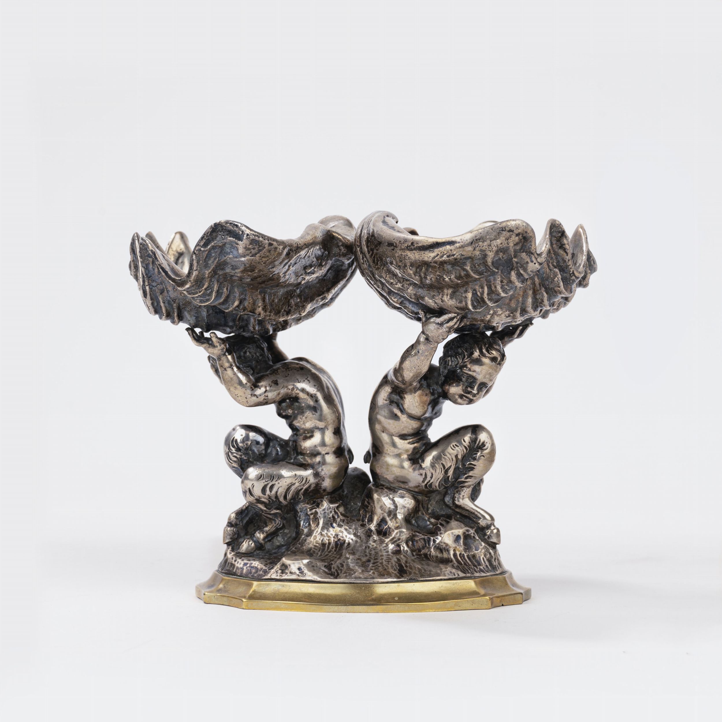 Italia, secolo XX con sculture di due satiri che sorreggono due vaschette a conchiglia, su base in ottone.