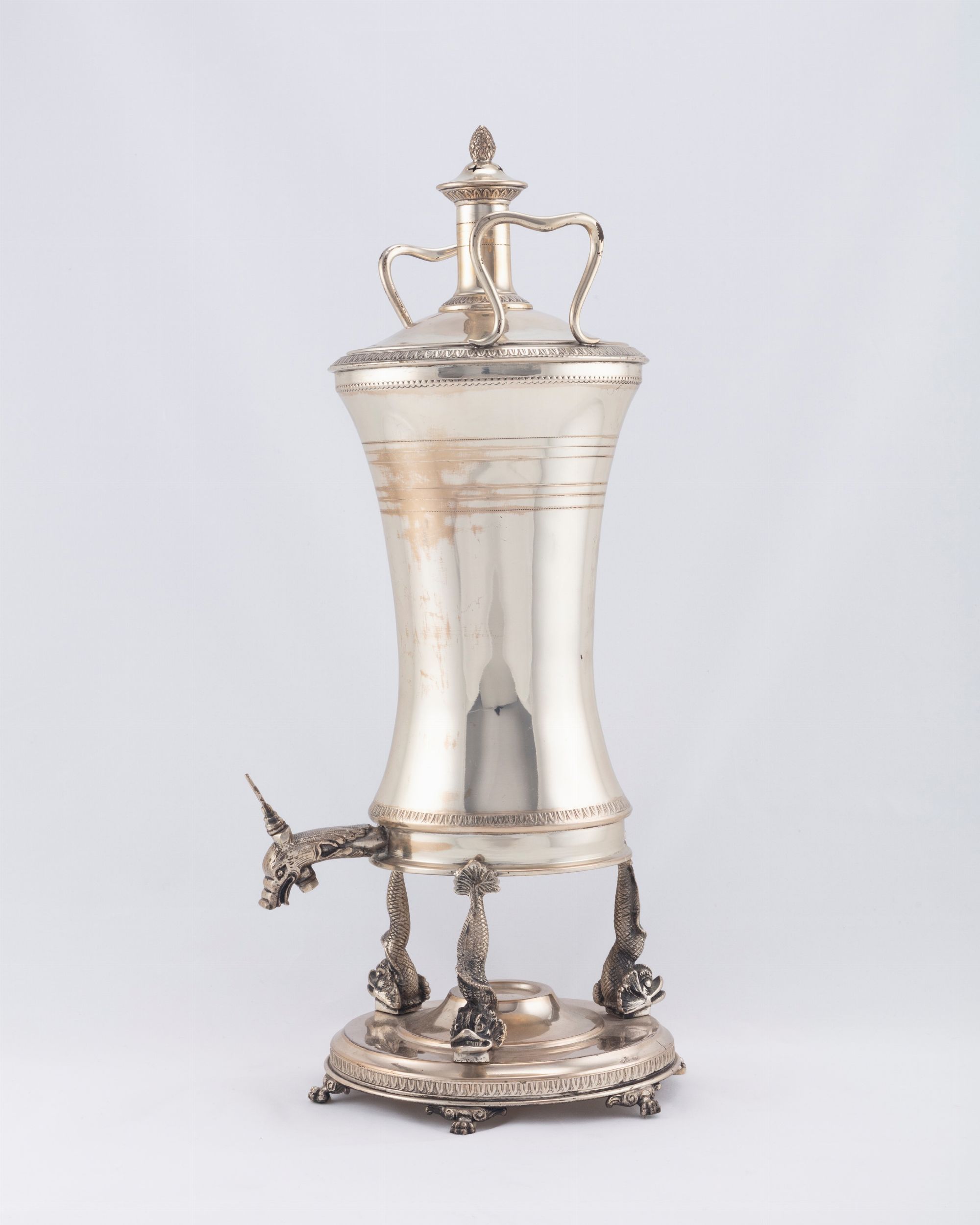 in argento, Peso kg 1,712 h cm 47,00 Italia, secolo XX base circolare decorata a palmette poggiante su sei piedini ferini, montanti a tutto tondo raffiguranti mostri marini che sorreggono il corpo liscio biansato con versatoio zoomorfo, il coperchio con presa a pigna, lievi difetti (mancante di stoppiniera).