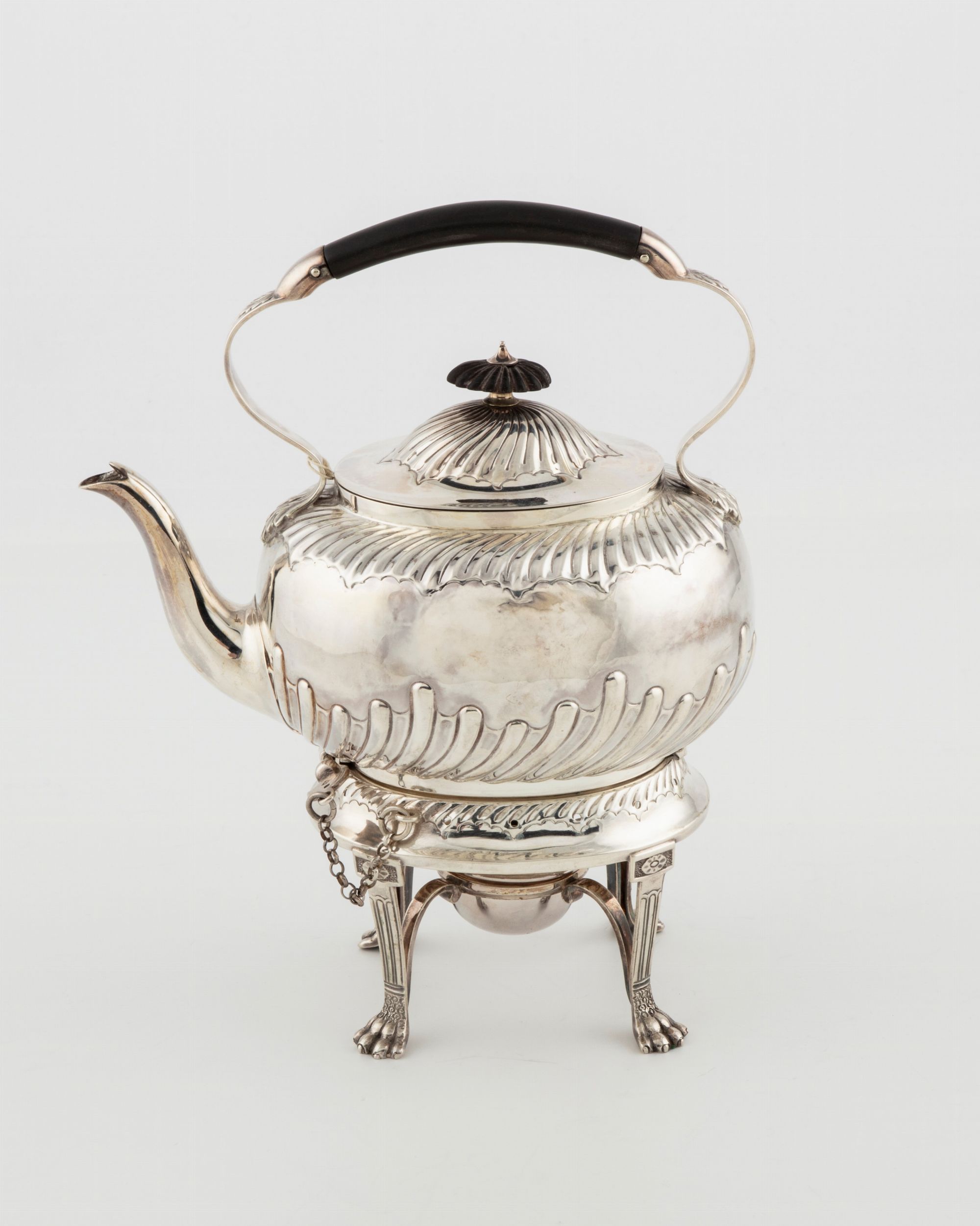 Londra, 1886 Argentiere RMEH (Martin, Hall & Co Ltd?),  poggiante su quattro piedini ferini, corpo e coperchio baccellati, presa del manico e del coperchio in legno.