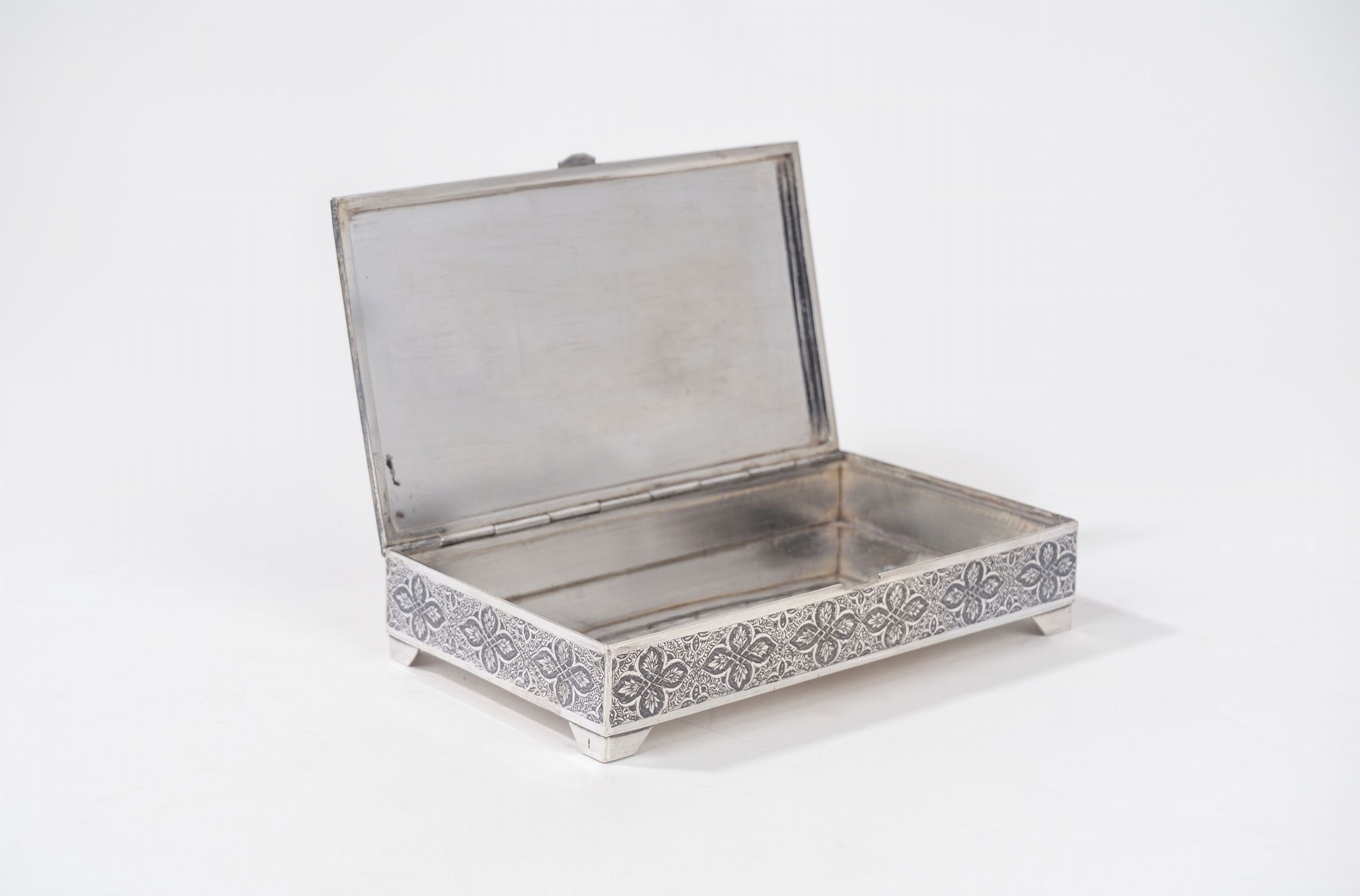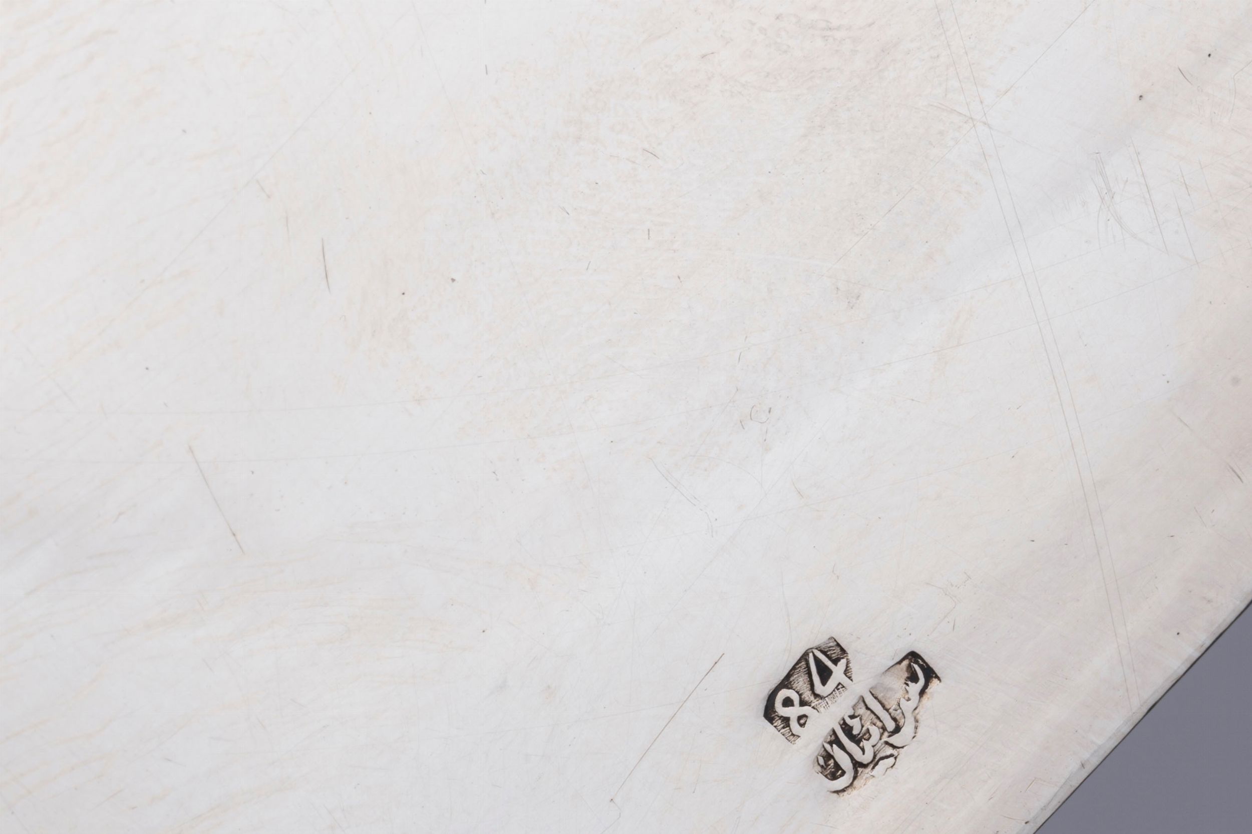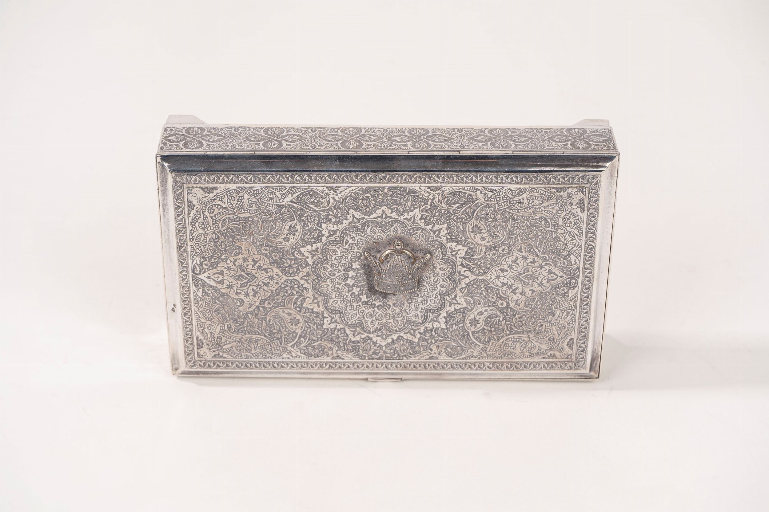 Iran, inizio secolo XX con marchio Zolotnik 84, di forma rettangolare, finemente incisa con decoro ad arabeschi, con corona al centro, entro astuccio.