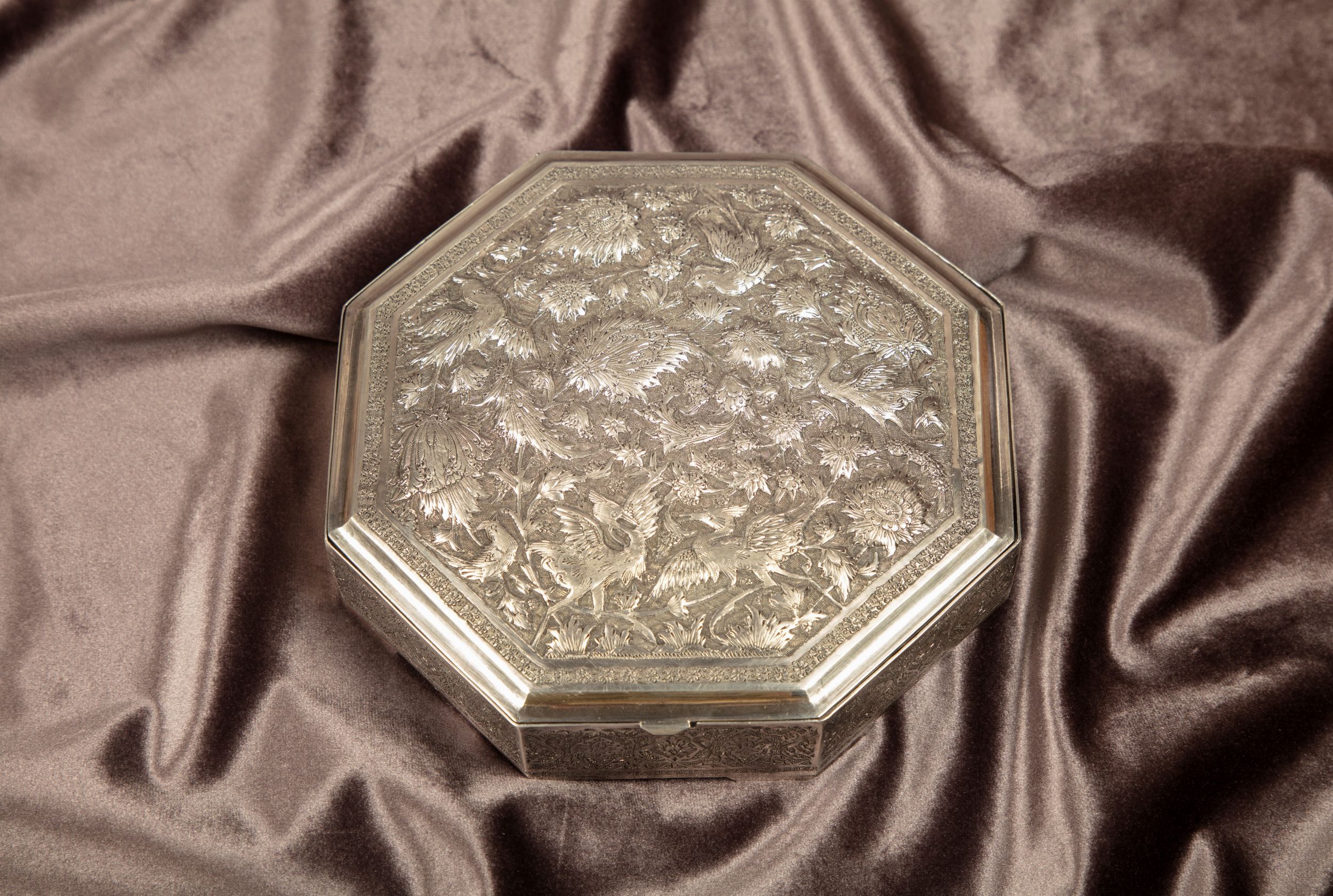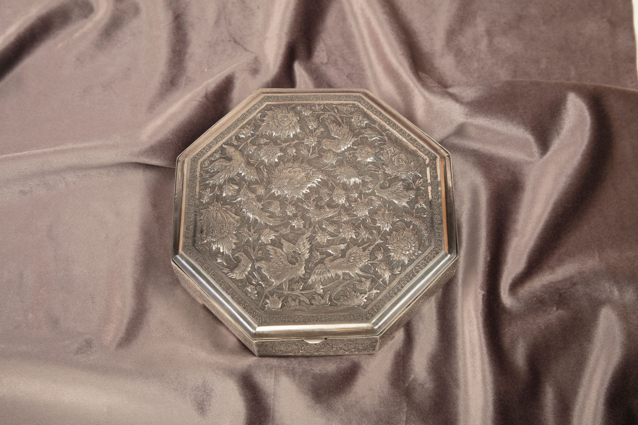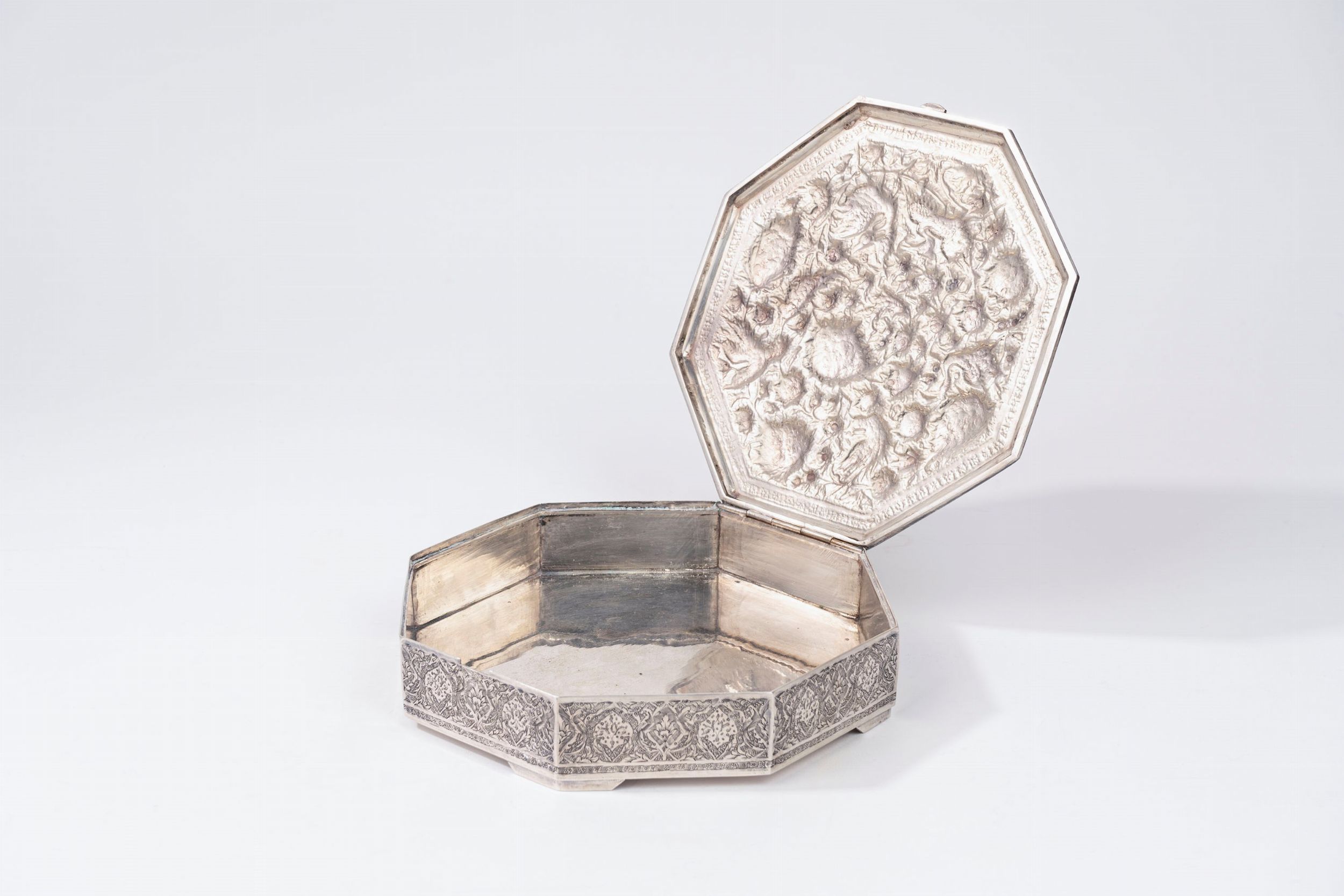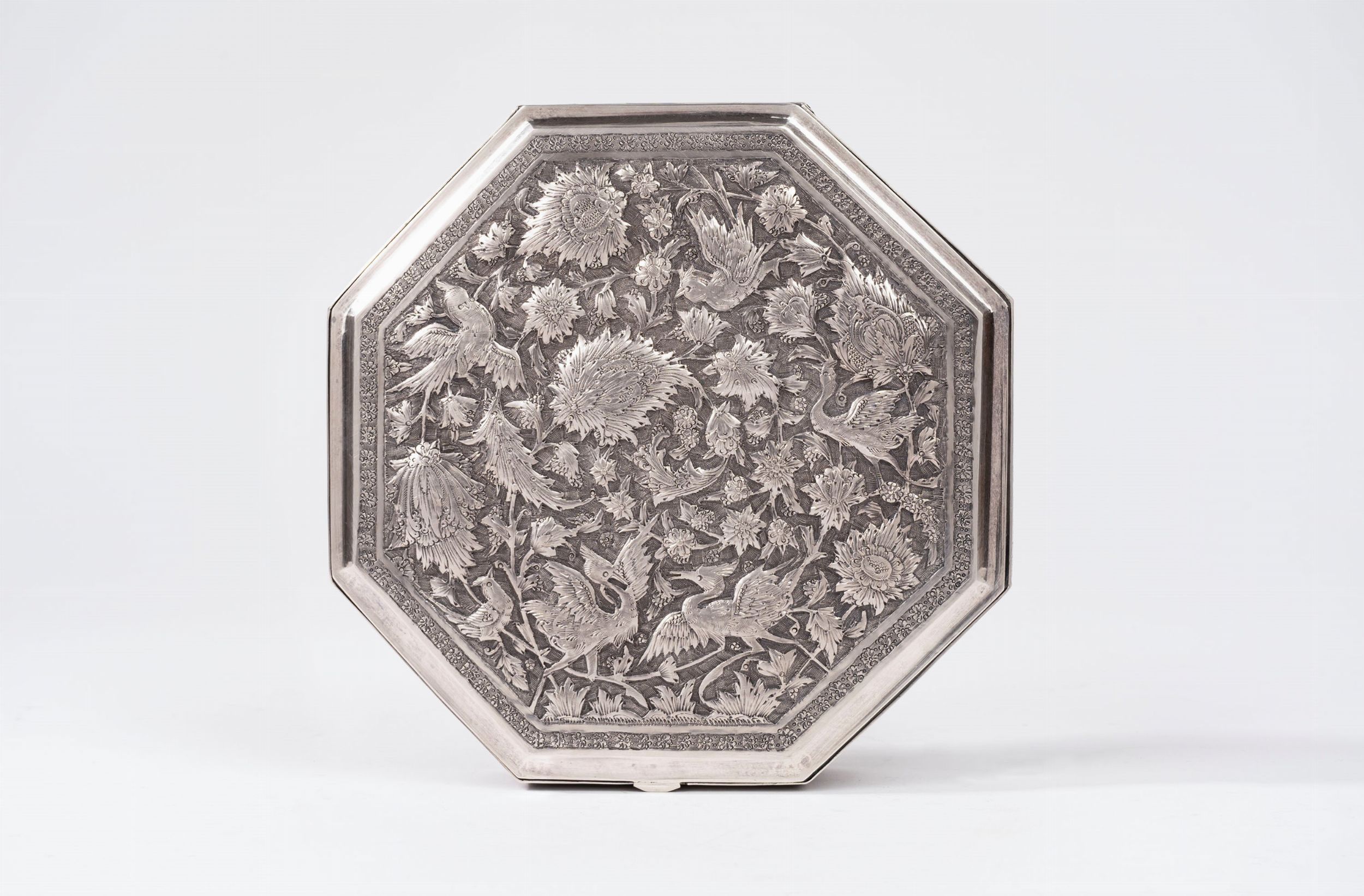 Iran, secolo XX di forma ottagonale, decorata sul coperchio a motivi orientali e zoomorfi.