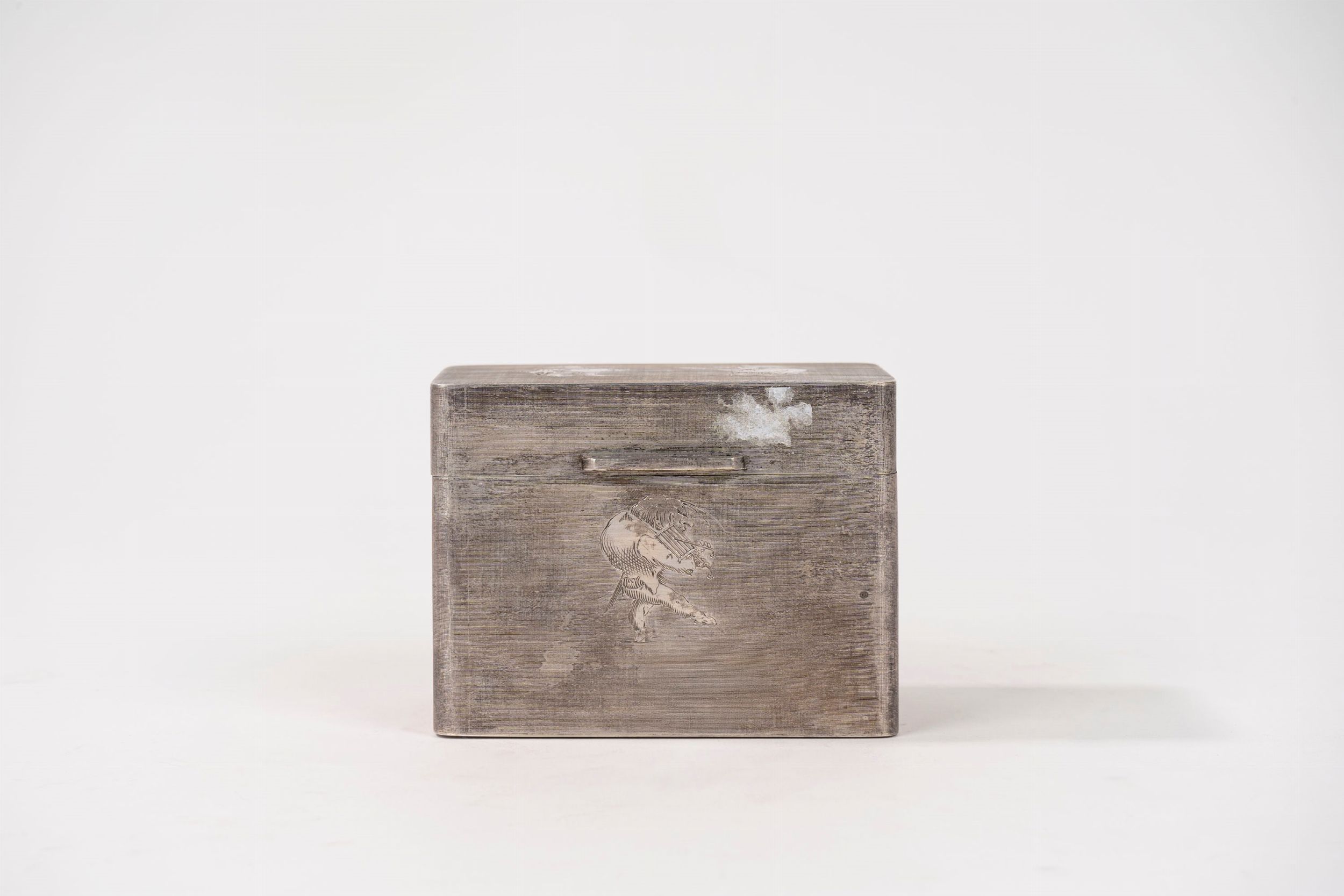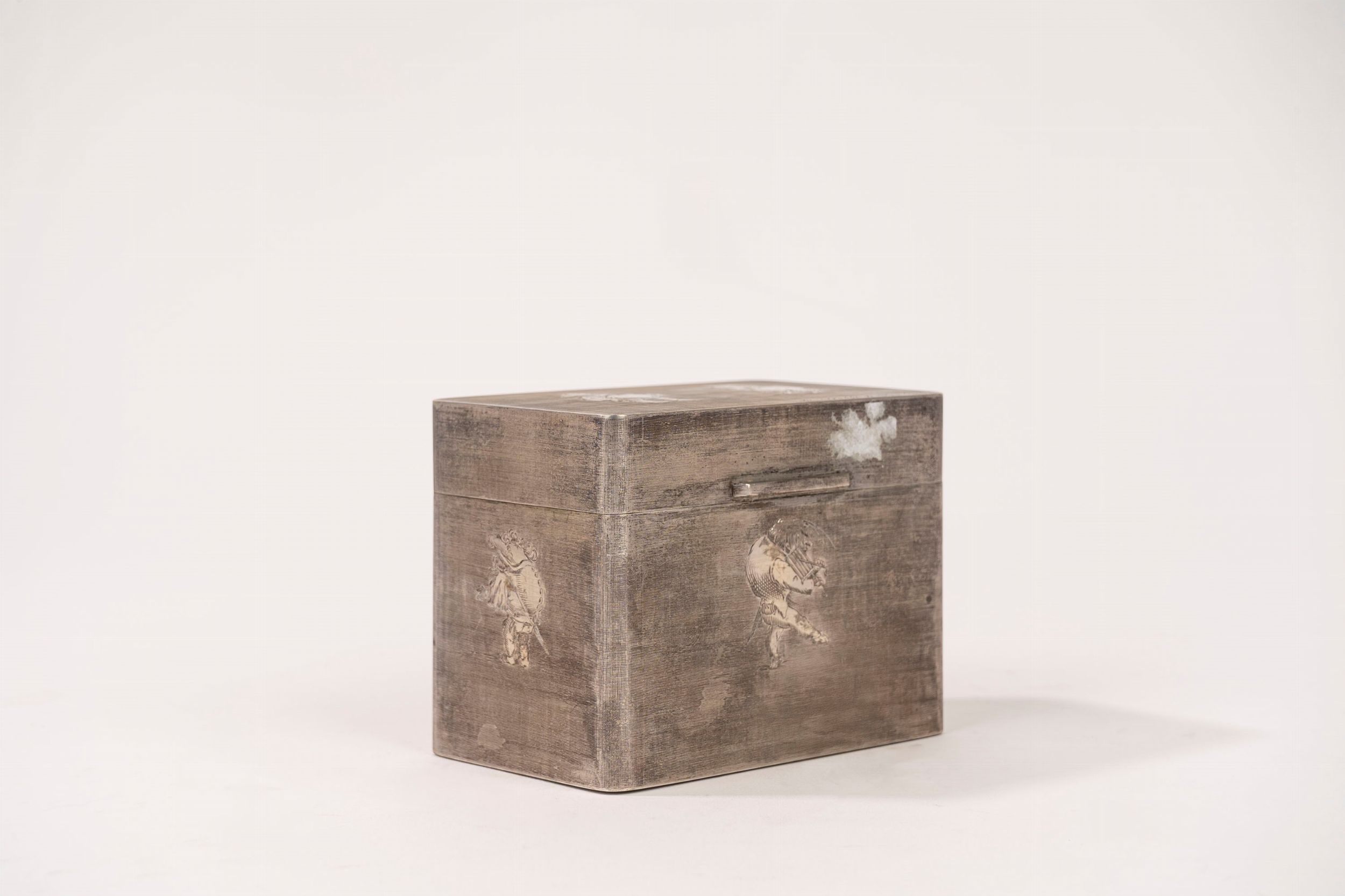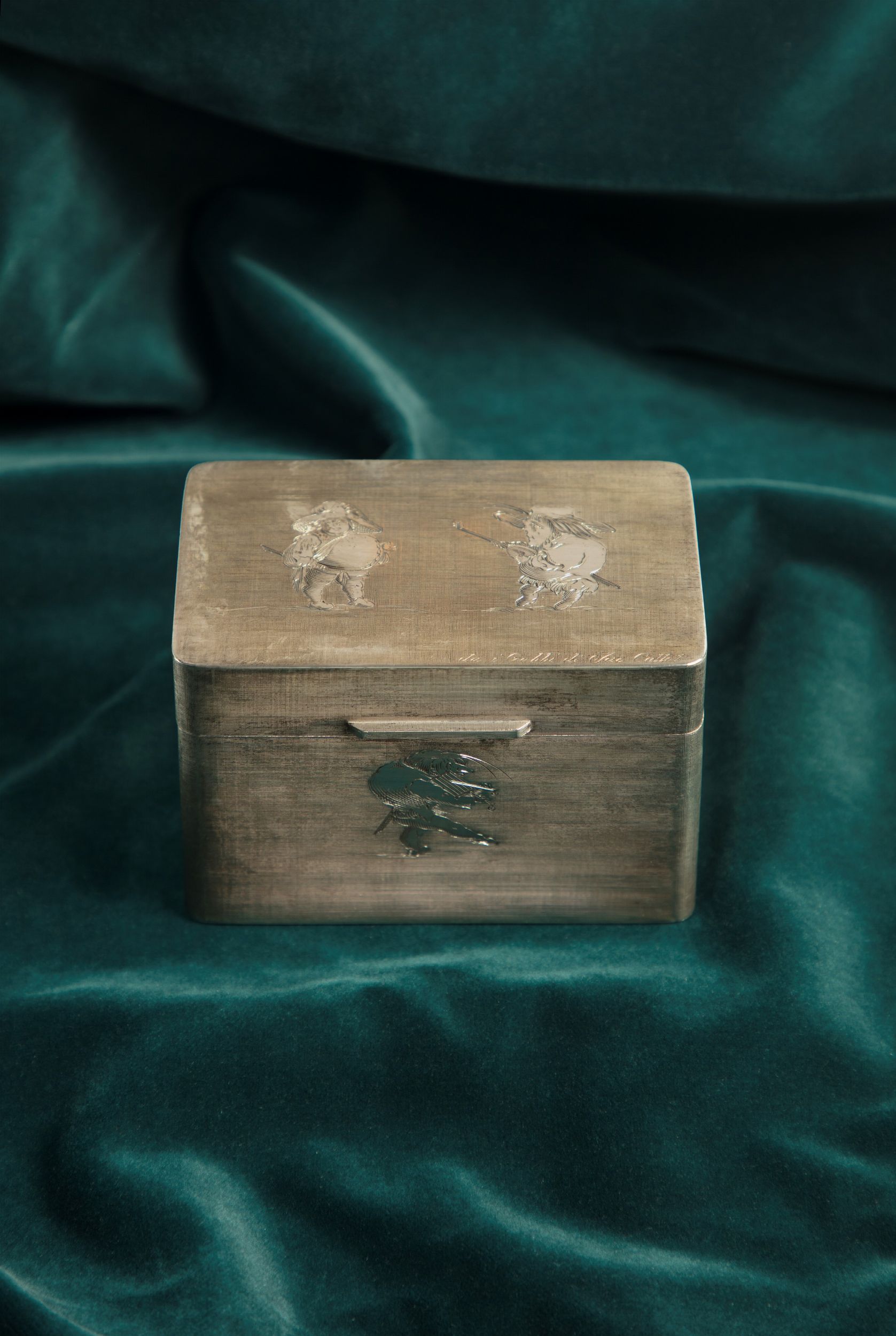Italia, XX secolo di forma rettangolare, finemente cesellata e incisa su ogni lato con figure di gobbi; firmata nella fascia interna M. Buccellati, sul coperchio incisa in basso a desta 'Da i Gobbi di Jac Callot', (lievi difetti).