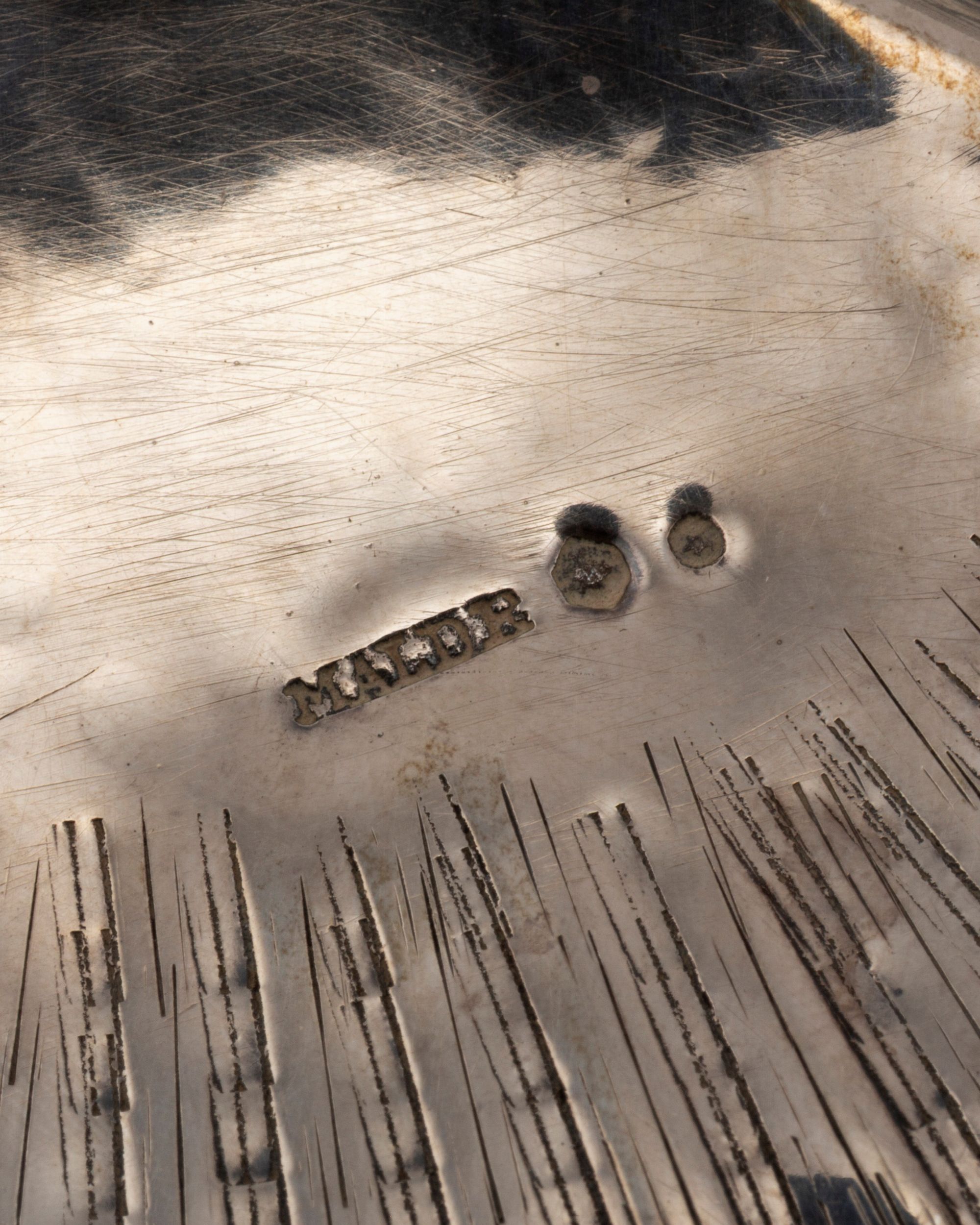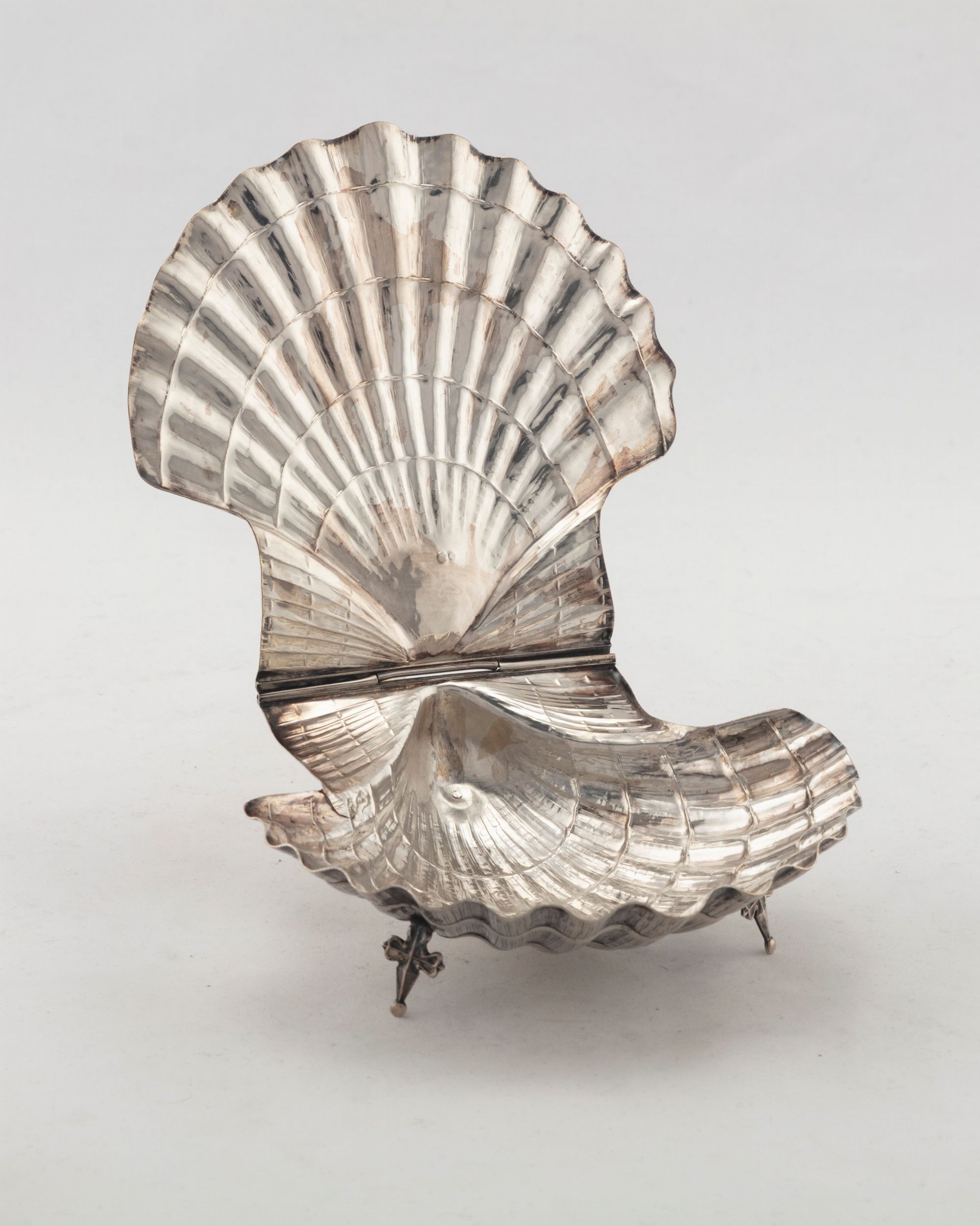 Spagna, inizi secolo XX a foggia di conchiglia dal profilo mosso, incisa a mano ,con tre piedini a croce.