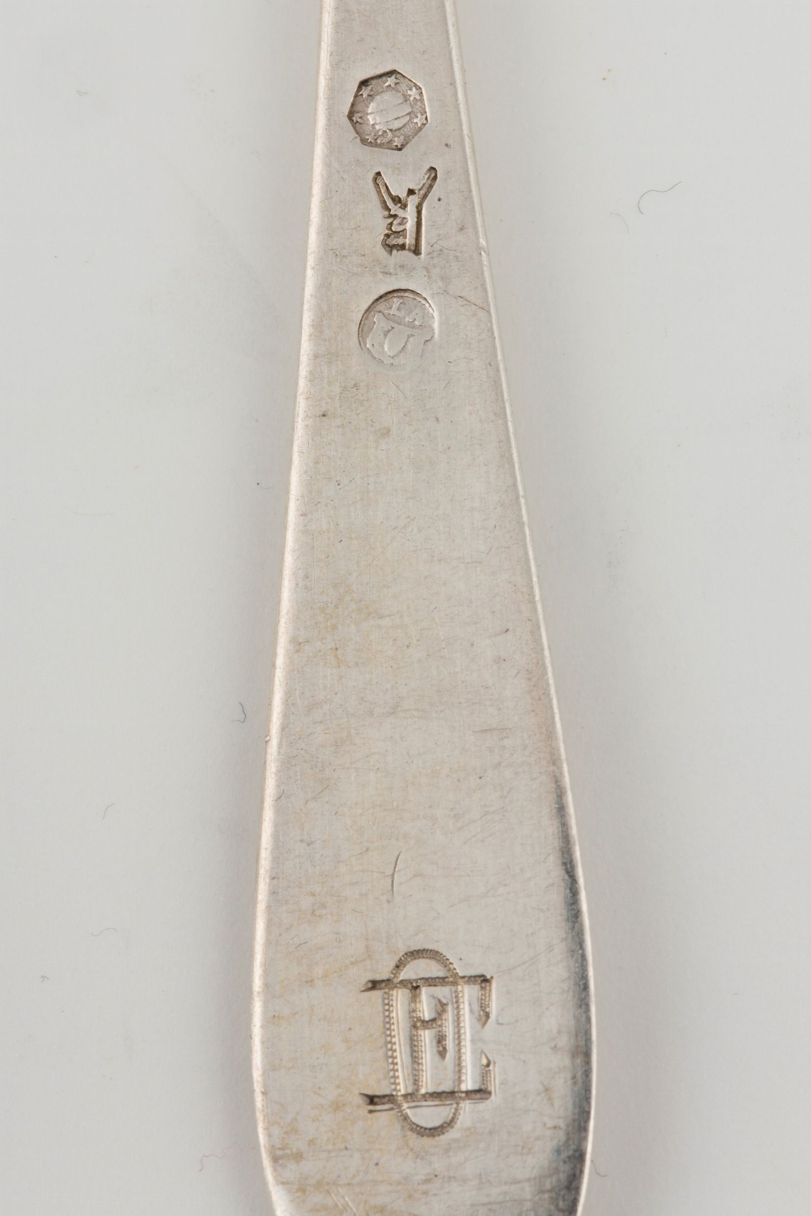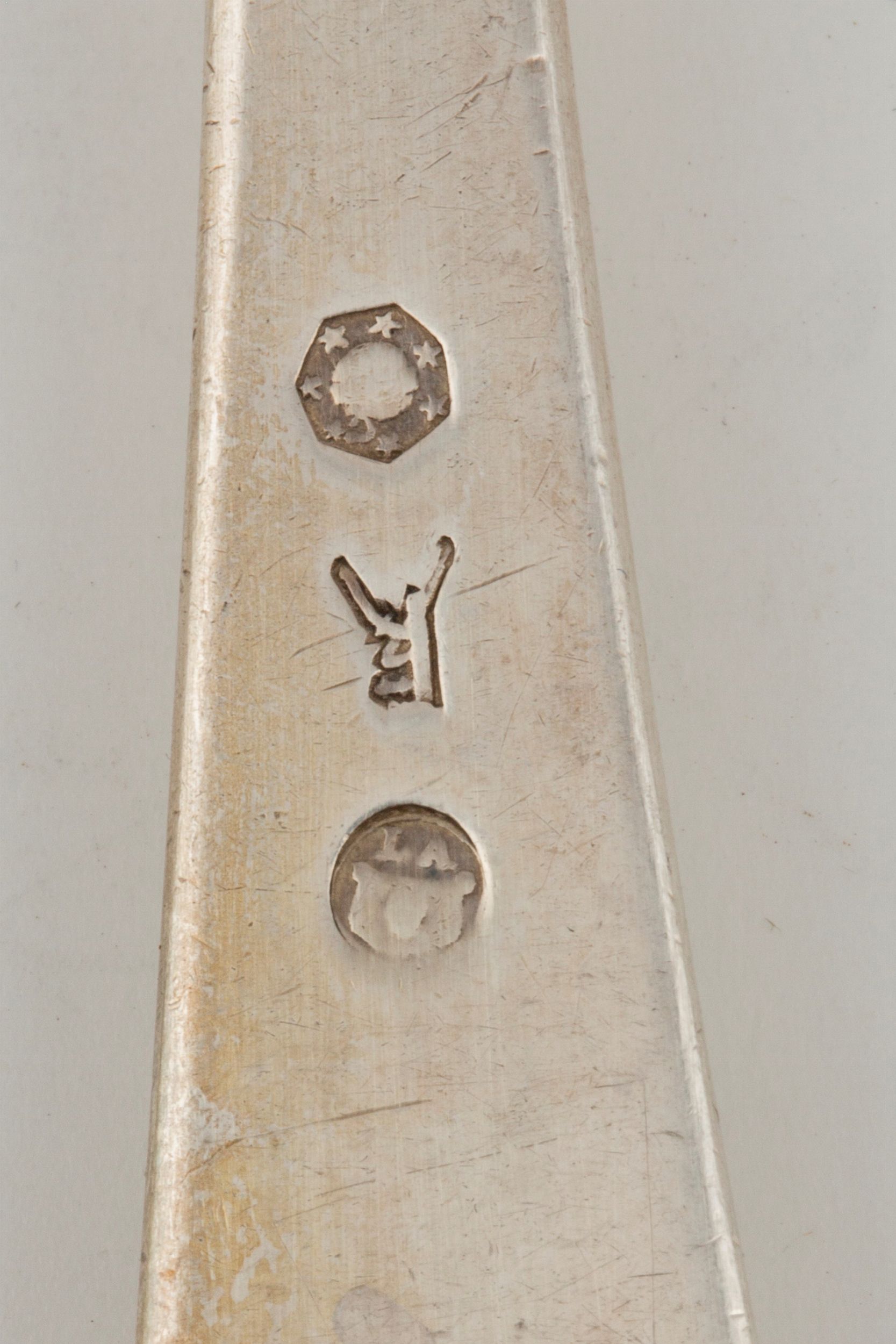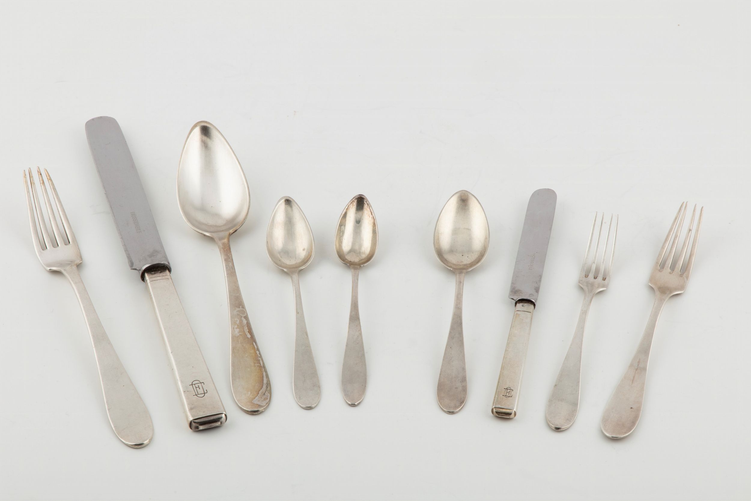 Secolo XIX/XX composto da 73 pezzi: 11 cucchiai grandi, 3 forchette grandi, 5 cucchiaini che recano punzone del regno Lombardo Veneto, argentiere LA (Luigi Alemanni); 6 cucchiaini che recano punzone del regno Lombardo Veneto, argentiere FC (Francesco Ceppi); 12 coltelli grandi e 1 servito con punzone del regno Lombardo Veneto; 10 forchettine, 10 coltelli medi, 9 coltelli piccoli, 3 cucchiaini e 3 forchette dolce, punzone 800; (incompleto).