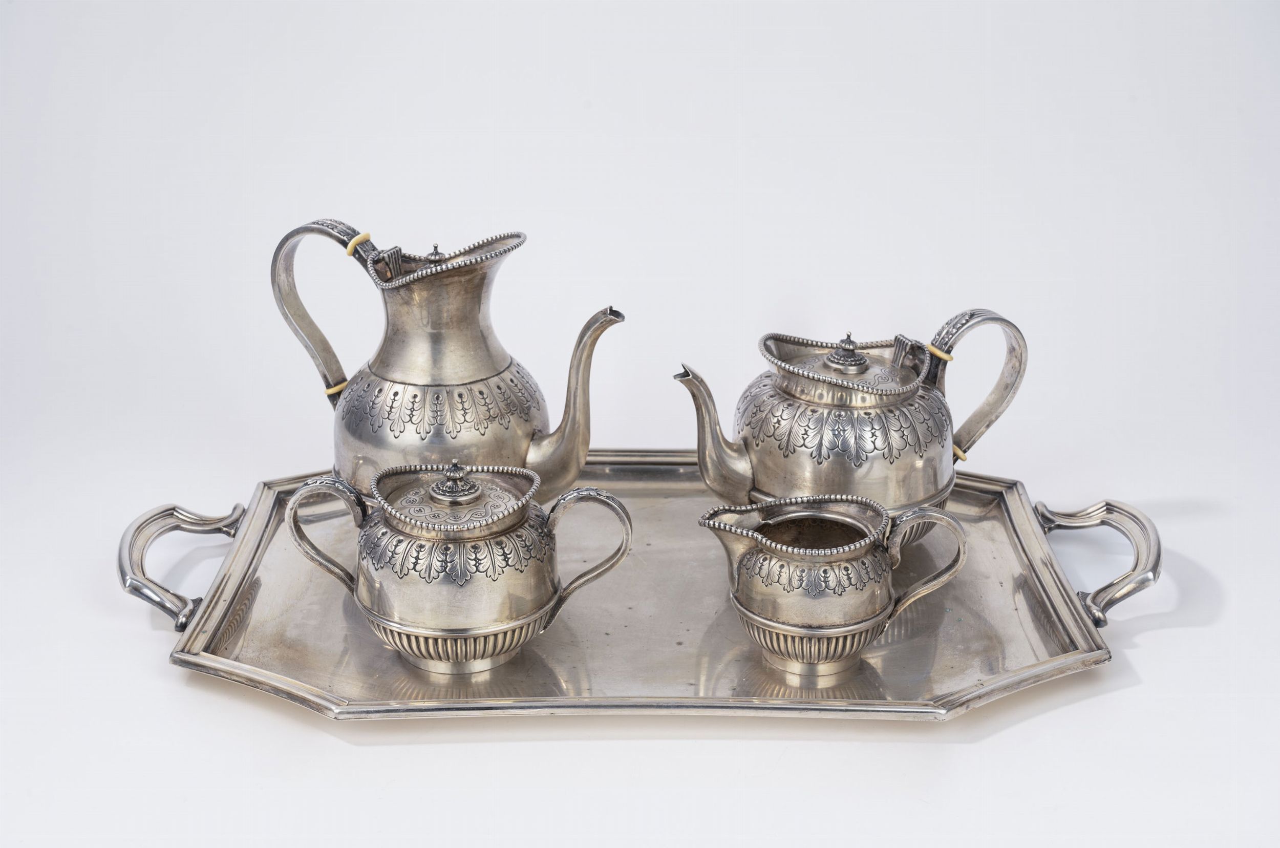 Italia, secolo XX composto da teiera, caffettiera, zuccheriera e lattiera con decori fogliacei incisi e baccellature; accompagnato da vassoio di forma ottagonale a due manici (di manifattura differente).