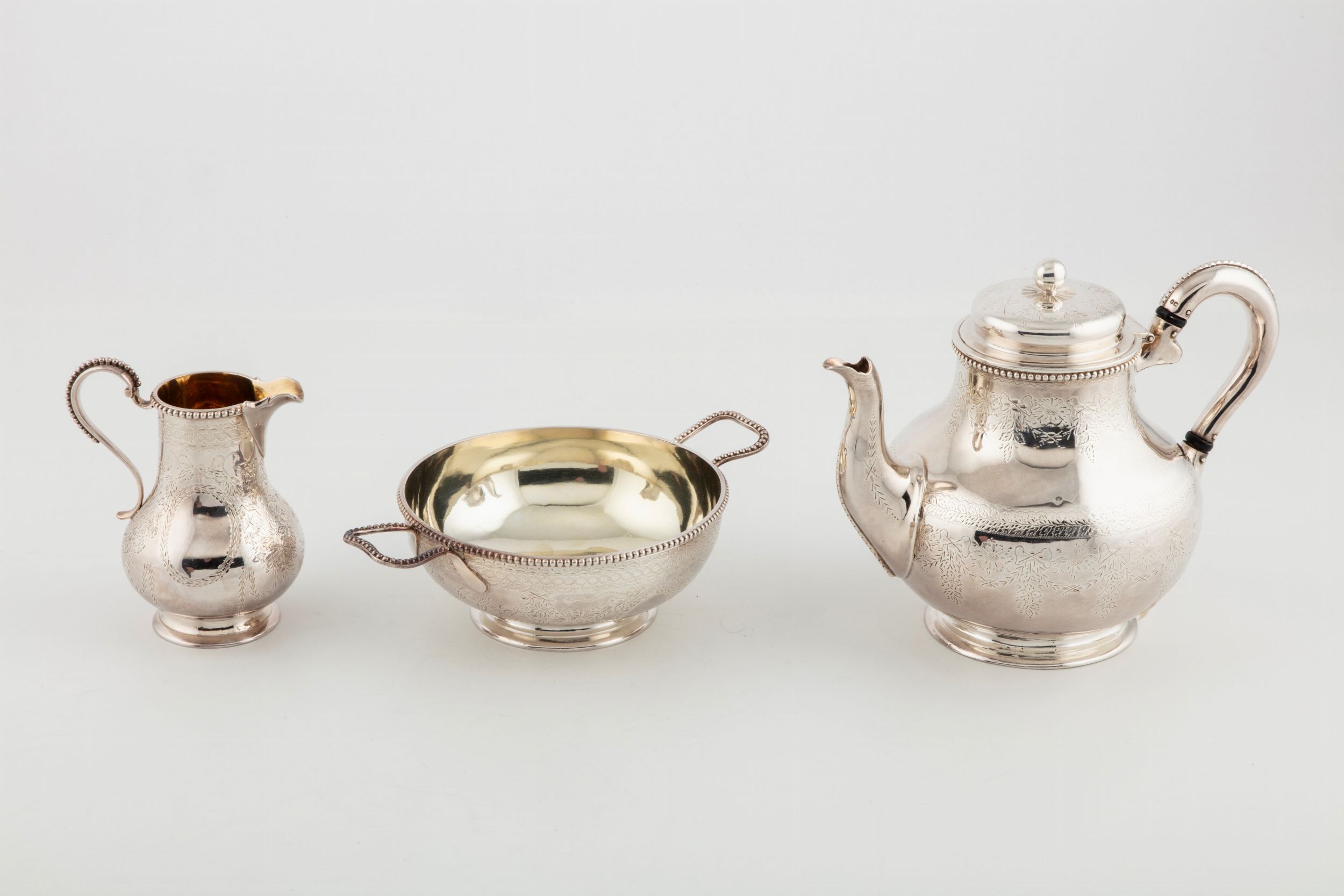 Londra, 1859 Argentiere AS (Arthur Sibley?), composto da teiera, lattiera con interno in vermeil e zuccheriera, incisi sul corpo con motivi floreali e fogliacei, bordi a perline.