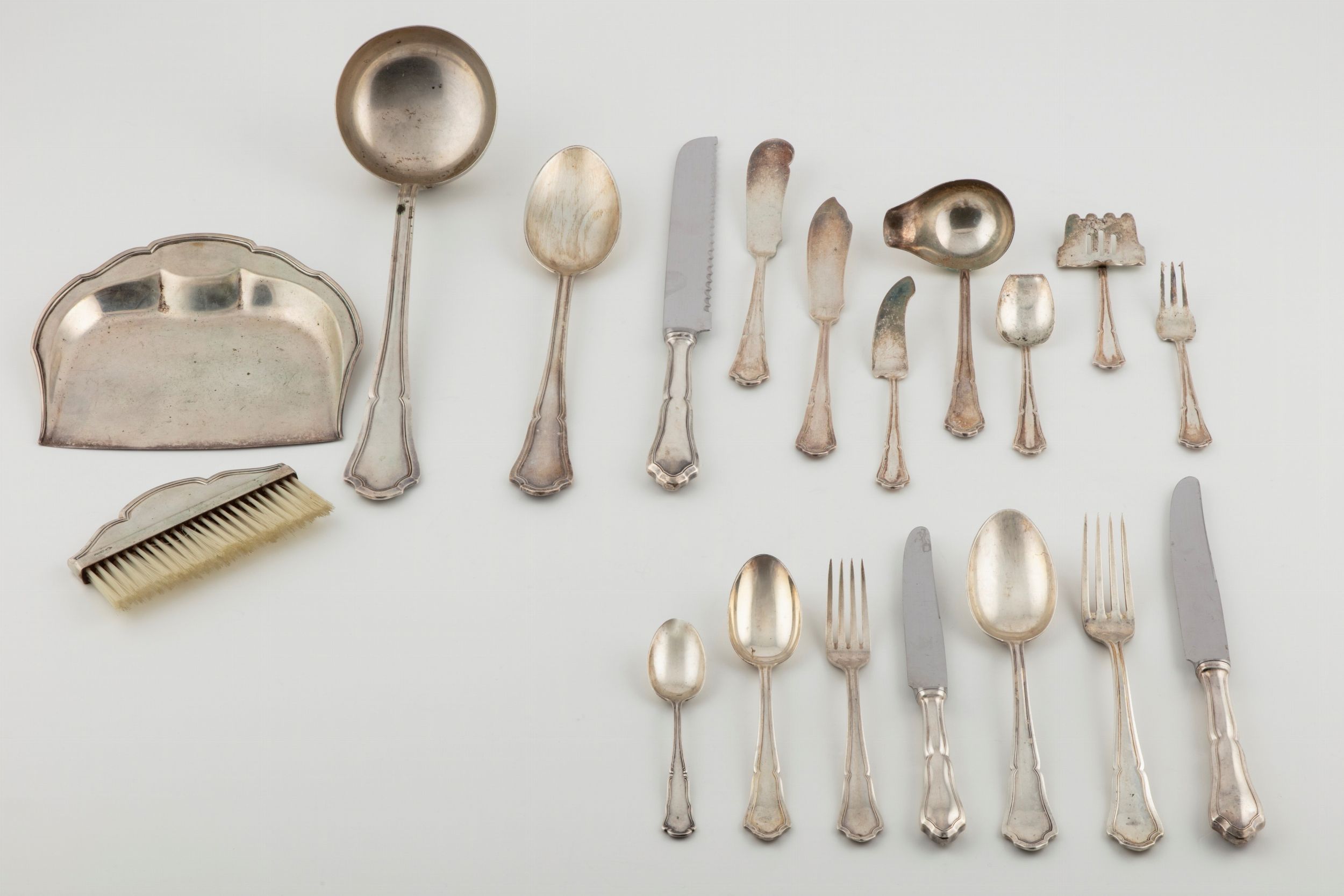 Italia, metà secolo XX composto da 95 pezzi: 12 forchette, 12 cucchiai, 12 coltelli, 12 forchette frutta, 12 coltelli frutta, 12 cucchiai da dessert, 12 cucchaini da tè, 10 serviti, 1 raccogli briciole con paletta.