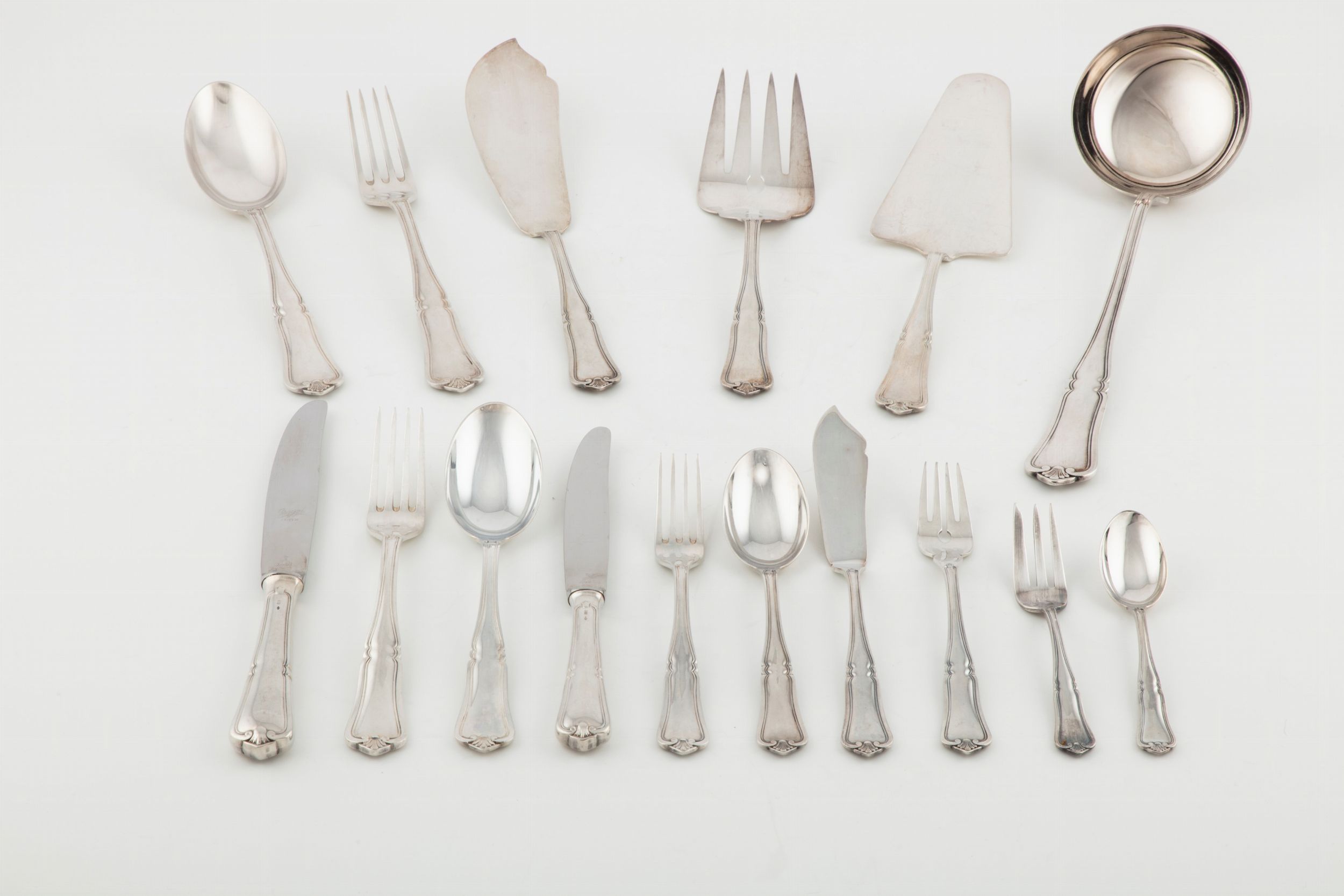 Italia, secolo XX composto da 140 pezzi: 12 cucchiai grandi, 12 cucchiai medi, 12 cucchiaini, 12 coltelli pesce, 24 forchette grandi, 12 forchette pesce, 12 forchette medie, 12 forchettine dolce, 12 coltelli medi, 12 coltelli grandi e 6 serviti.