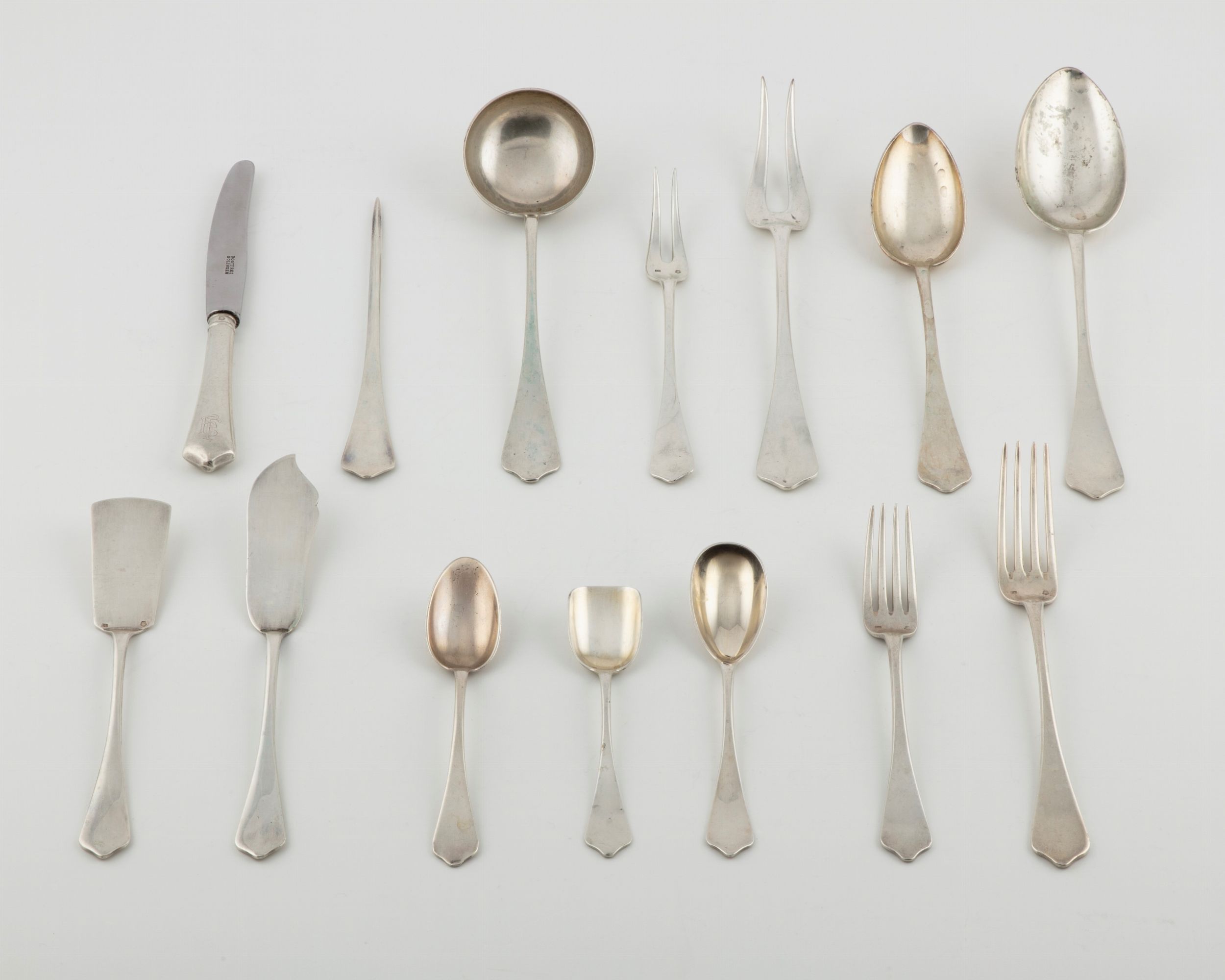 Impero Austro Ungarico, 1872-1922 Argentiere KM (non identificato), composto da 72 pezzi: 6 forchette, 11 coltelli, 6 cucchiai, 9 forchette da dessert, 12 palette da dolce, 11 cucchiai da tè, 7 cucchiaini da caffè, 10 serviti; monogrammate FF.