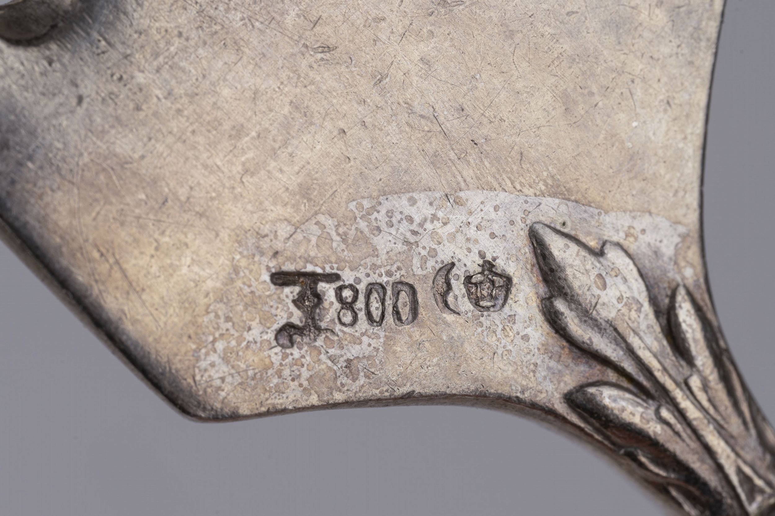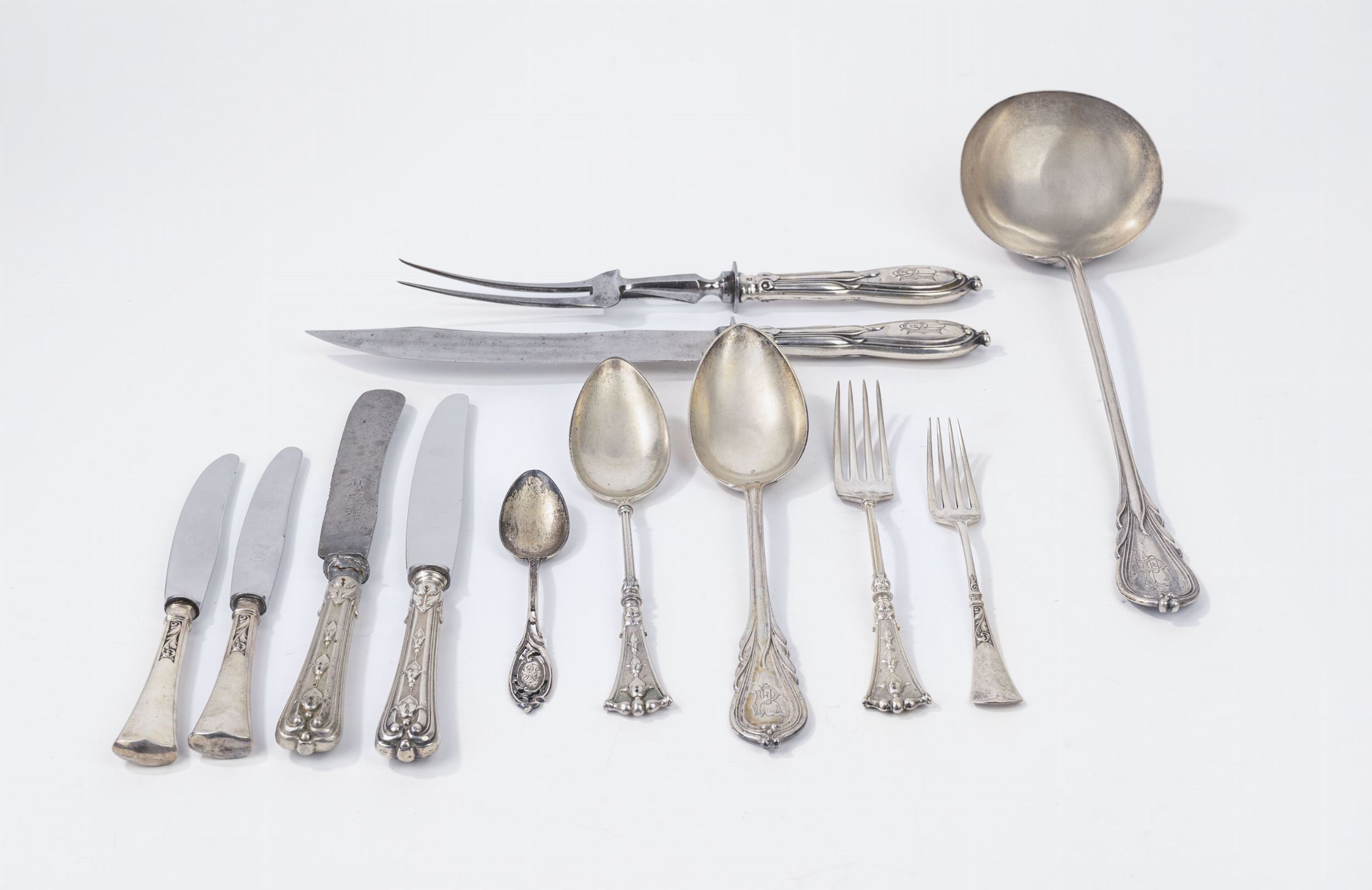 Italia, secolo XX composto da 90 pezzi: 12 cucchiai, 24 forchette, 6 cucchiaini, 12 forchettine, 4 serviti, 22 coltelli , 10 coltelli piccoli.