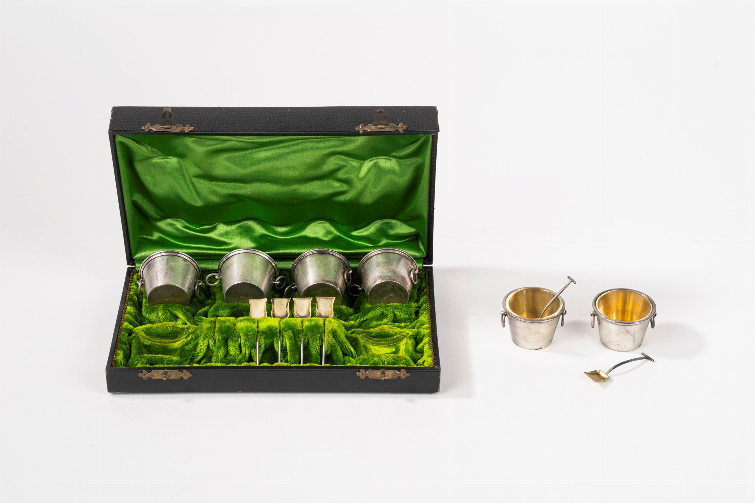 Probabilmente secolo XIX/XX composto da sei piccoli secchielli con interni in vetro e sei palette, con astuccio.