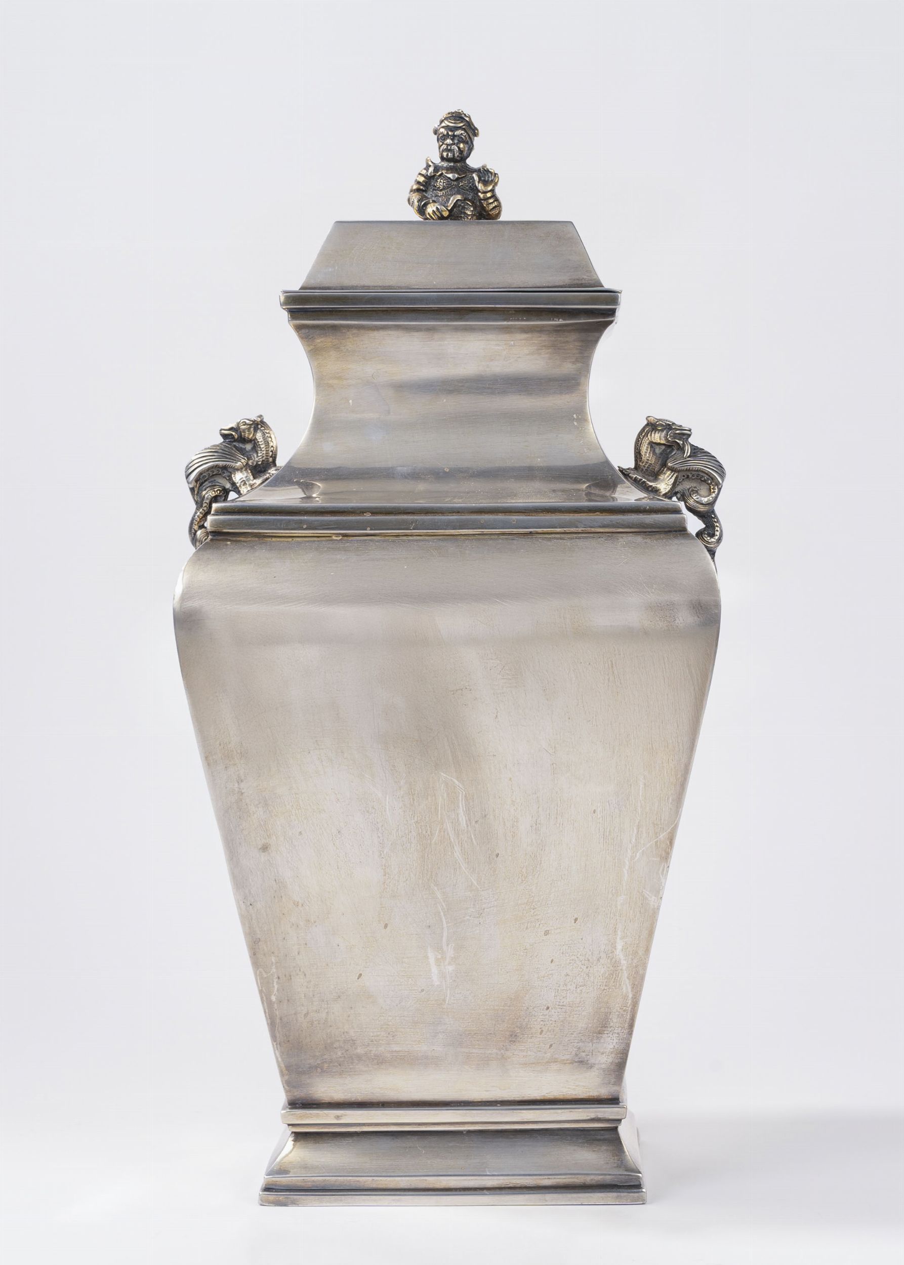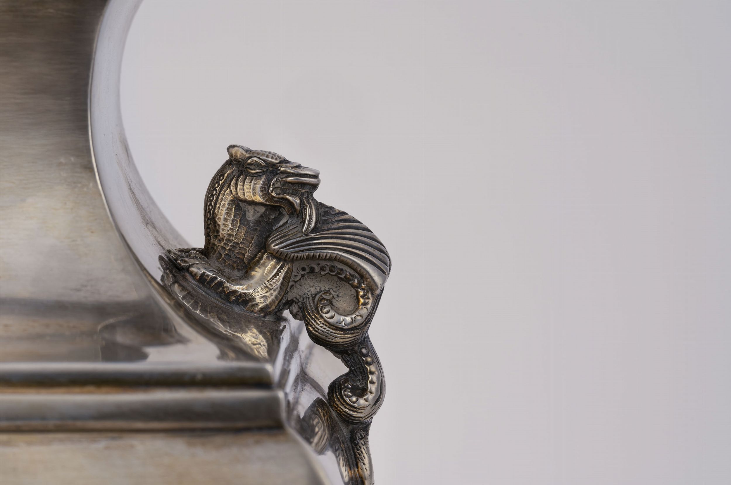 Italia, secolo XX a corpo liscio, anse a foggia di belva mitologica, presa del coperchio con figura di Digitario.