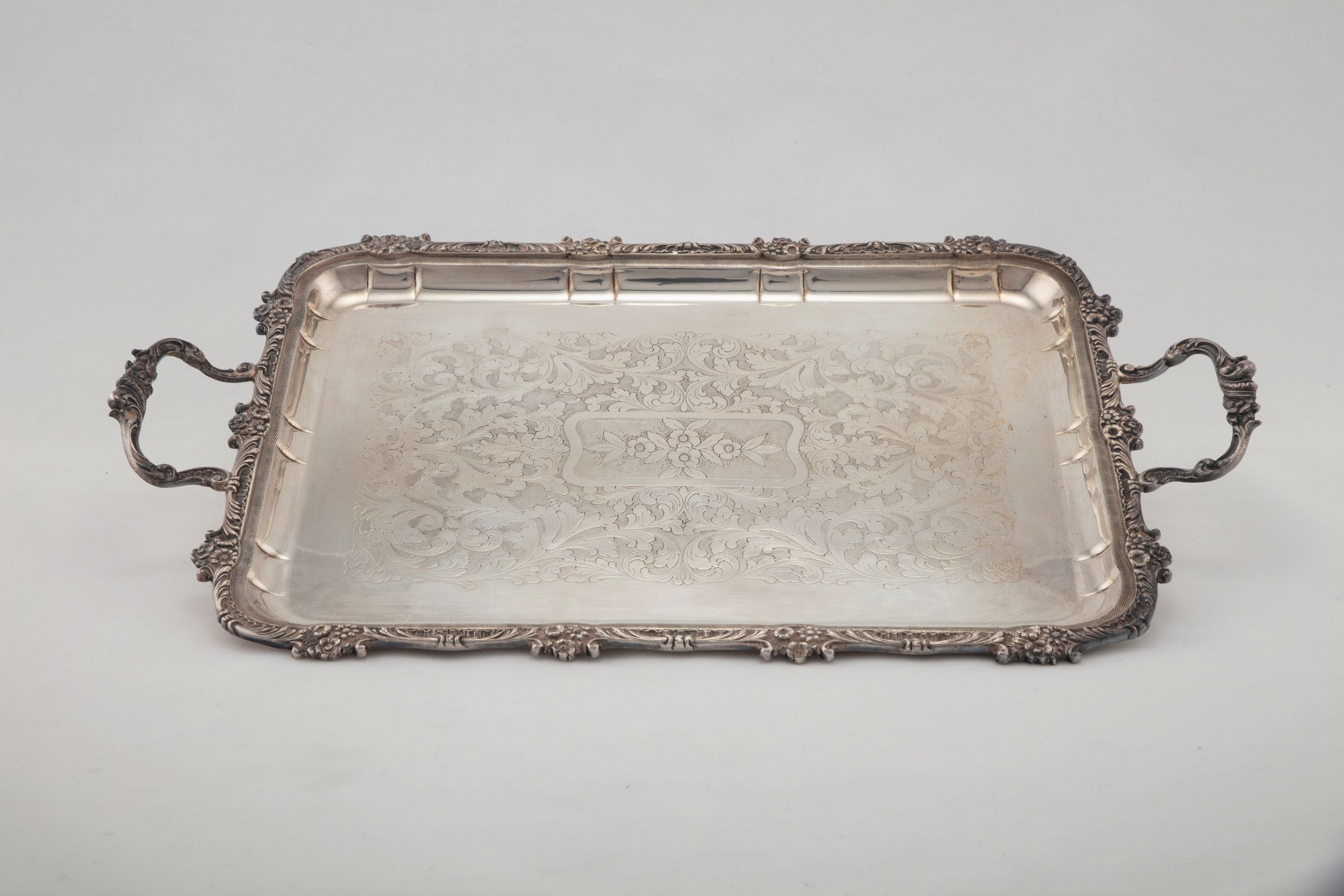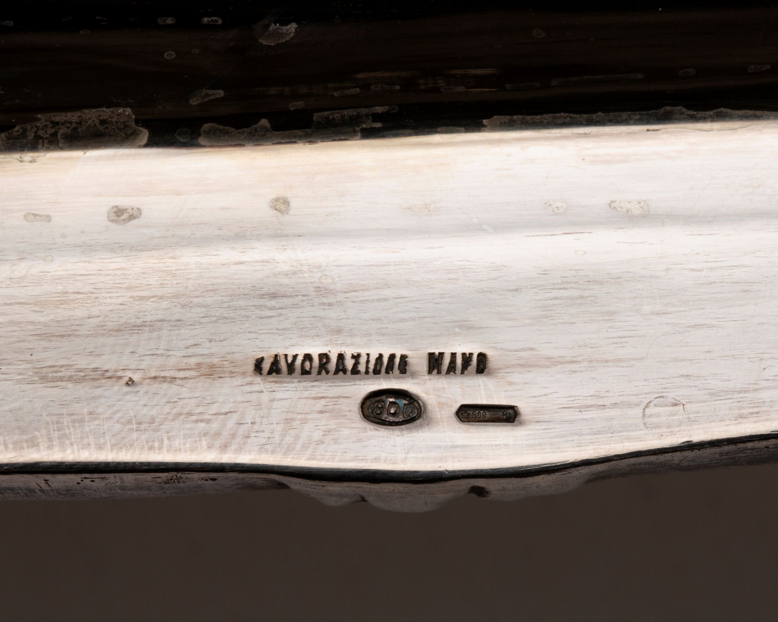 Italia, secolo XX biansato, bordo cesellato con fiori, inciso al centro con motivi fogliacei intrecciati e riserva con fiori.