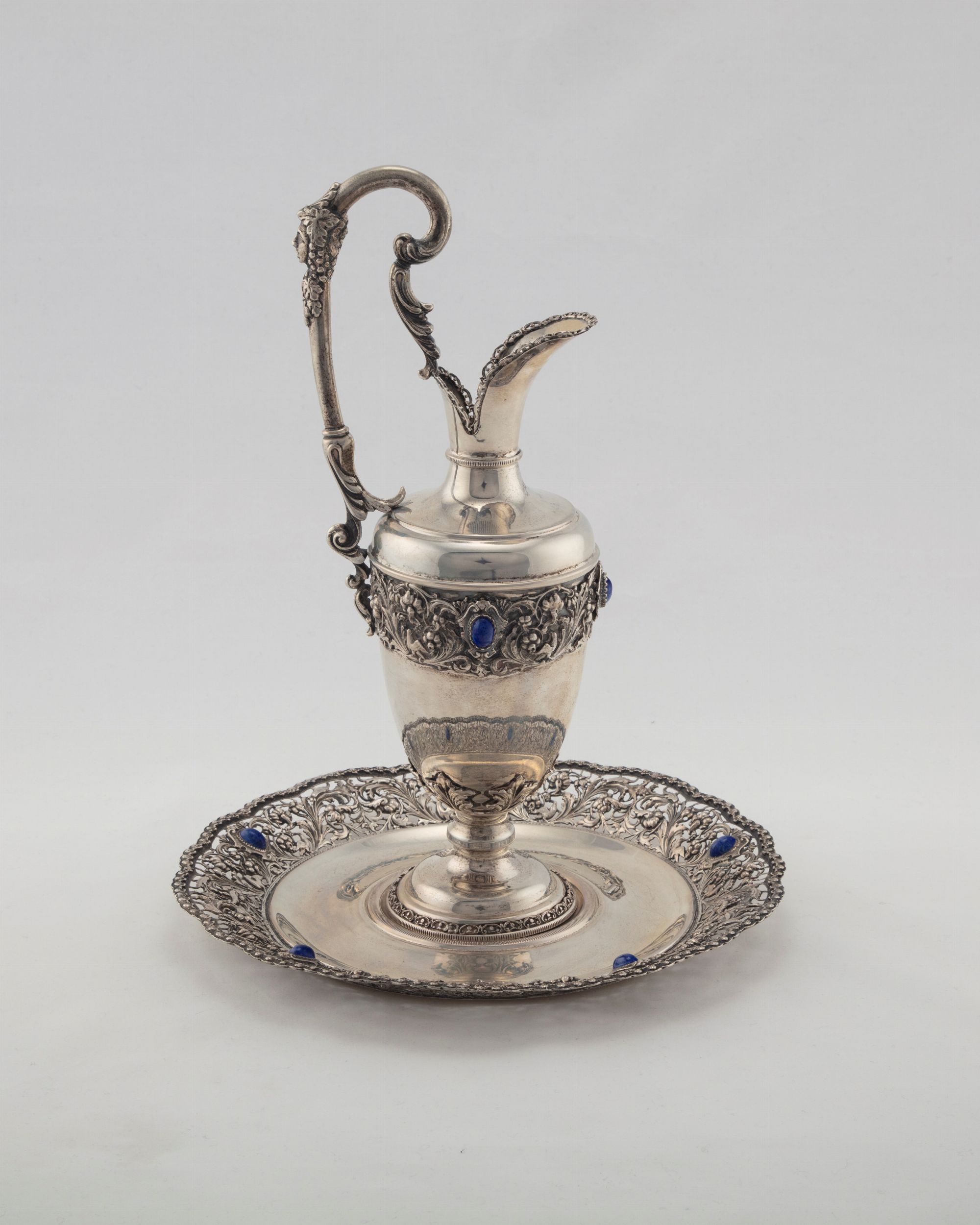 Italia, secolo XX il piatto circolare traforato e sbalzato a motivi floreali (d cm 27,00); il versatorio con base circolare, fascia centrale sbalzata con paste vitree, presa alta con mascherone.