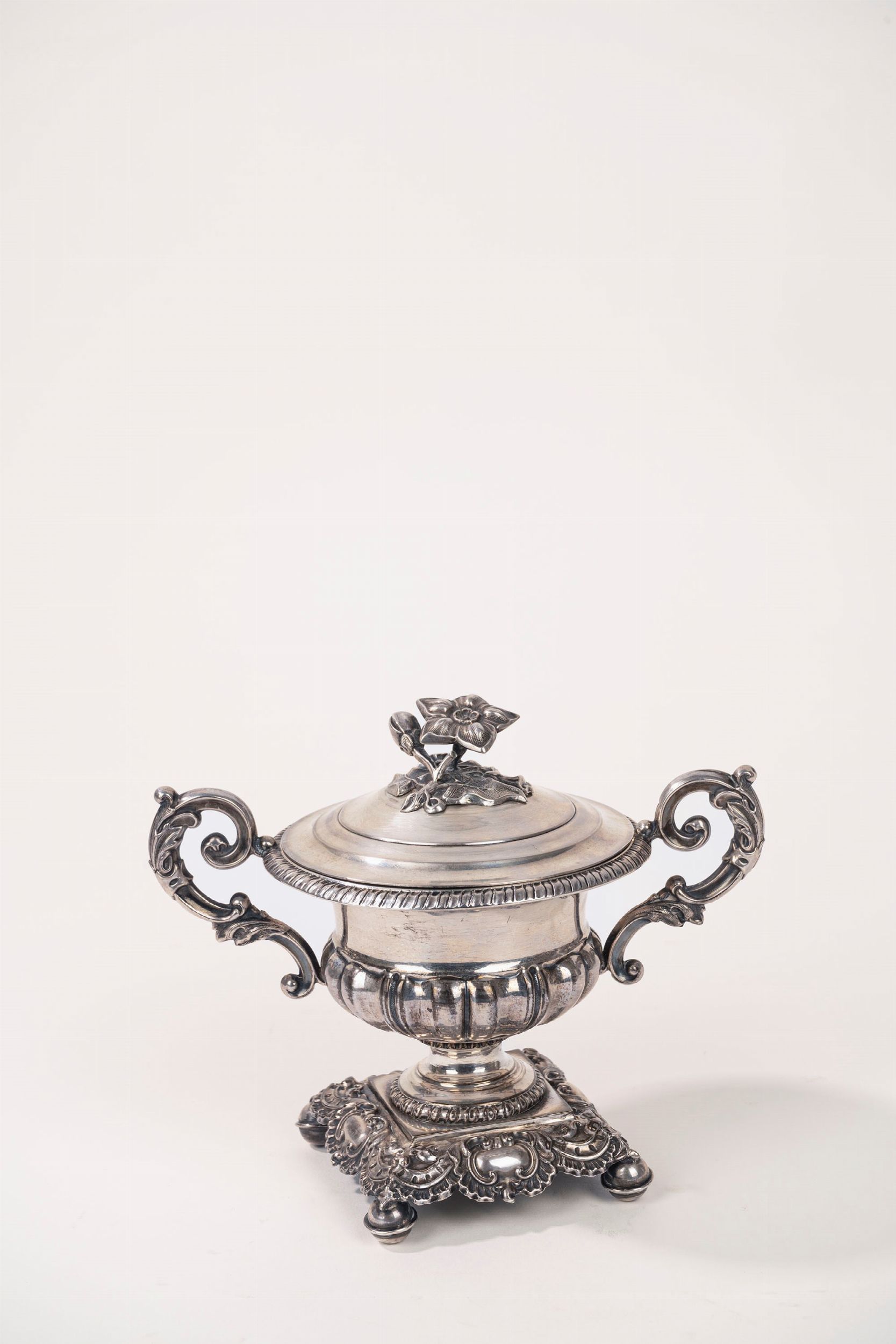 Regno Lombardo Veneto, Milano, 1812/1872 biansata a volute, base quadrata sbalzata su quattro piedini a boule, decori a rilievo, presa floreale.