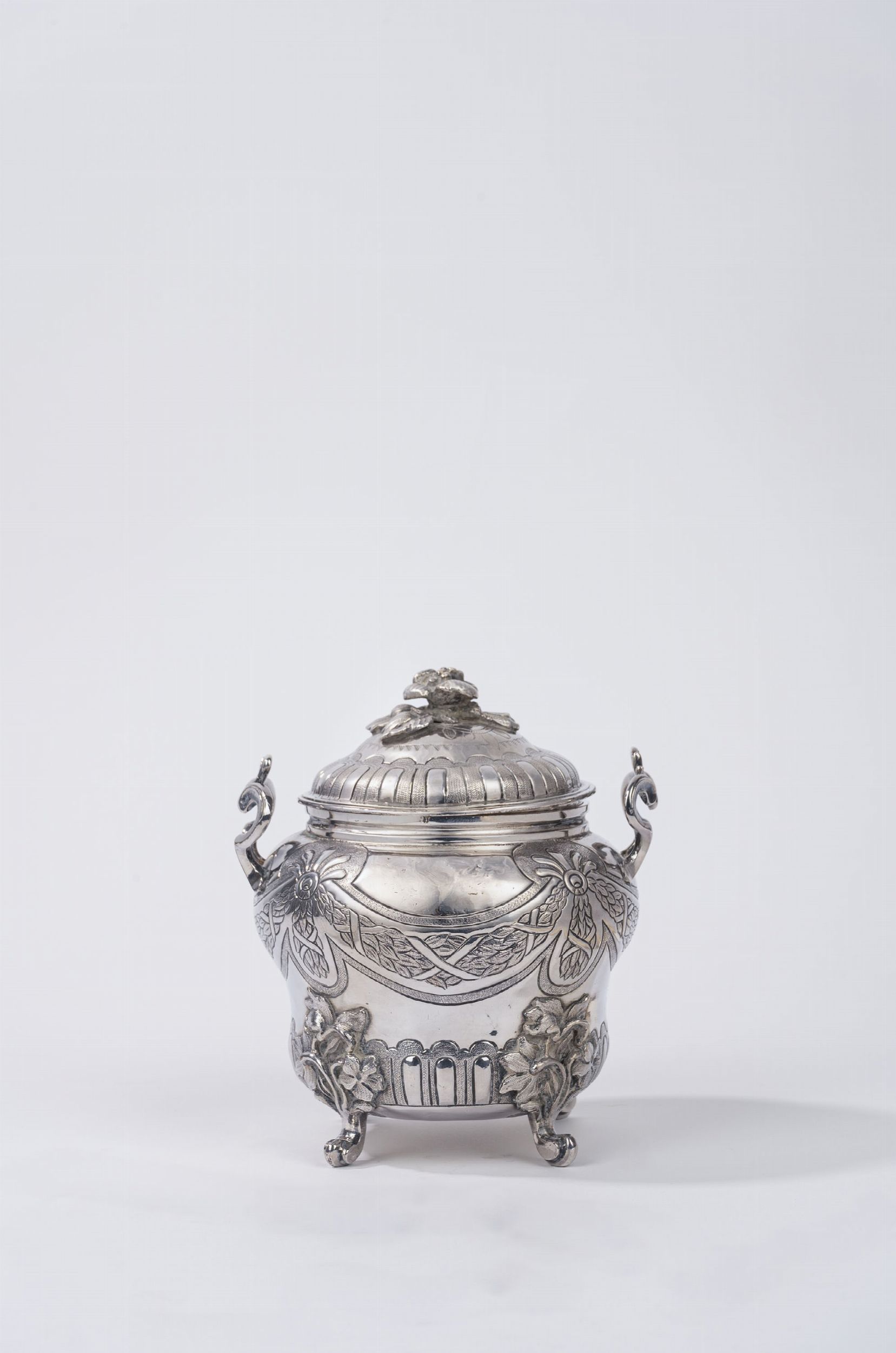 Belgio (?), secolo XVIII Argentiere IC (non identificato), punzoni di esportazione francesi per il secolo XVIII, biansata, con decori incisi a festoni e baccellature, su quattro piedini, con decori floreali a rilievo, presa a fiore.
