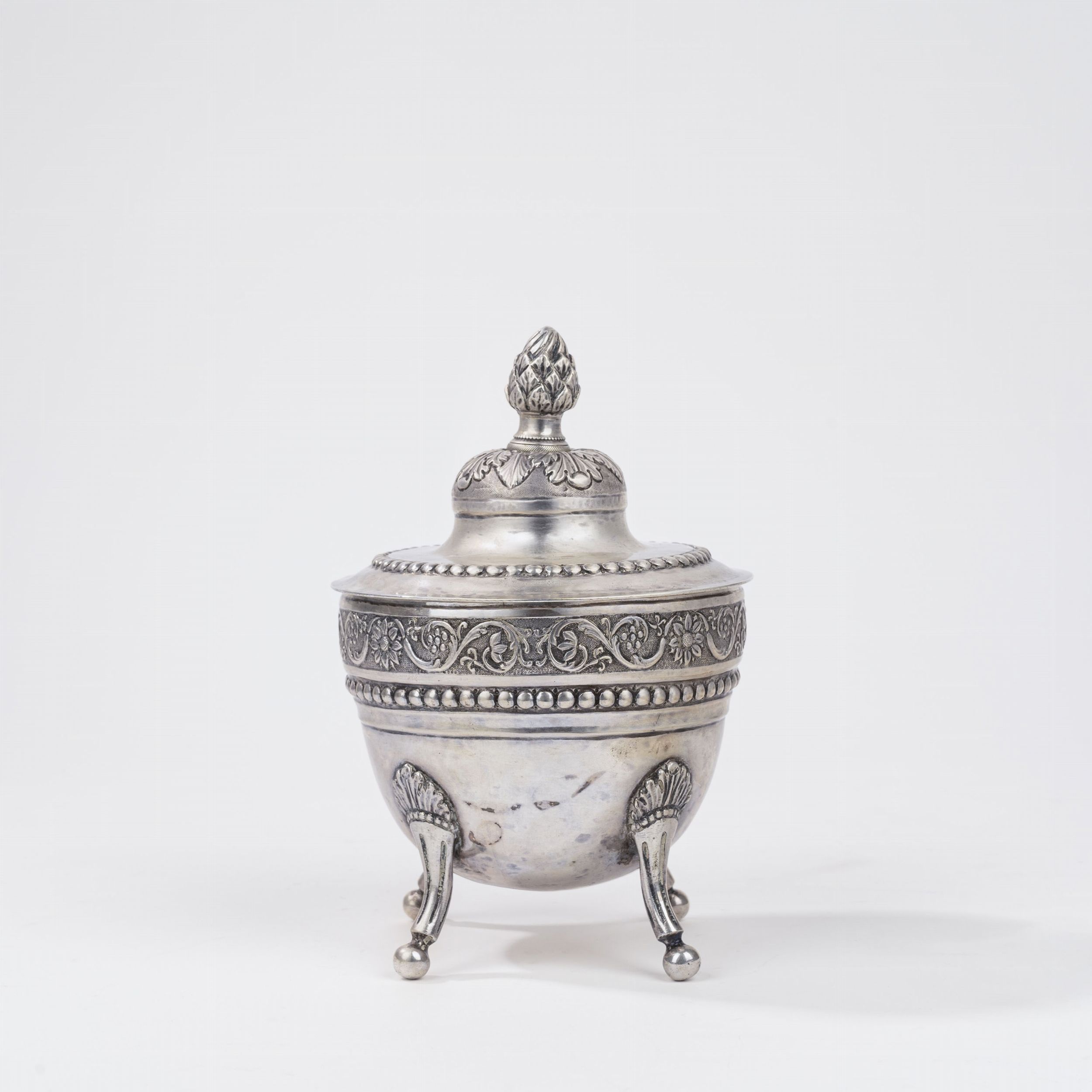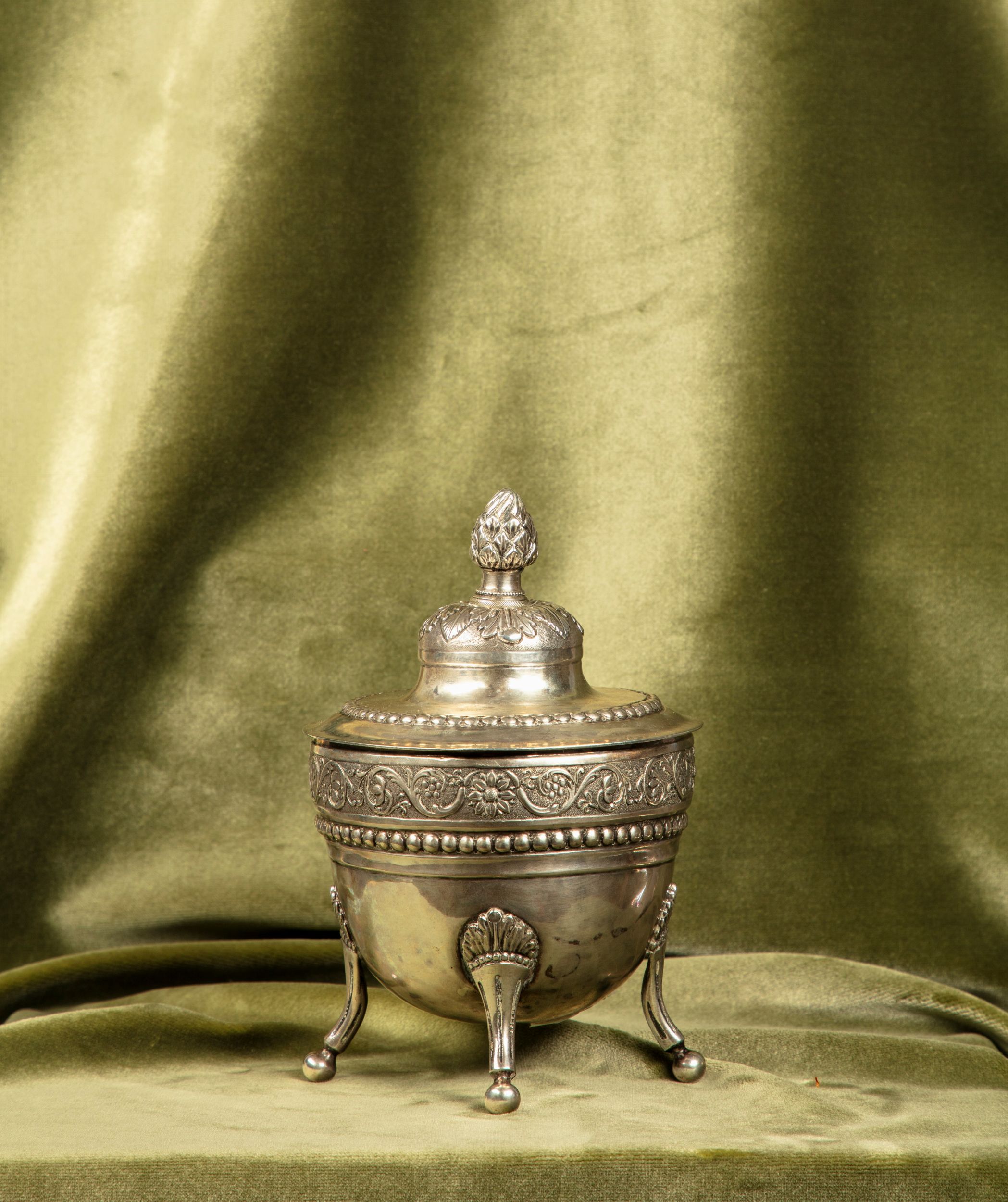 Italia, secolo XIX punzoni dell'argentiere consunti di difficile lettura, poggiante su quattro piedini a boule, fascia con decoro sbalzato a perline e fitomorfi, presa del coperchio a pigna.