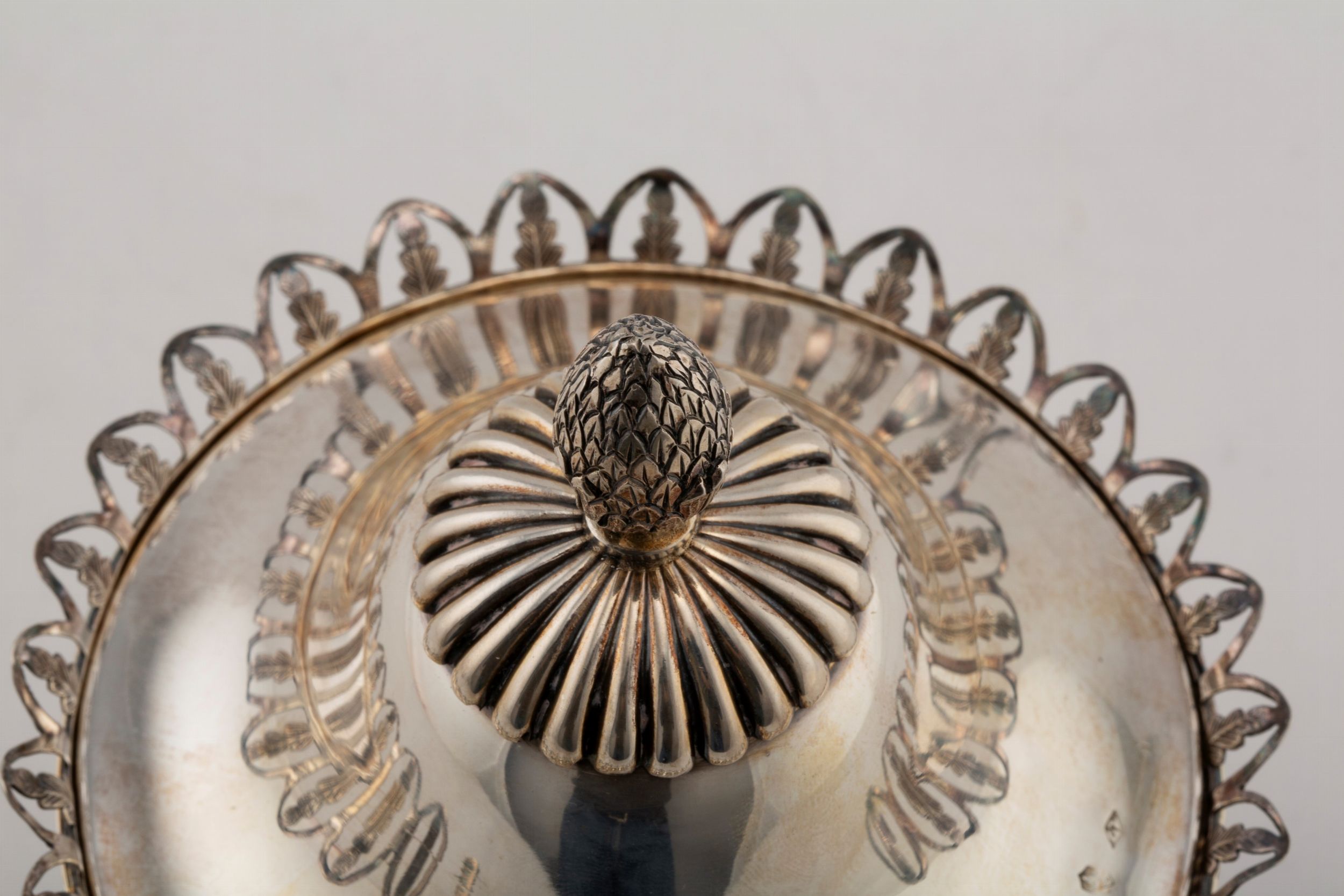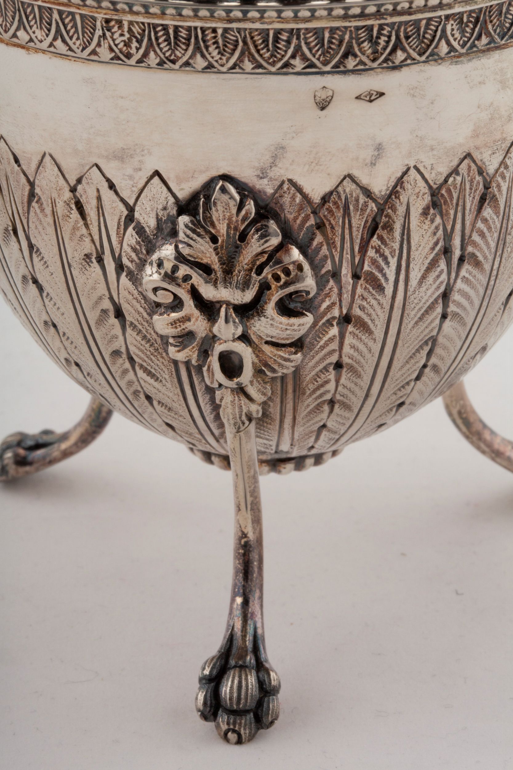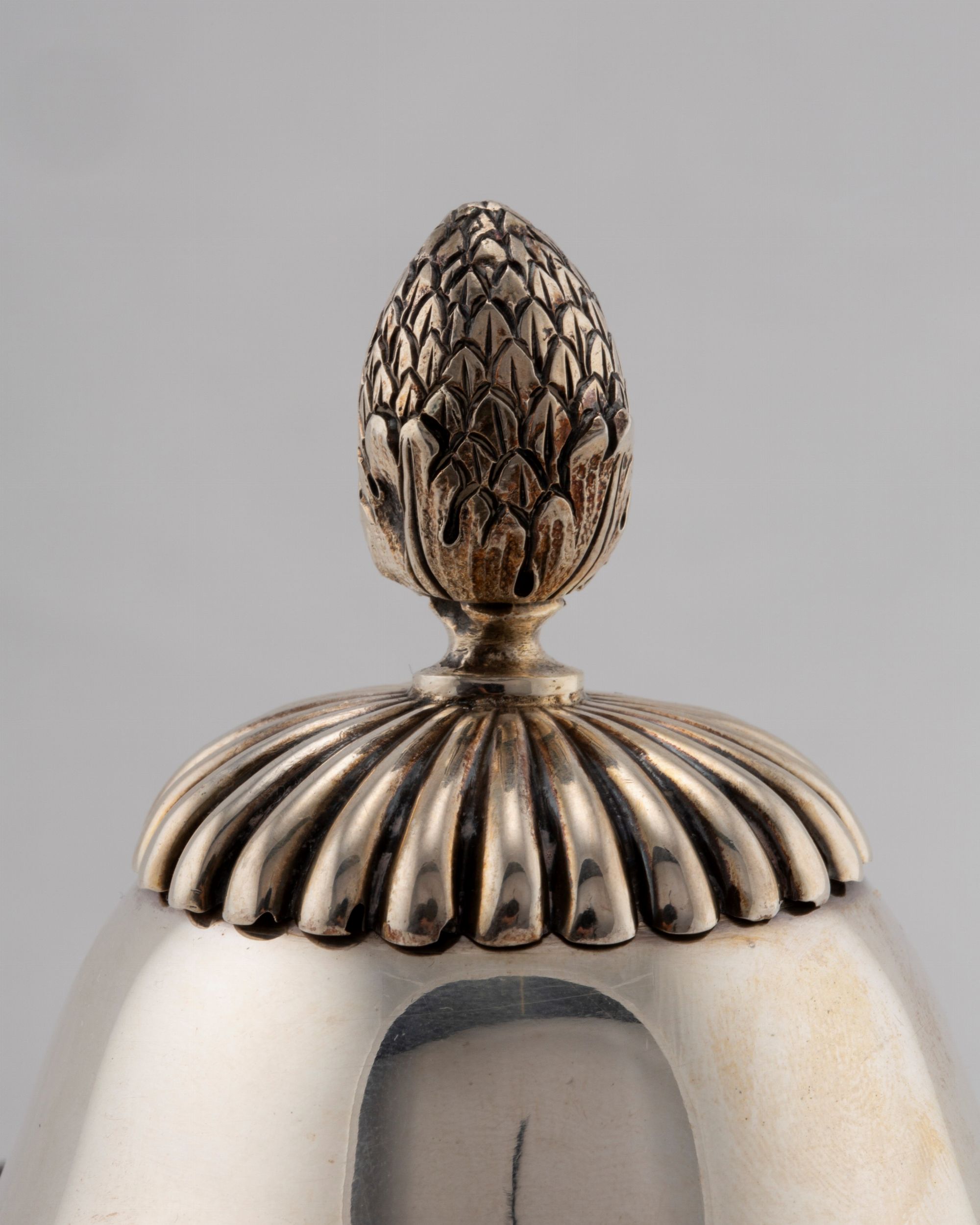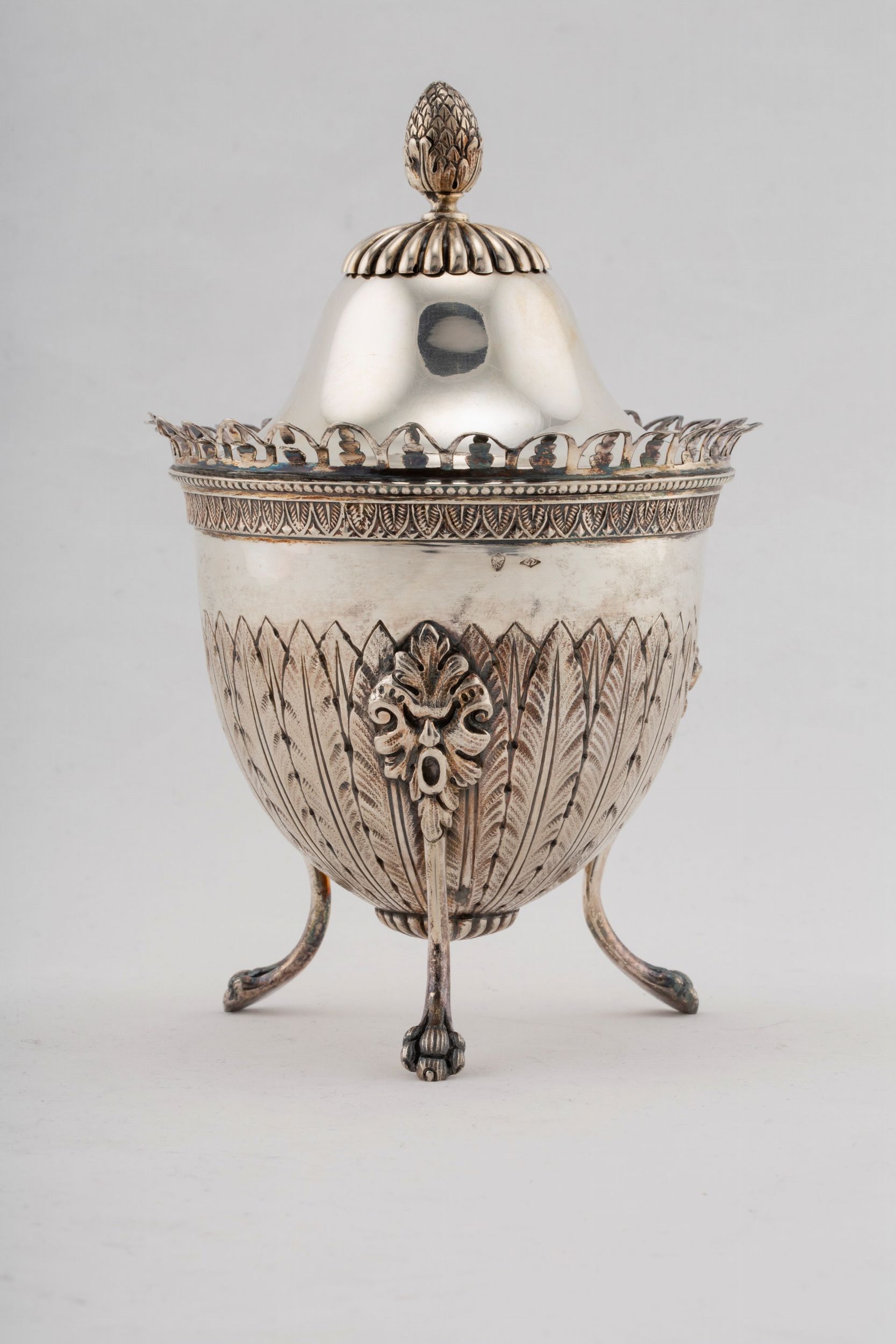 in argento, Peso g 340,00 h cm 17,20 Stato Pontificio, inizi secolo XIX Argentiere GZ (non identificato), poggiante su tre piedini ferini terminanti in mascheroni, corpo decorato ad ampie volute e bordo a palmette, il coperchio con il bordo superiore reticolato con foglie, presa del coperchio scanalata sormontata da pigna.
