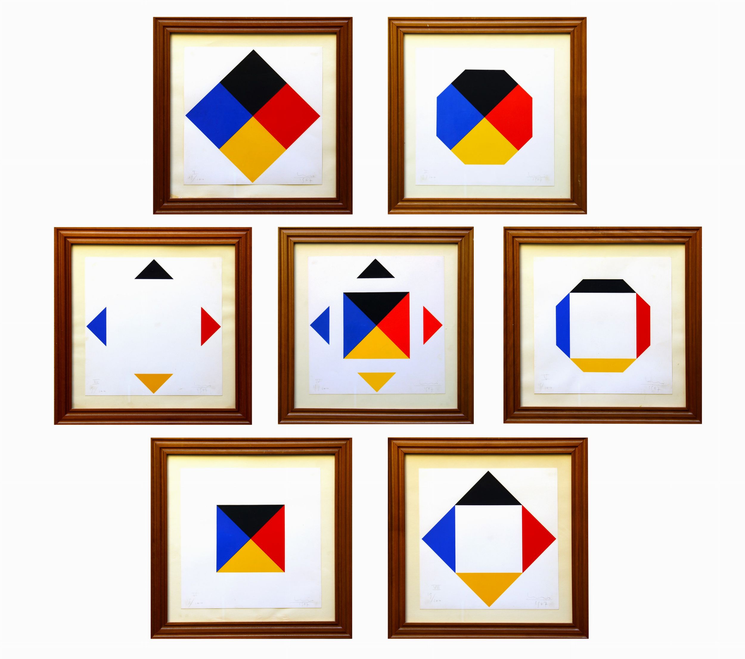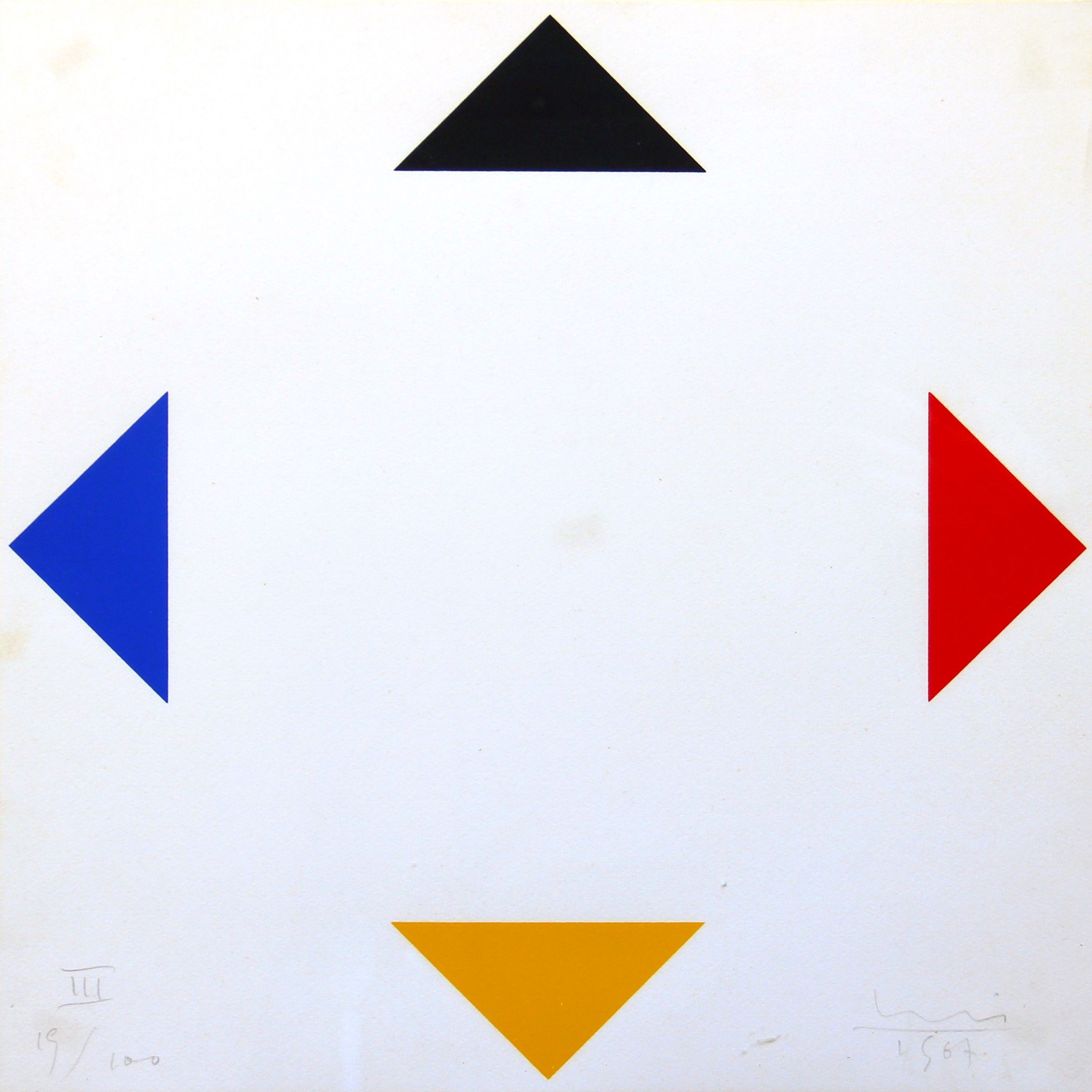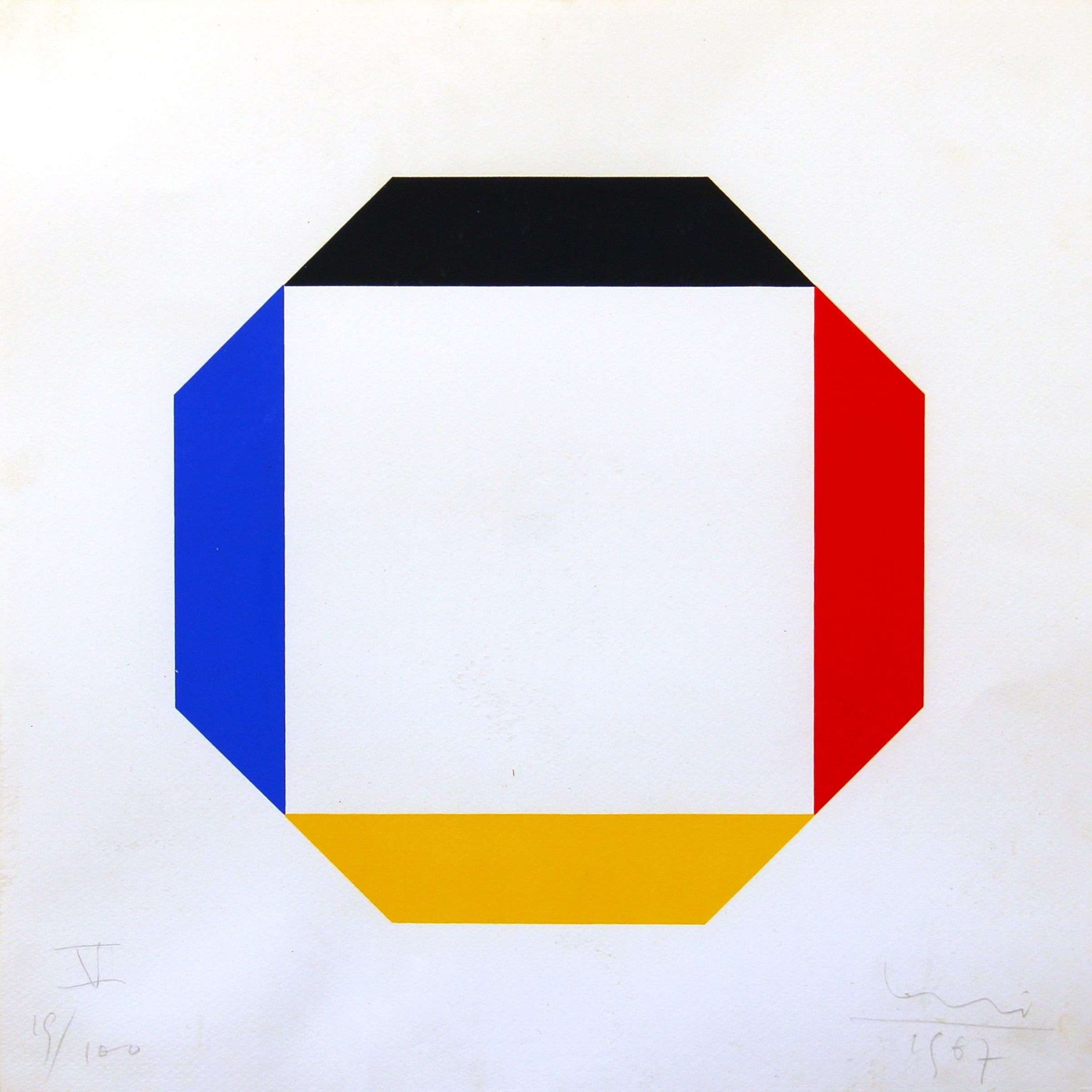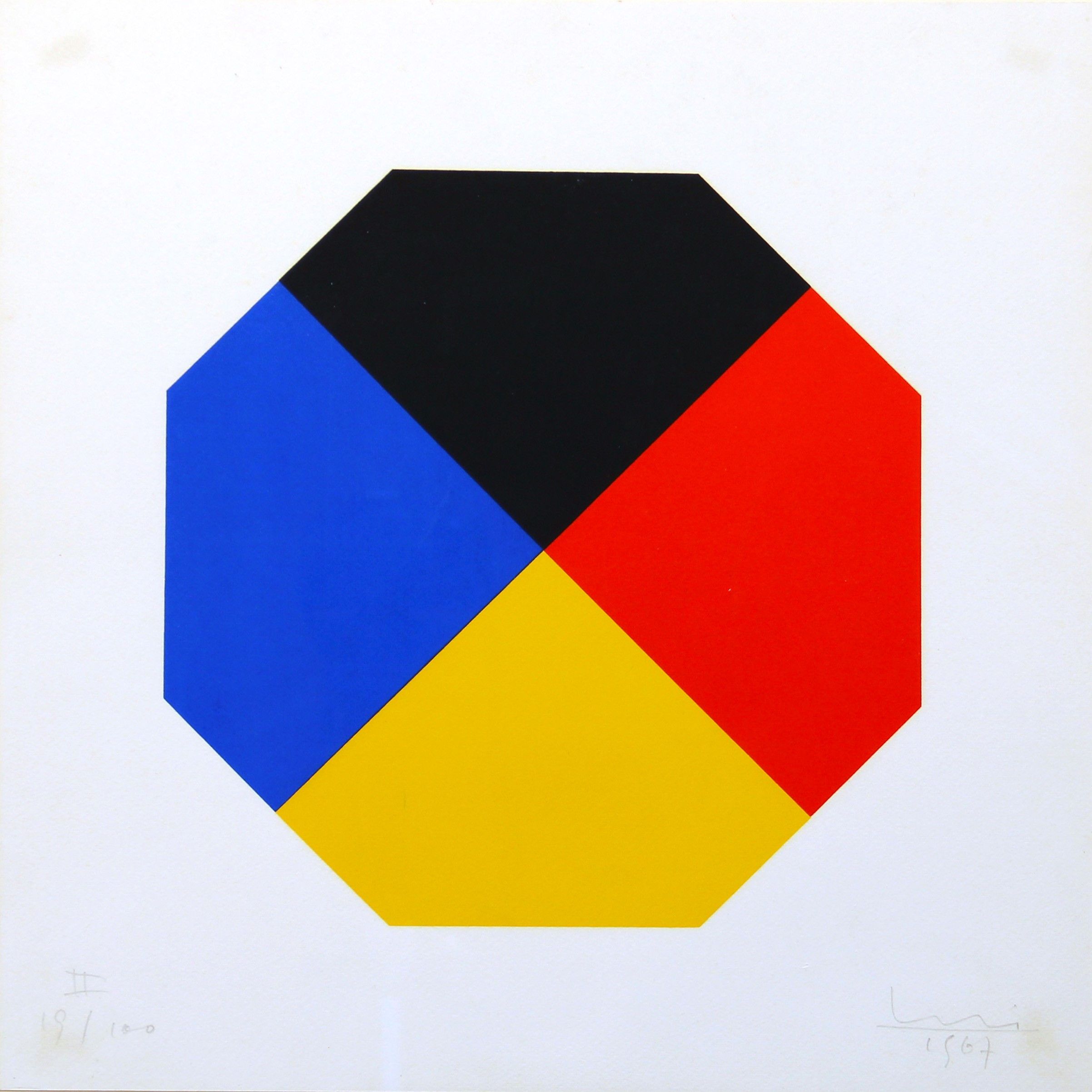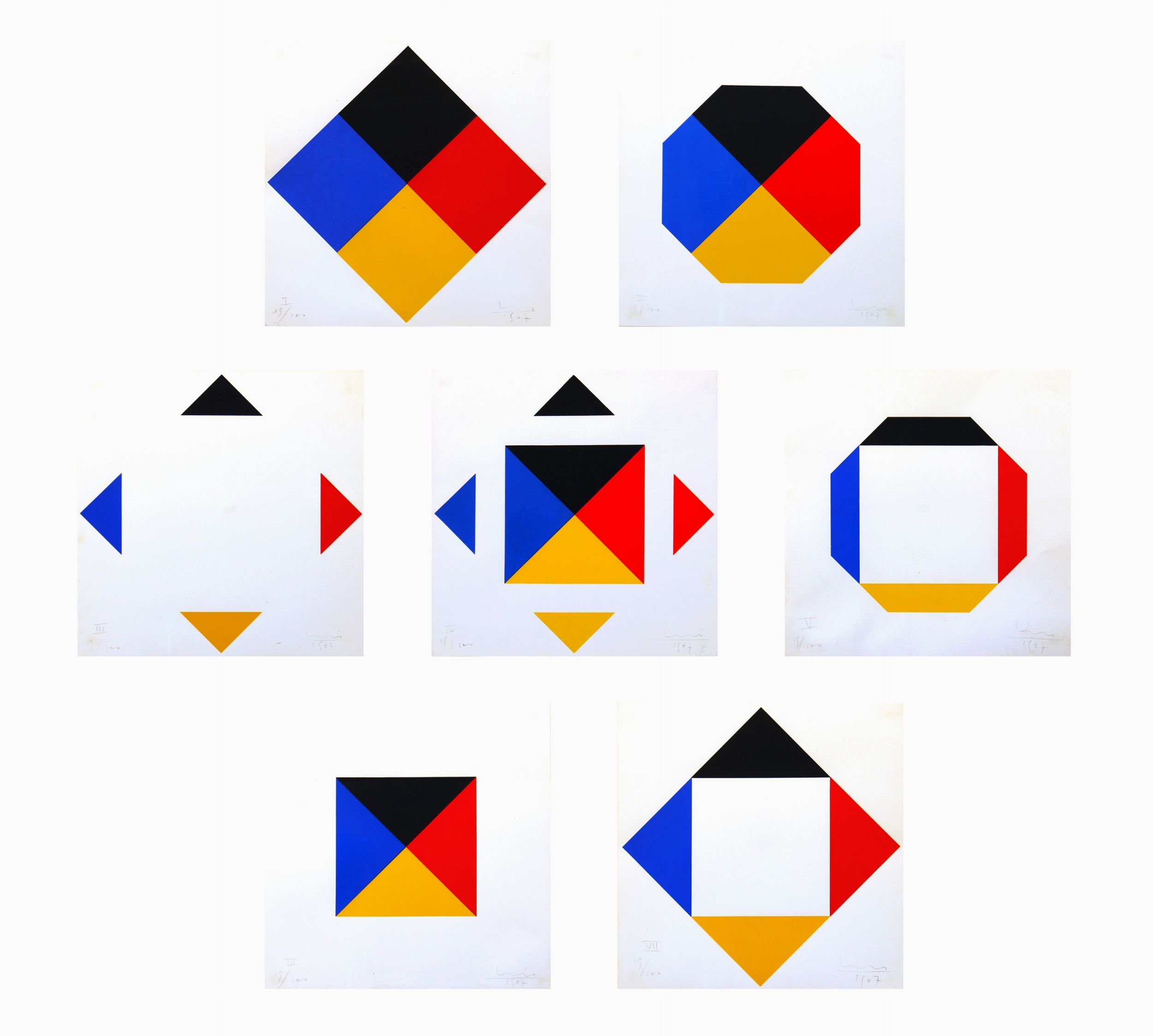 1967 Lotto composto da 7 elementi Le dimensioni fanno riferimento al singolo elemento Edizione di 100 esemplari Esemplare n. 19 Esemplare composto da 7 elementi ELEMENTO I Numerazione 'I 19/100' (in basso a sinistra) Firma, data 'Bill, 1967' (in basso a destra) ELEMENTO IINumerazione 'II 19/100' (in basso a sinistra)