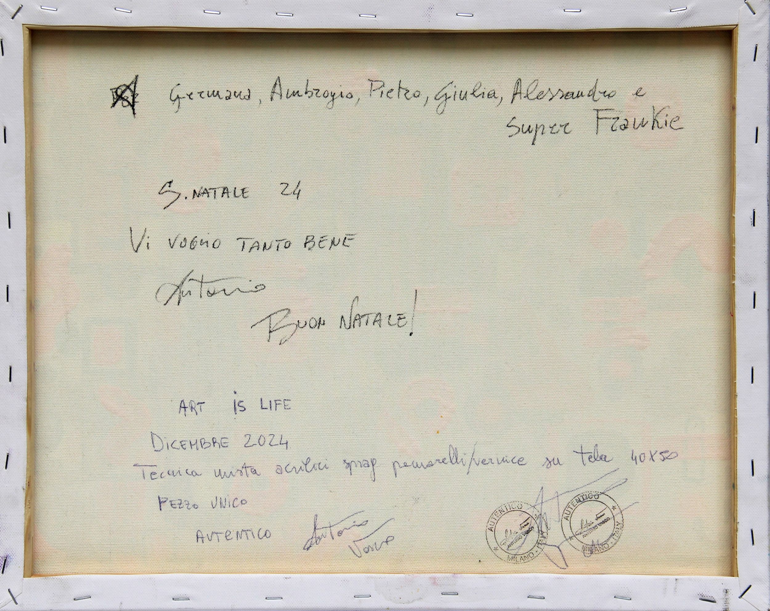 Dedica, titolo, data, tecnica, dimensioni, firma 'Art is life, dicembre 2024, tecnica mista acrilici spray pennarelli vernice su tela, 40x50, Antonio Vasco';