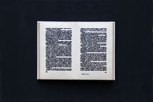 cancellature su libro applicato su tavola, cm 40x60 1972 Dedica, firma, data 'Emilio Isgrò, 1972' (al r [..]