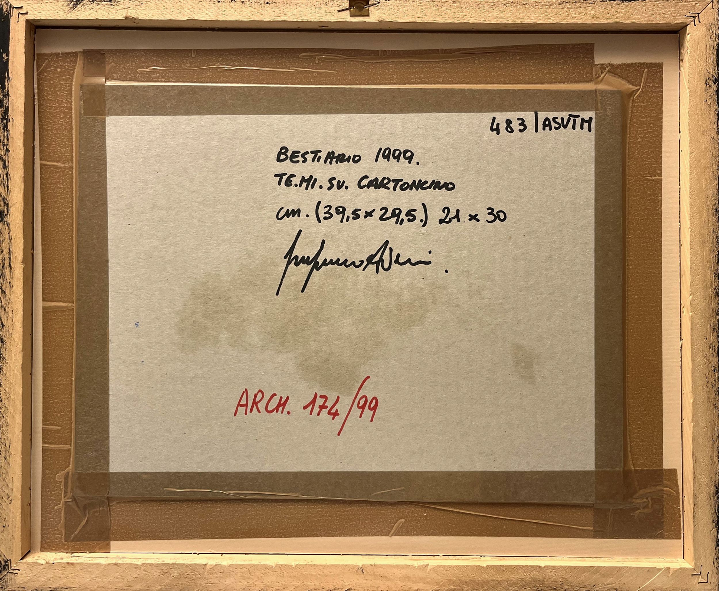 1999 Numerazione, titolo, data, tecnica, dimensioni, firma, numerazione '483/ASVTM, Bestiario, 1999, te.mi. su. cartoncino, cm. (39,5x29,5) 21x30, Gianfranco Asveri, Arch. 174/99' (al retro)