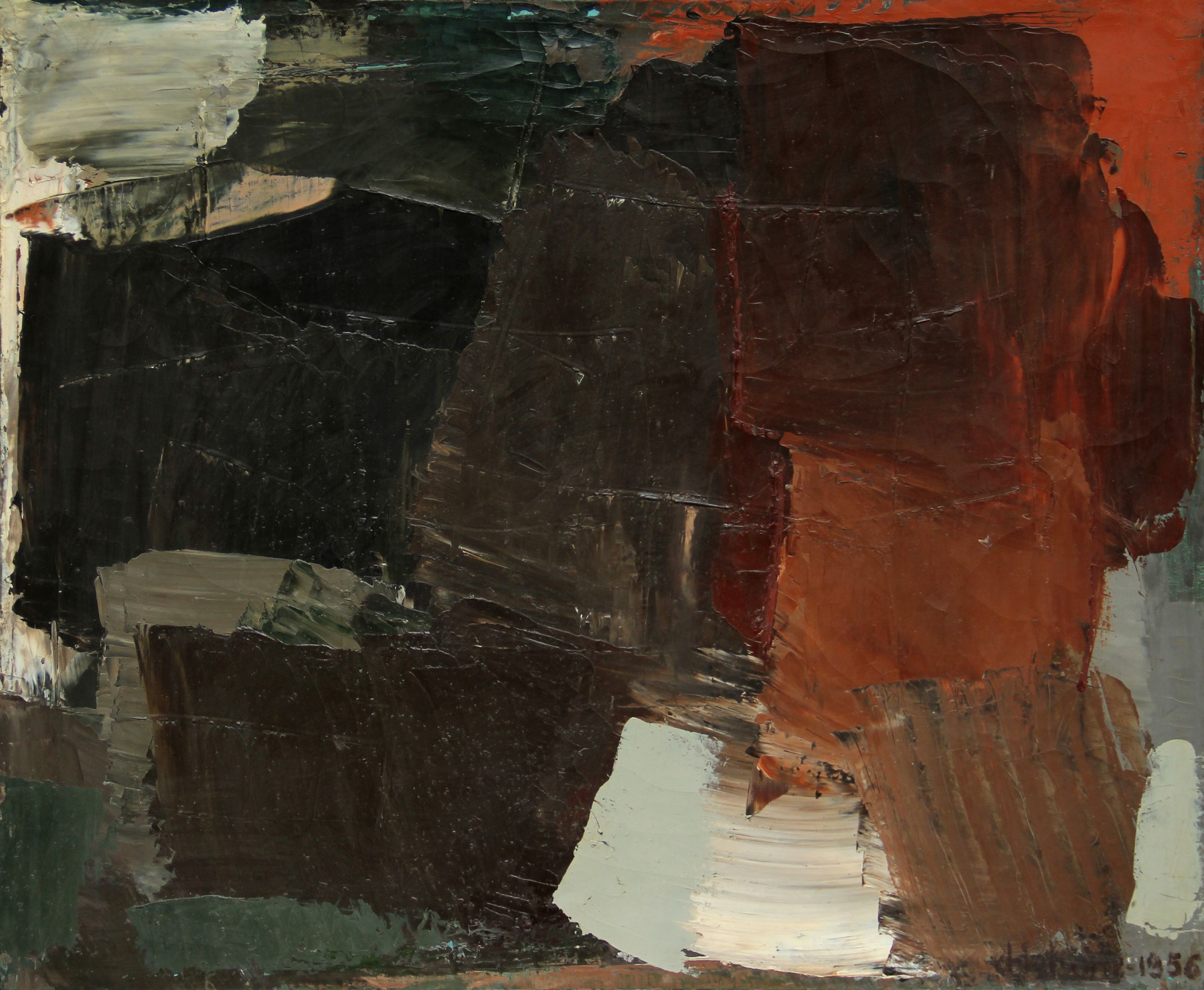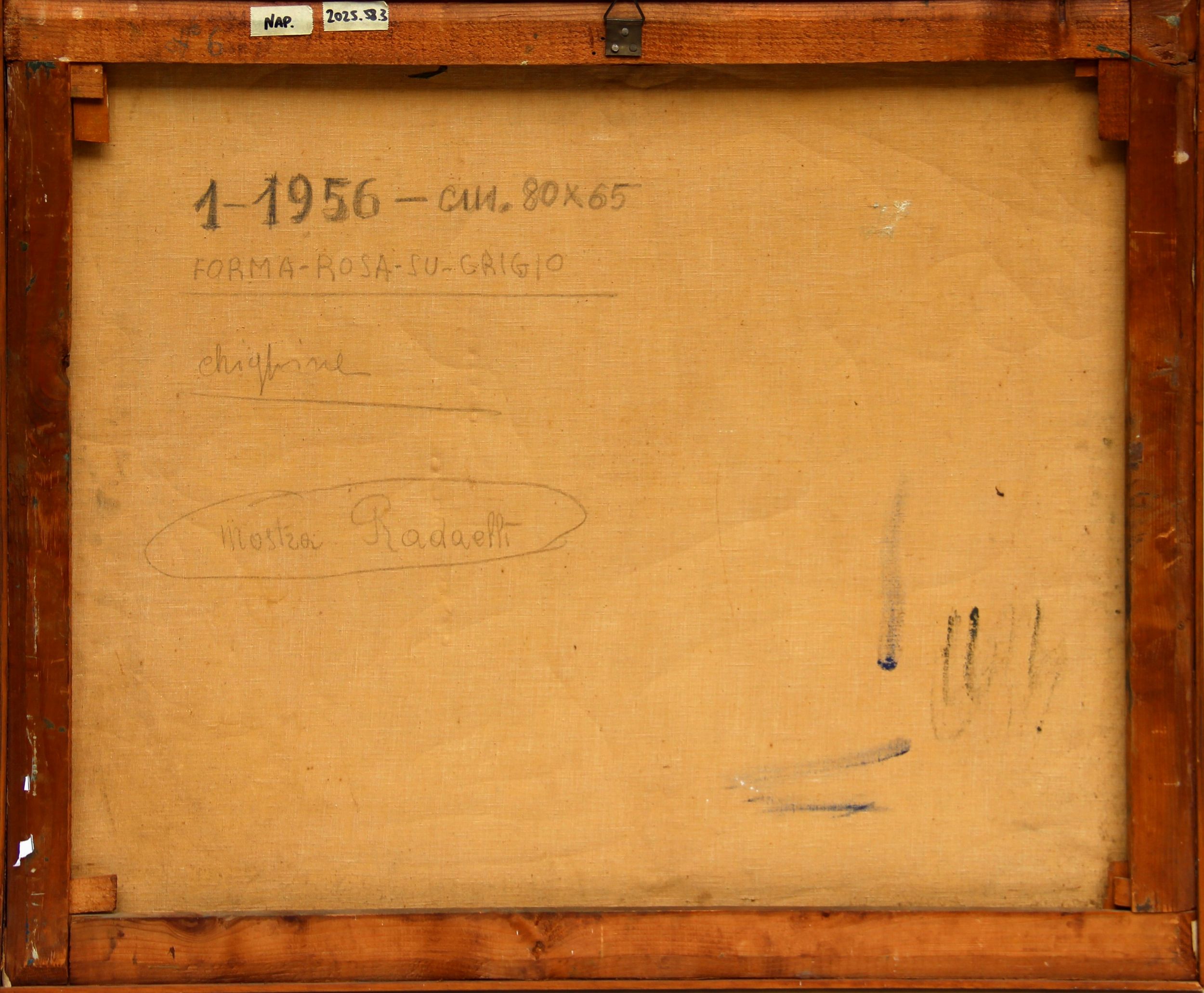 1956 Firma, data 'Chighine, 1956' (in basso a destra) Data, dimensioni, titolo, firma '1956, cm 80x65, Forma rosa su grigio, Chighine' (al retro)