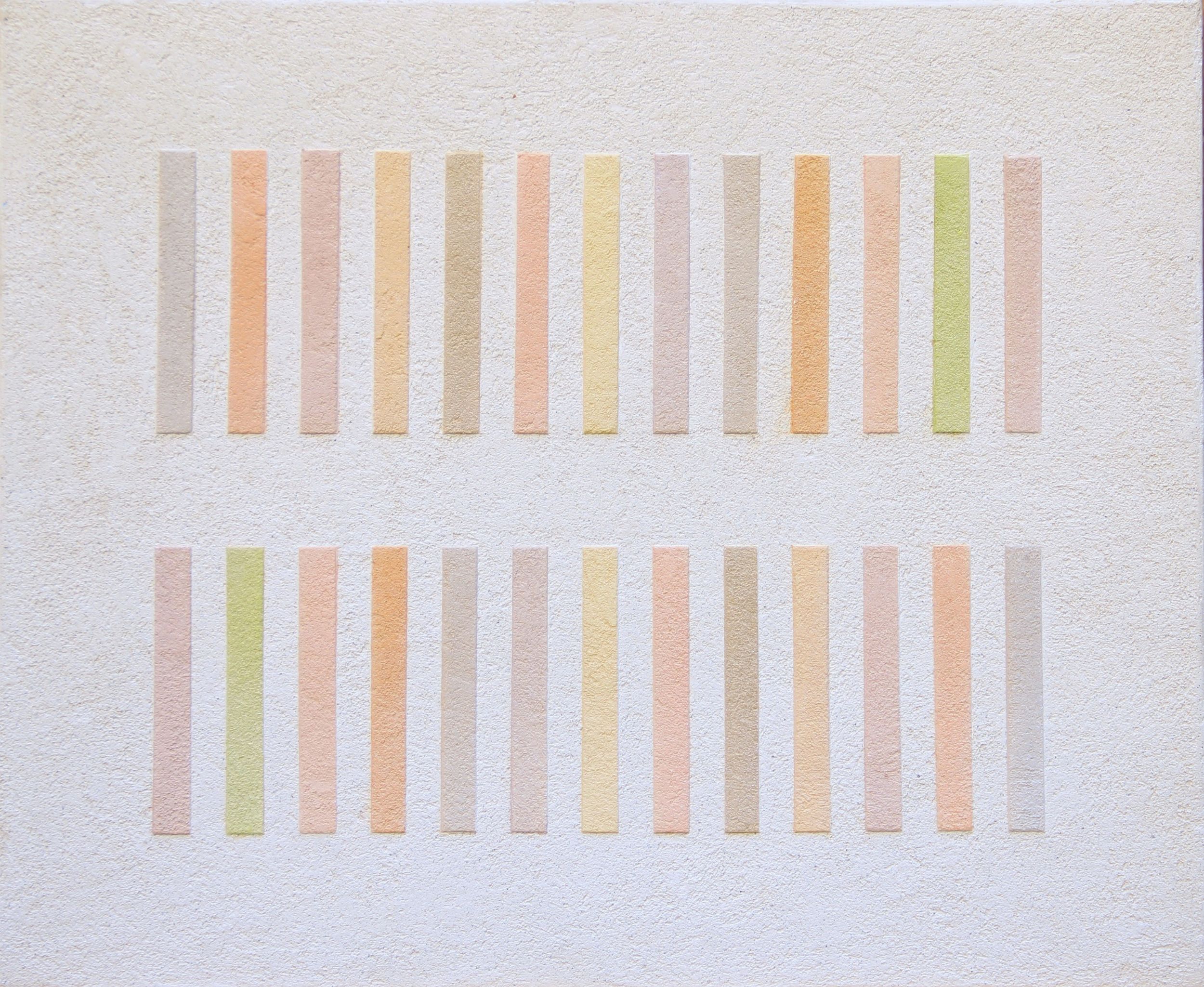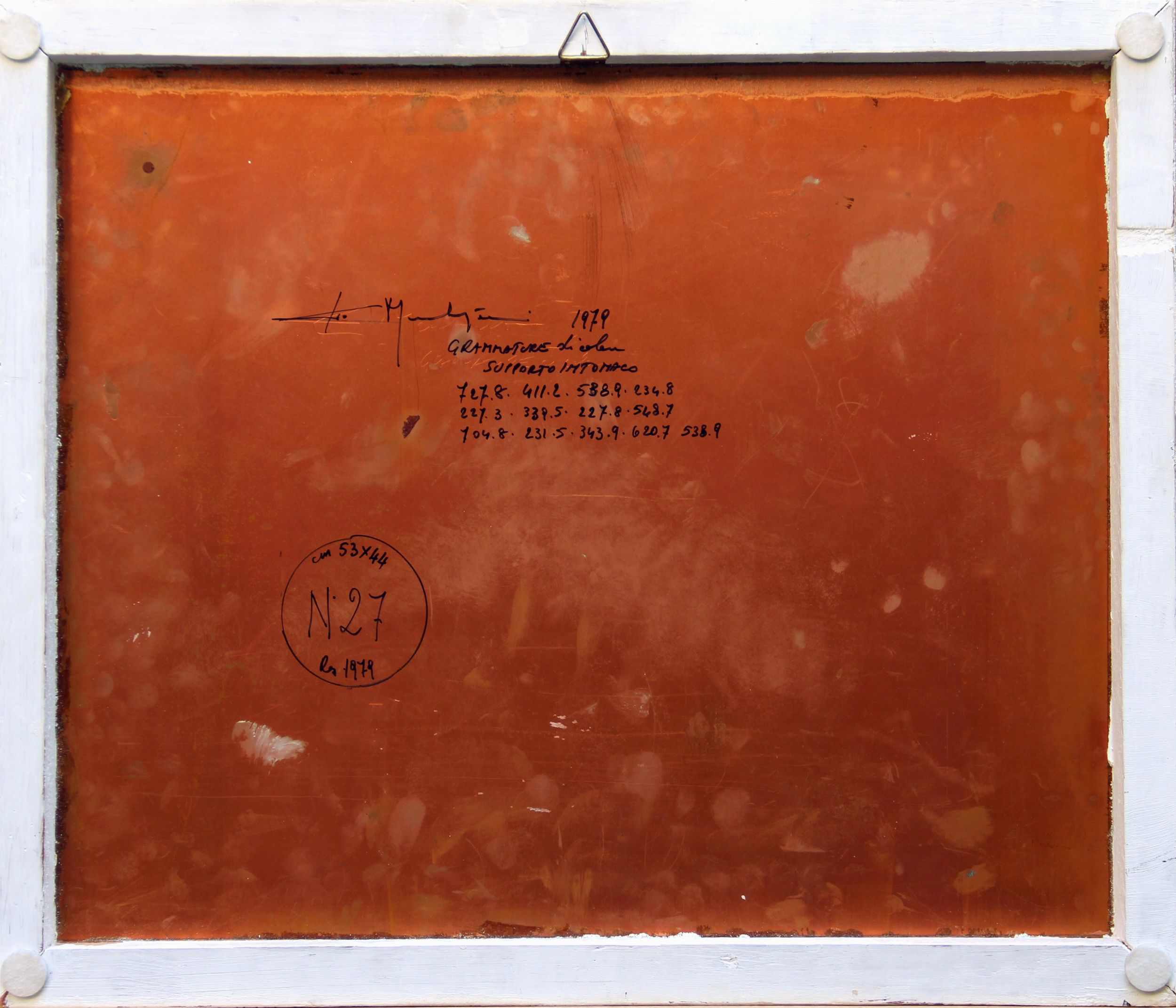 1979 Firma, data, titolo, tecnica, scritta, dimensioni, numerazione 'Elio Marchegiani, 1979, Grammature di colore, Supporto intonaco, 727.8 411.2 538.9 234.8 227.3 339.5 227.8 548.7 704.8 231.5 343.9 620.7 538.9, cm 53x44, N. 27 Reg. 1979 (al retro)