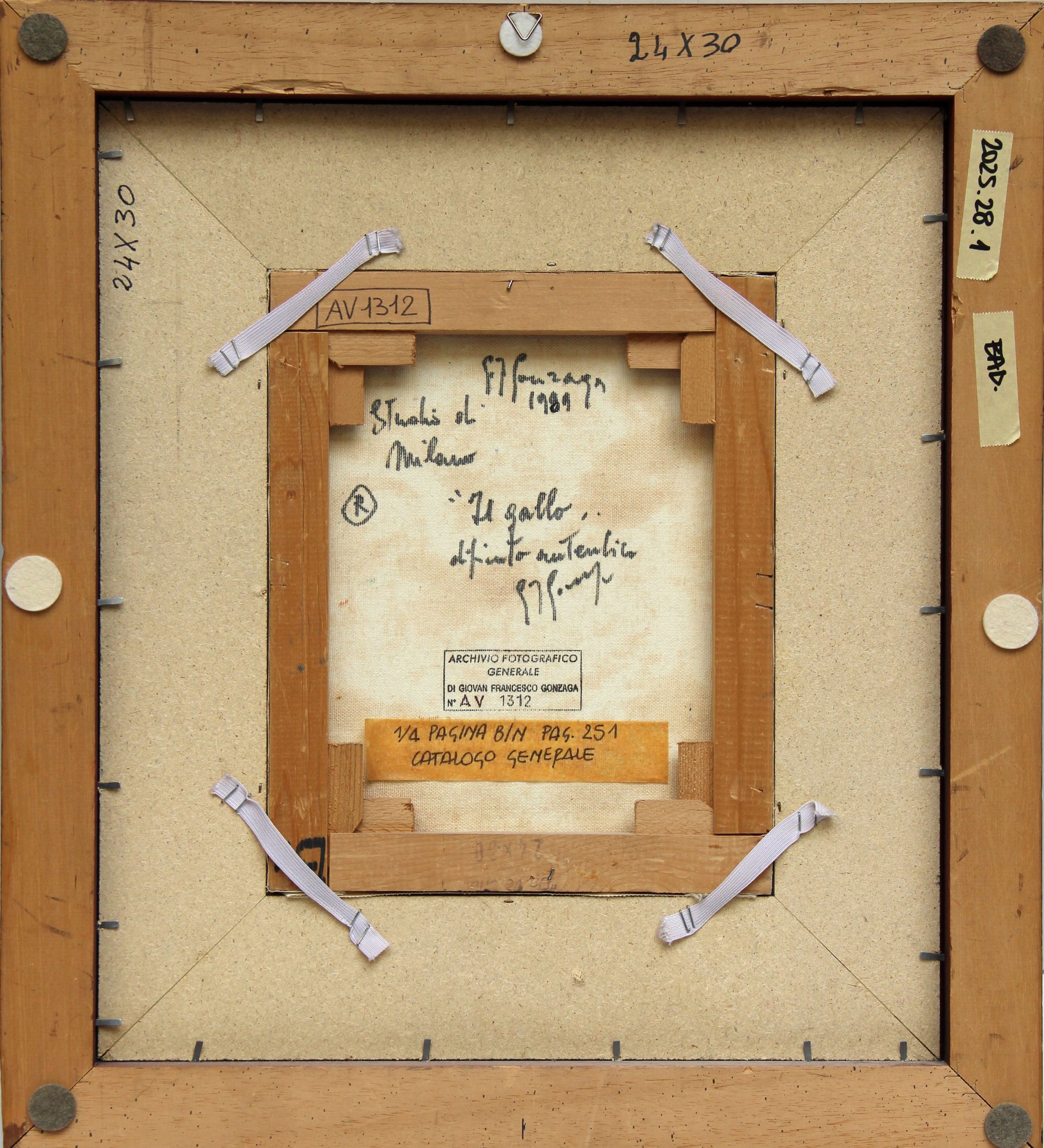 1989 Firma 'F. Gonzaga' (in basso a sinistra) Firma, data, luogo, titolo, firma 'G.F. Gonzaga, 1989, Studio di Milano, Il gallo, dipinto autentico G.F. Gonzaga'; timbro di Archivio Fotografico Generale Giovan Francesco Gonzaga, con n. 1312 (al retro)