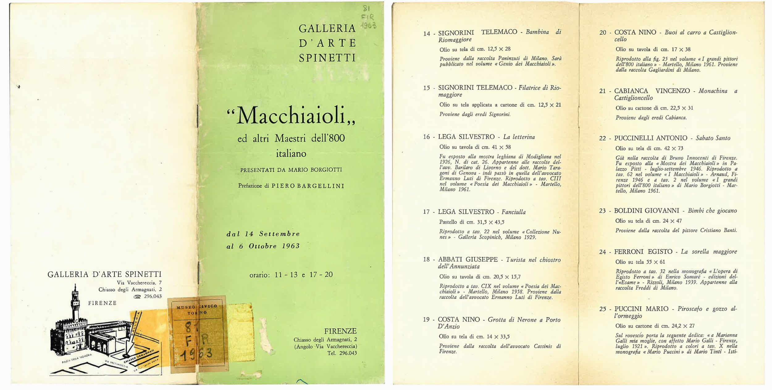 1883 Firma, data 'V.C., 1883' (in basso a sinistra) Luogo, data 'Castiglioncello, 1883'; scritta, firma di Mario Borgiotti 'Opera bellissima di Vincenzo Cabianca acquistata da me personalmente dagli eredi dell'artista, M. Borgiotti'; timbro della Galleria d'Arte Spinetti, Firenze, con firma di Italo Spinetti; scritta, firma di Silvio Cabianca 'Dipinto di Vincenzo Cabianca, mio padre, Cabianca Silvio' (al retro)