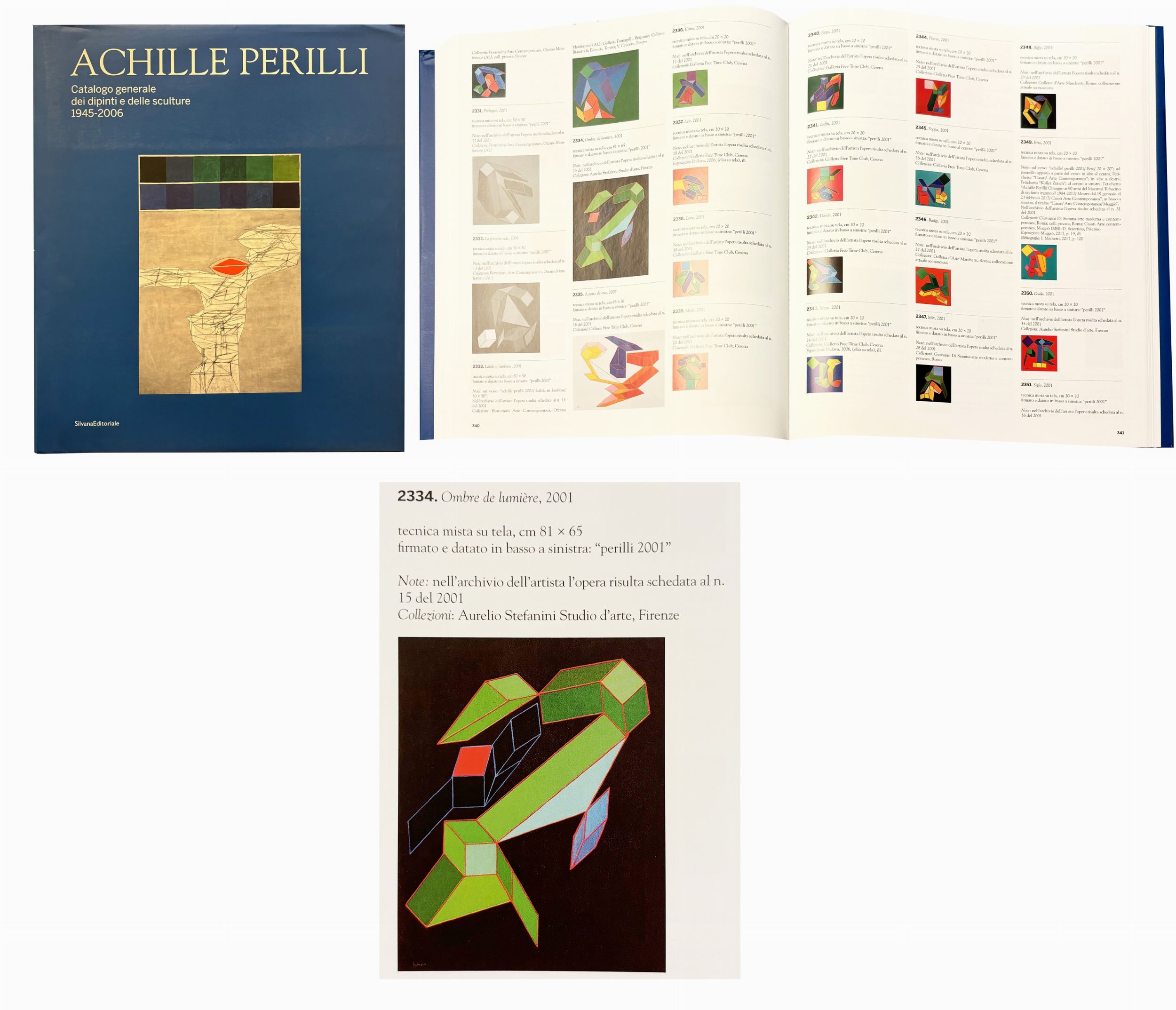 2001 Firma, data 'Perilli, 2001' (in basso a sinistra) Firma, titolo, dimensioni, data 'Achille Perilli, Ombre de Lumière, 81x56, 2001' (al retro)