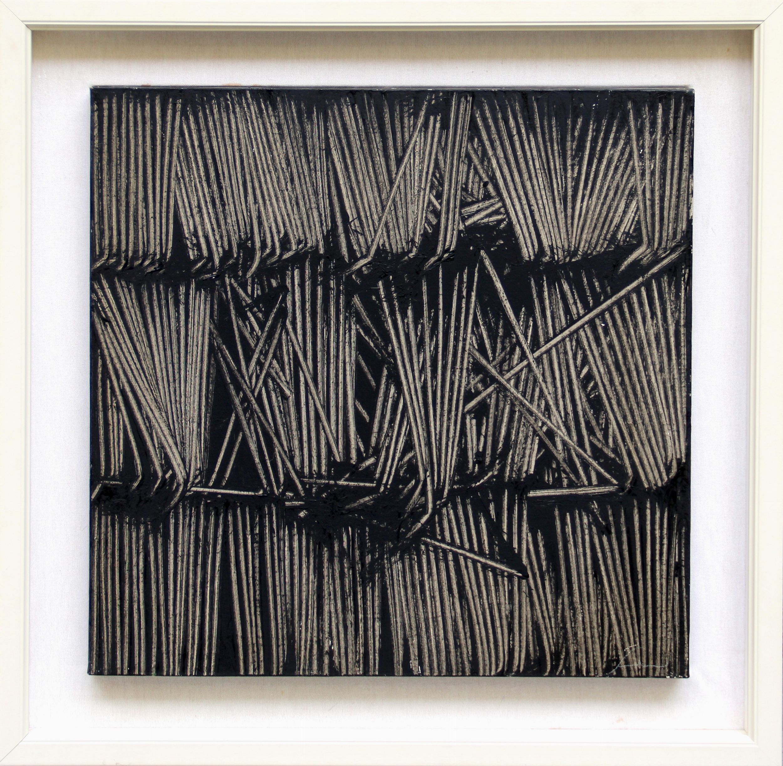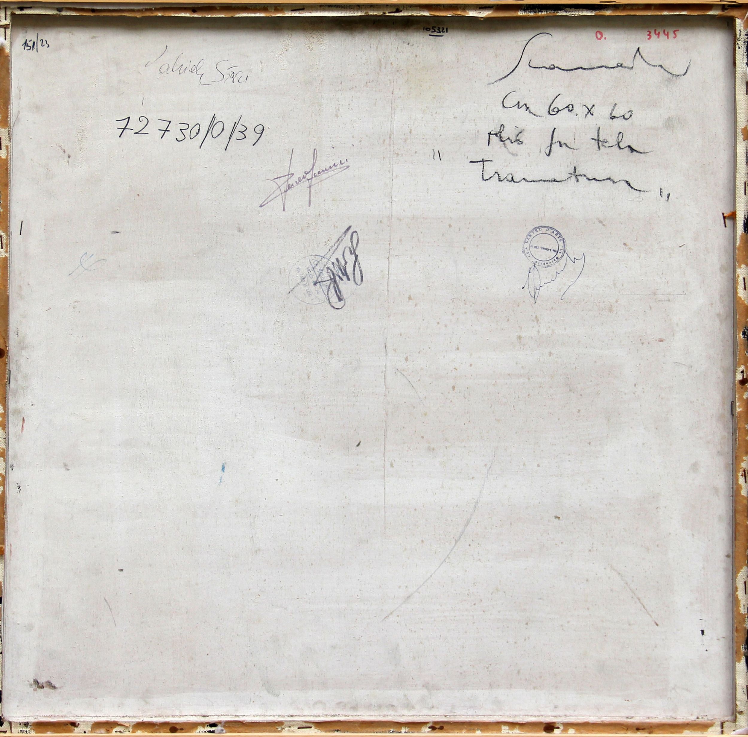 1972 Firma 'Scanavino' (in basso a destra) Firma, dimensioni, tecnica, titolo 'Scanavino, cm 60x60, olio su tela, Tramatura'; timbro di Centro d'Arte La Barcaccia, Roma; timbro di Galleria Lo Scalino, Roma (al retro)