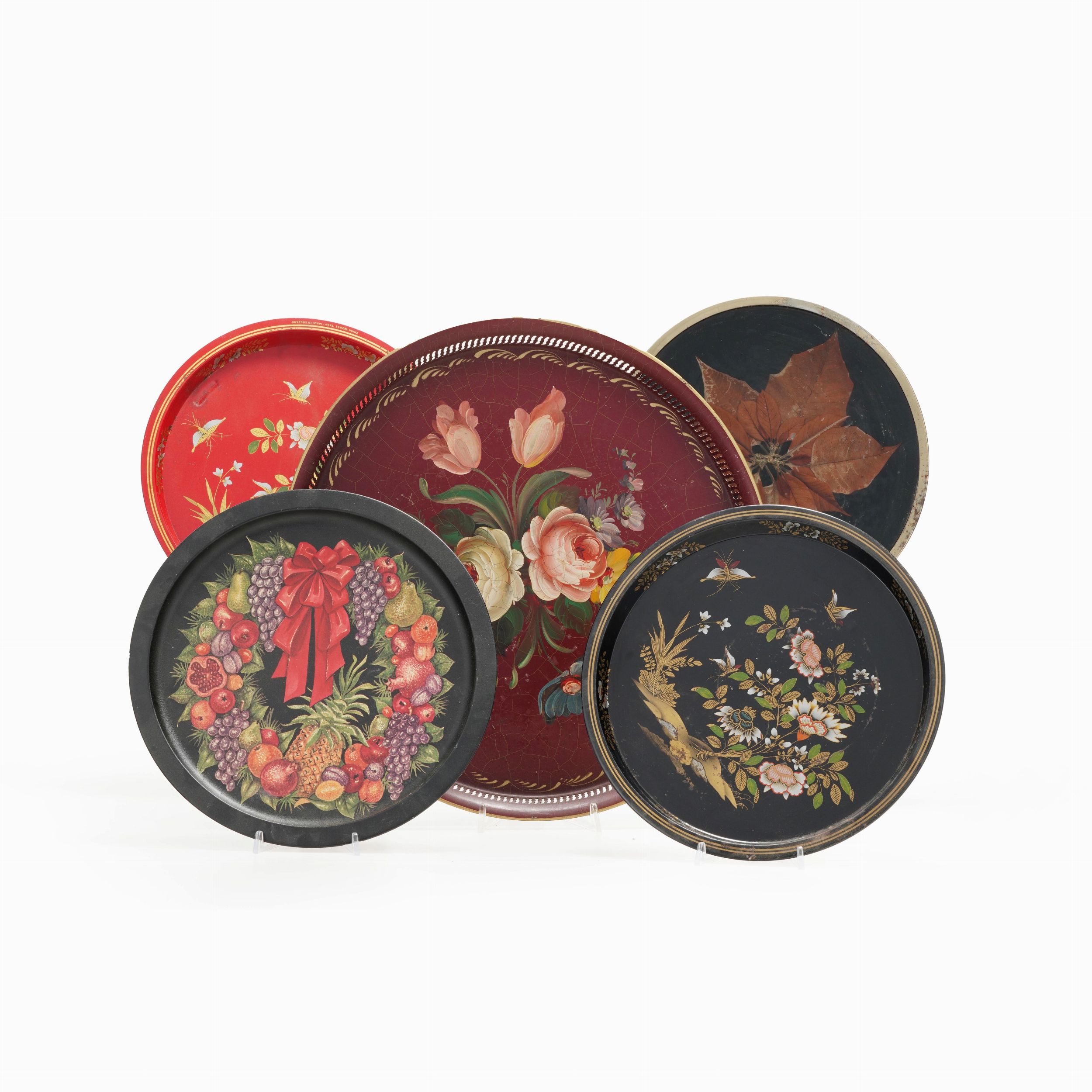 Cinque differenti vassoi in metallo dipinto. XX secolo
