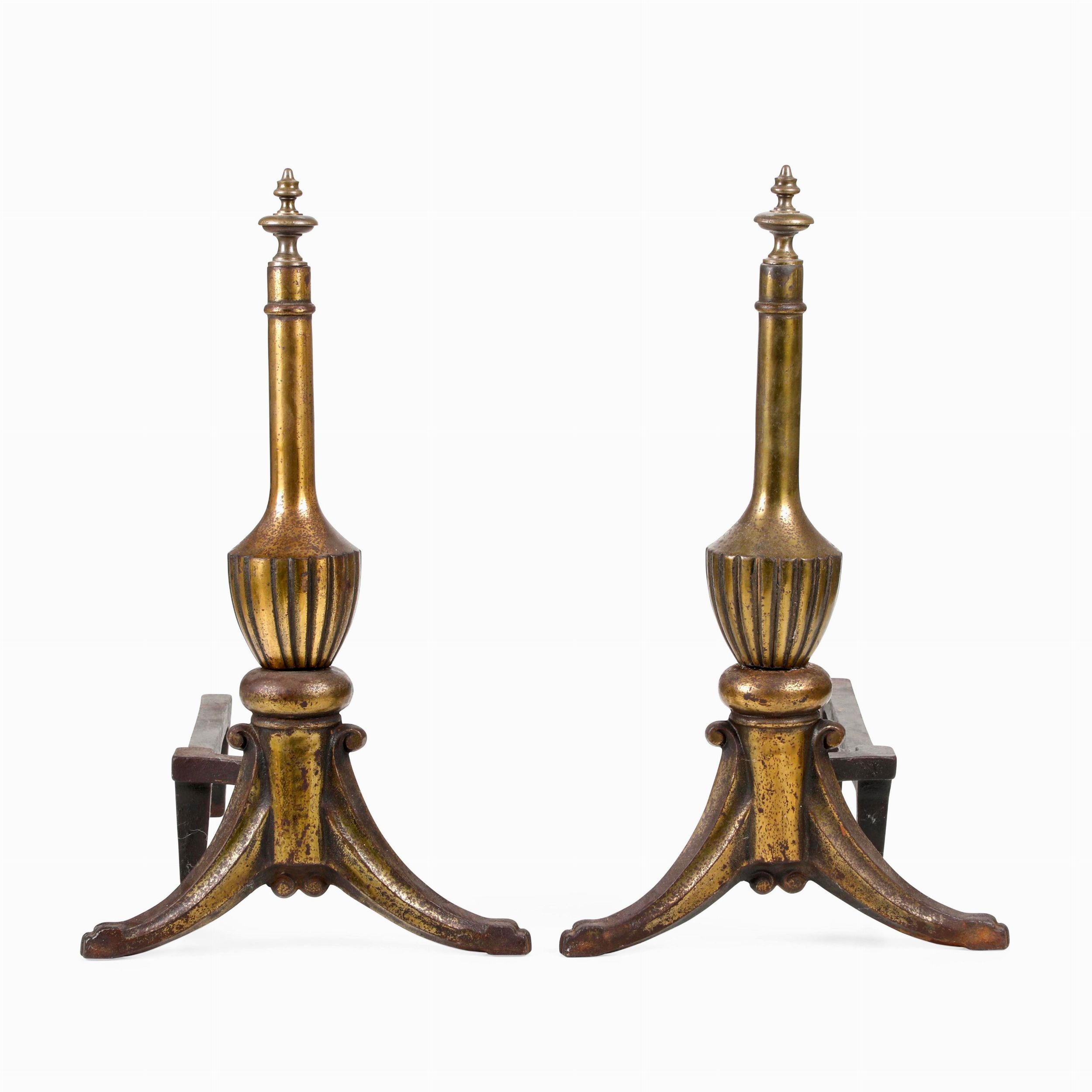 Coppia di alari in metallo patinato e dorato. XIX secolo
