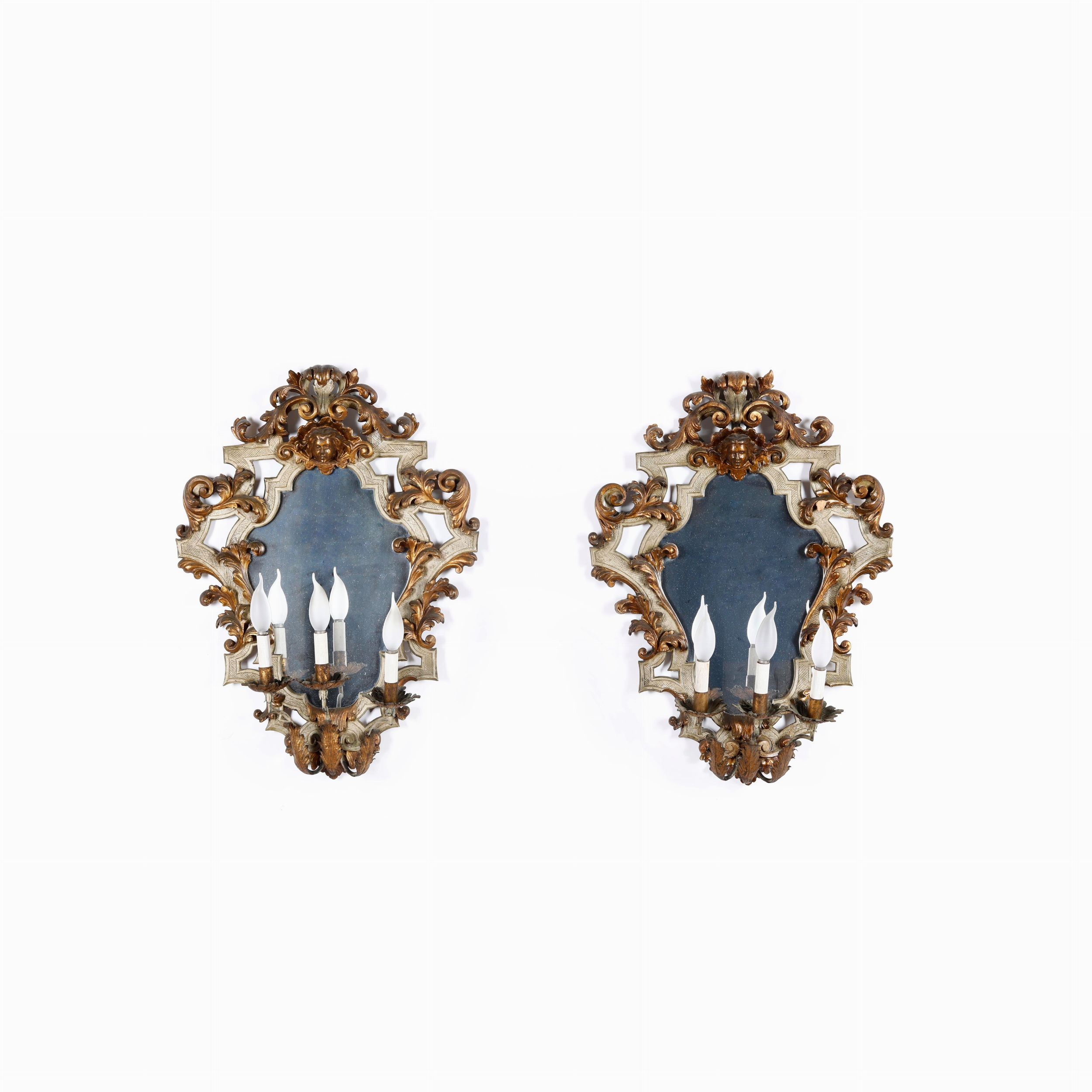Coppia di appliques in legno intagliato, traforato, laccato e dorato. XIX-XX sec [..]