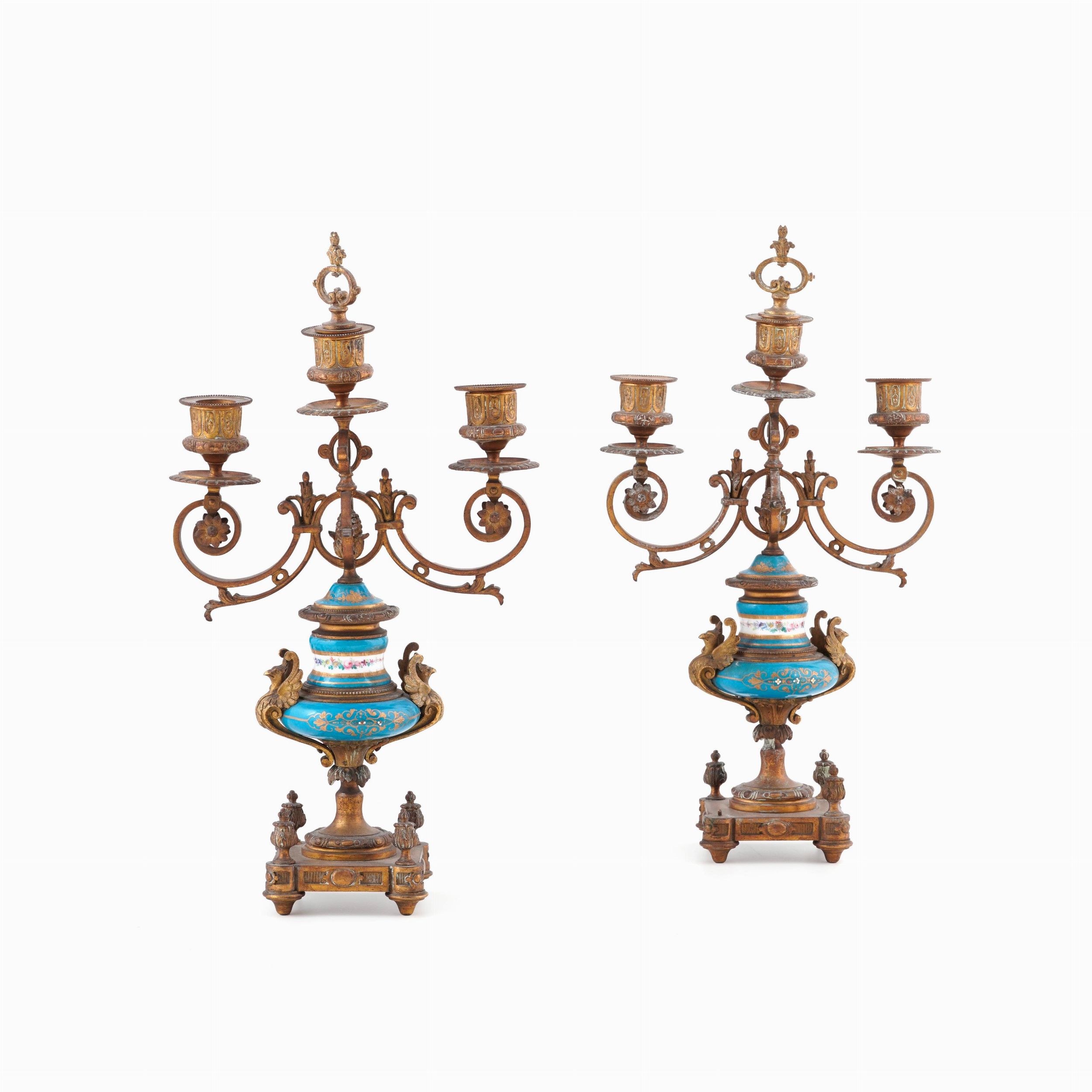 Coppia di candelieri in metallo dorato e maiolica. Francia, XIX secolo