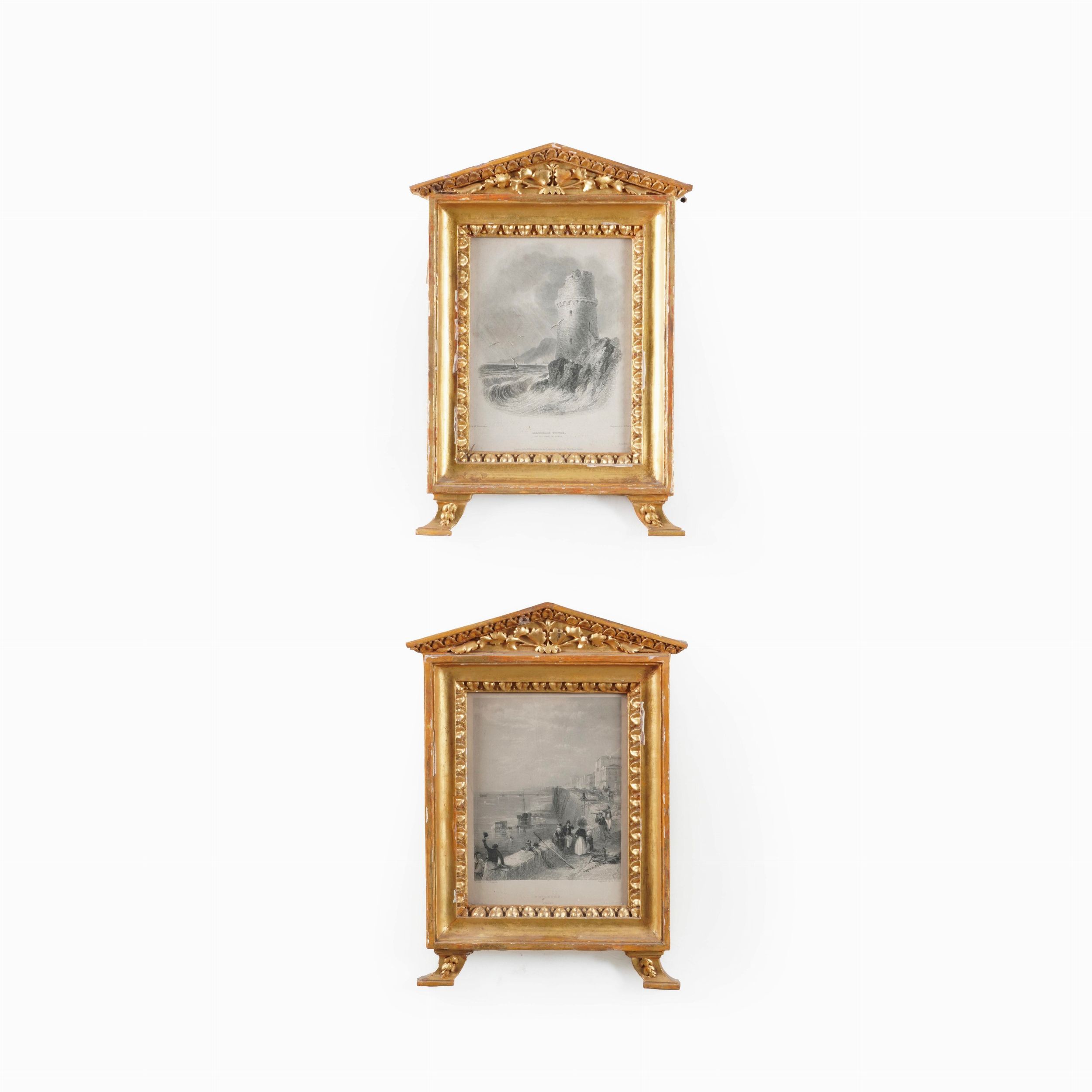 Coppie di cornici a edicola in legno intagliato e dorato. XIX secolo