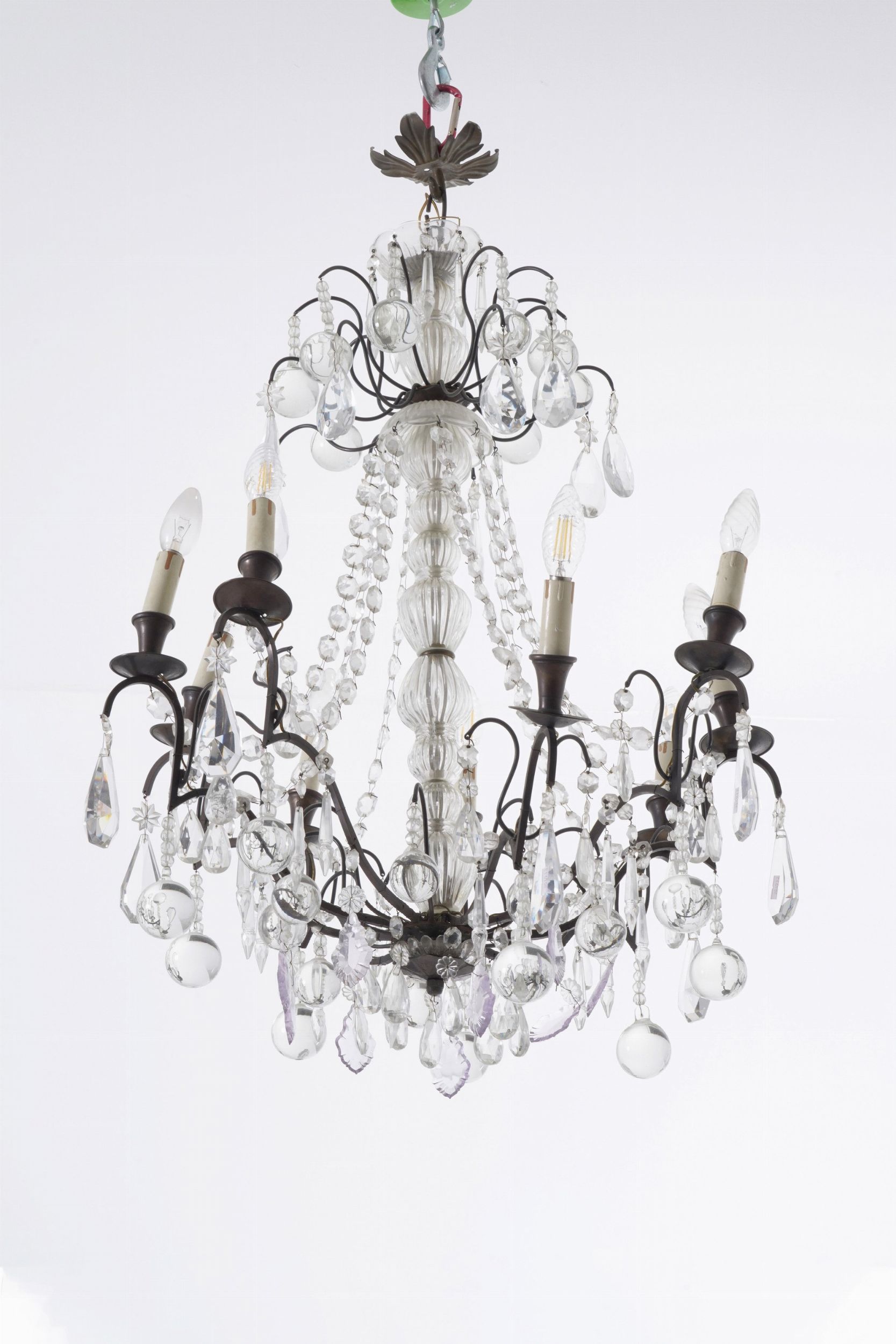 Lampadario con fusto vetro e nove bracci in metallo. XX secolo