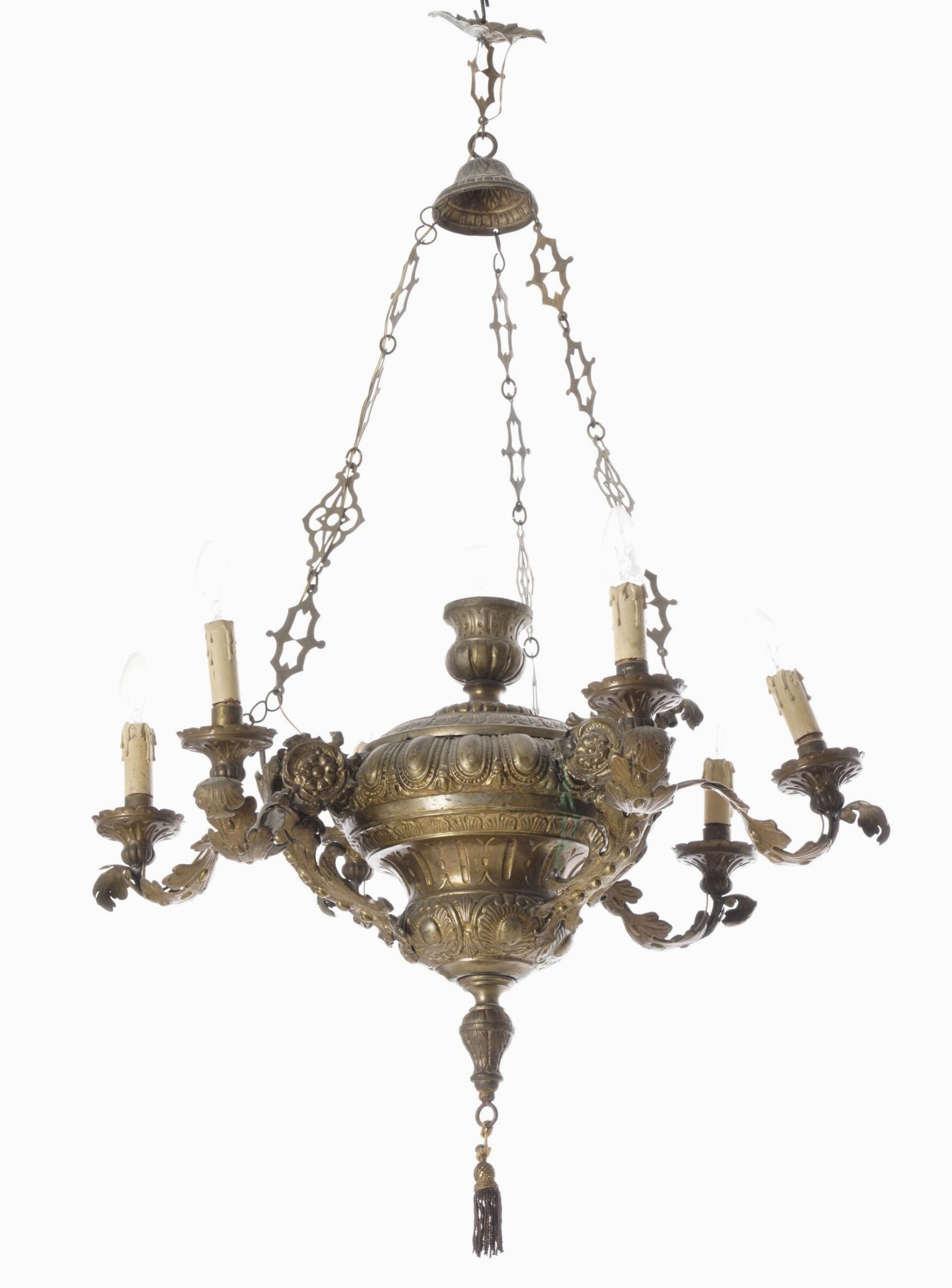 Lanterna lampadario in metallo sbalzato a sei fiamme. XVIII secolo