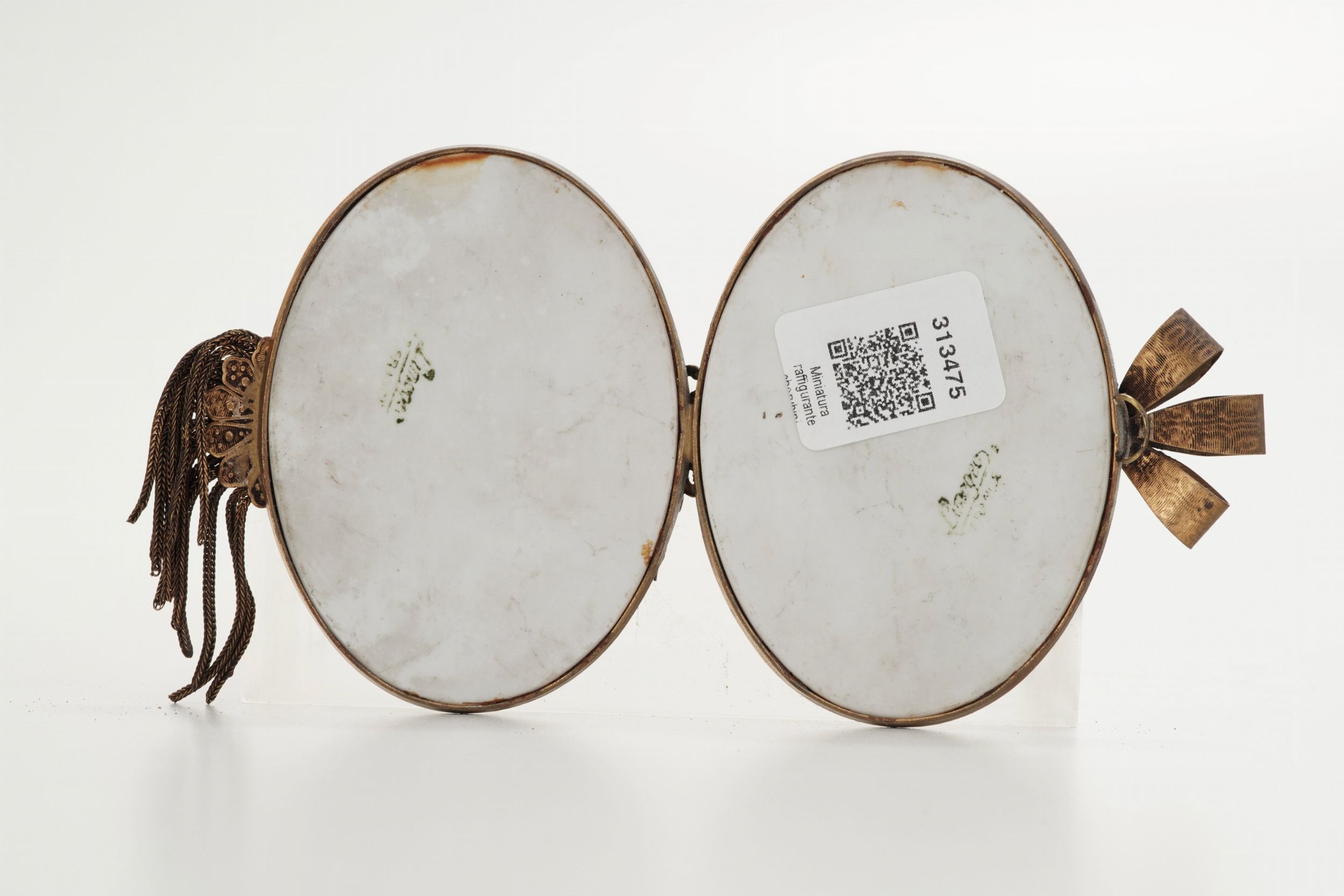 Pendente in metallo dorato con coppia di miniature in porcellana di Limoges raffiguranti [..]