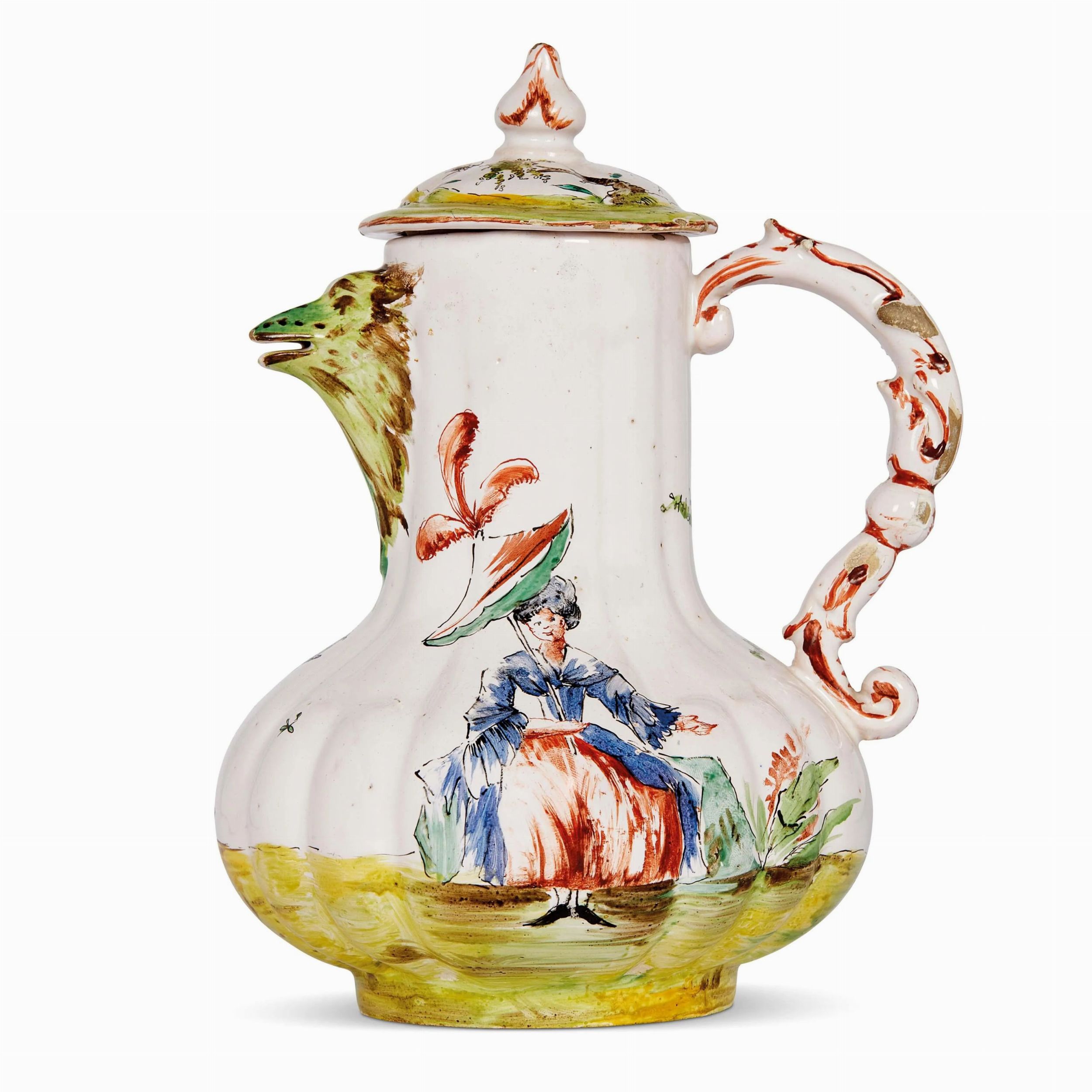 in maiolica dipinta in policromia, corpo costolato che si allarga nella parte inferiore e poggia su basso piede, dotata di coperchio mistilineo ad orlo costolato con presa a bocciolo, ansa con andamento mistilineo e versatoio a forma di testa di grifo. L’opera presenta un decoro a gran fuoco a “paesini e figure a smalto” prossimo agli esemplari prodotti dalla manifattura di Felice Clerici a Milano. Il confronto con le opere conservate al Museo del Castello Sforzesco di Milano ci porta a sottolineare una stesura più semplificata del decoro nell’opera in esame e una cromia molto più spenta, elementi questi che unitamente allo stile non paragonabile alle produzioni clericiane, e in particolare a quello di una caffettiera priva di coperchio con scena molto prossima delle collezioni del Castello Sforzesco, ci suggerisce di ritenere l’opera come prodotta da una manifattura lombarda della fine del secolo XIX. Etichetta di provenienza FLORENCE TACCANI ANTICHITÀ – MILANO sul fondo; alt. cm 22, diam. bocca cm 7, diam. piede cm 8,5