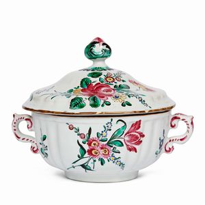 DUE MARESCIALLE, DOCCIA, MANIFATTURA GINORI, 1770 in porcellana, coerenti tra loro per forma e decoro, dipinte [..]