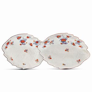COPPIA DI PIATTI A FOGLIA, MANIFATTURA DI MEISSEN, 1730 CIRCA in porcellana dipinta in policromia, modellato [..]